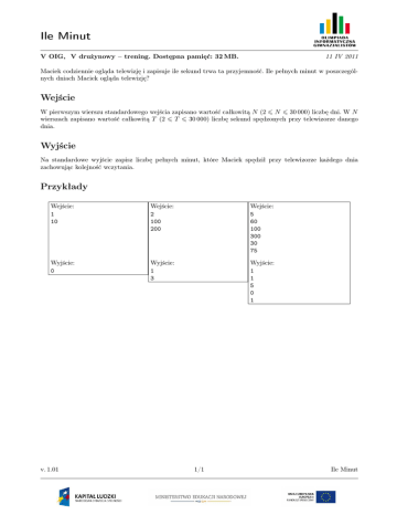 Ile Minut V OIG, V drużynowy – trening. Dostępna pamięć: 32 MB. 11 IV 2011 Maciek codziennie ogląda telewizję i zapisuje ile sekund trwa ta przyjemność. Ile pełnych minut w poszczególnych dniach Maciek ogląda telewizję? Wejście W pierwszym wierszu standardowego wejścia zapisano wartość całkowitą N (2 6 N 6 30 000) liczbę dni. W N wierszach zapisano wartość całkowitą T (2 6 T 6 30 000) liczbę sekund spędzonych przy telewizorze danego dnia. Wyjście Na standardowe wyjście zapisz liczbę pełnych minut, które Maciek spędził przy telewizorze każdego dnia zachowując kolejność wczytania. Przykłady Wejście: 1 10 Wejście: 2 100 200 Wejście: 5 60 100 300 30 75 Wyjście: 0 Wyjście: 1 3 Wyjście: 1 1 5 0 1 v. 1.01 1/1 Ile Minut