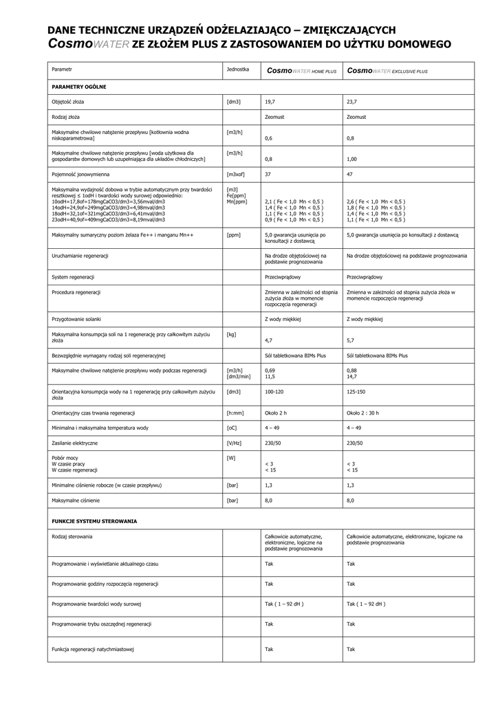 DANE TECHNICZNE URZĄDZEŃ ODŻELAZIAJĄCO – ZMIĘKCZAJĄCYCH CosmoWATER ZE ZŁOŻEM PLUS Z ZASTOSOWANIEM DO UŻYTKU DOMOWEGO Parametr Jednostka CosmoWATER HOME PLUS CosmoWATER EXCLUSIVE PLUS PARAMETRY OGÓLNE Objętość złoża [dm3] Rodzaj złoża Maksymalne chwilowe natężenie przepływu [kotłownia wodna niskoparametrowa] [m3/h] Maksymalne chwilowe natężenie przepływu [woda użytkowa dla gospodarstw domowych lub uzupełniająca dla układów chłodniczych] [m3/h] Pojemność jonowymienna [m3xof] Maksymalna wydajność dobowa w trybie automatycznym przy twardości resztkowej ≤ 1odH i twardości wody surowej odpowiednio: 10odH=17,8of=178mgCaCO3/dm3=3,56mval/dm3 14odH=24,9of=249mgCaCO3/dm3=4,98mval/dm3 18odH=32,1of=321mgCaCO3/dm3=6,41mval/dm3 23odH=40,9of=409mgCaCO3/dm3=8,19mval/dm3 [m3] Fe[ppm] Mn[ppm] Maksymalny sumaryczny poziom żelaza Fe++ i manganu Mn++ [ppm] 19,7 23,7 Zeomust Zeomust 0,6 0,8 0,8 1,00 37 47 2,1 1,4 1,1 0,9 ( ( ( ( Fe Fe Fe Fe < < < < 1,0 1,0 1,0 1,0 Mn Mn Mn Mn < < < < 0,5 0,5 0,5 0,5 ) ) ) ) 2,6 1,8 1,4 1,1 ( ( ( ( Fe Fe Fe Fe < < < < 1,0 1,0 1,0 1,0 Mn Mn Mn Mn < < < < 0,5 0,5 0,5 0,5 ) ) ) ) 5,0 gwarancja usunięcia po konsultacji z dostawcą 5,0 gwarancja usunięcia po konsultacji z dostawcą Uruchamianie regeneracji Na drodze objętościowej na podstawie prognozowania Na drodze objętościowej na podstawie prognozowania System regeneracji Przeciwprądowy Przeciwprądowy Procedura regeneracji Zmienna w zależności od stopnia zużycia złoża w momencie rozpoczęcia regeneracji Zmienna w zależności od stopnia zużycia złoża w momencie rozpoczęcia regeneracji Przygotowanie solanki Z wody miękkiej Z wody miękkiej 4,7 5,7 Sól tabletkowana BIMs Plus Sól tabletkowana BIMs Plus Maksymalna konsumpcja soli na 1 regenerację przy całkowitym zużyciu złoża [kg] Bezwzględnie wymagany rodzaj soli regeneracyjnej Maksymalne chwilowe natężenie przepływu wody podczas regeneracji [m3/h] [dm3/min] 0,69 11,5 0,88 14,7 Orientacyjna konsumpcja wody na 1 regenerację przy całkowitym zużyciu złoża [dm3] 100-120 125-150 Orientacyjny czas trwania regeneracji [h:mm] Około 2 h Około 2 : 30 h Minimalna i maksymalna temperatura wody [oC] 4 – 49 4 – 49 Zasilanie elektryczne [V/Hz] 230/50 230/50 Pobór mocy W czasie pracy W czasie regeneracji [W] <3 < 15 <3 < 15 Minimalne ciśnienie robocze (w czasie przepływu) [bar] 1,3 1,3 Maksymalne ciśnienie [bar] 8,0 8,0 Rodzaj sterowania Całkowicie automatyczne, elektroniczne, logiczne na podstawie prognozowania Całkowicie automatyczne, elektroniczne, logiczne na podstawie prognozowania Programowanie i wyświetlanie aktualnego czasu Tak Tak Programowanie godziny rozpoczęcia regeneracji Tak Tak Programowanie twardości wody surowej Tak ( 1 – 92 dH ) Tak ( 1 – 92 dH ) Programowanie trybu oszczędnej regeneracji Tak Tak Funkcja regeneracji natychmiastowej Tak Tak FUNKCJE SYSTEMU STEROWANIA Funkcja regeneracji o najbliższej zaprogramowanej godzinnie Tak Tak Funkcja oczyszczania złoża w przypadku użytkowania wody o zwiększonej ilości zawiesiny Nie Tak Programowanie automatycznej regeneracji w przypadku braku poboru wody Nie Tak Automatyczna regeneracja w przypadku braku poboru wody Tak ( zaprogramowana fabrycznie ) Tak ( programowalna 1 – 15 dni ) Alarm niskiego poziomu soli Nie Tak Kontrola poziomu soli Nie Tak Wyświetlanie aktualnego poziomu soli Nie Tak Wskaźnik przepływu wody uzdatnionej Nie Tak Serwisowy licznik przepływającej wody Nie Tak WYMIARY Średnica przyłącza [cal] 1” gwint zewnętrzny 1” gwint zewnętrzny Wysokość zbiornika soli [mm] 1022 1022 Średnica zbiornika żywicy [mm] 210 235 Wysokość zbiornika żywicy [mm] 1025 1025 Wysokość przyłączy we/wy [mm] 1045 1045 Wysokość całkowita [mm] 1150 1213 Głębokość [mm] 495 495 Głębokość z zaworem „by-pass” [mm] 565 565 Szerokość [mm] 419 419 Odległość wejście/wyjście [mm] 86 86 Pojemność zbiornika soli [dm3] 90 85 O mocy < 500 kW; surowiec musi stanowić może woda z podwyższoną zawartością żelaza i manganu – gwarancja usunięcia po konsultacji z dostawcą; przed urządzeniem należy zastosować filtr wstępny, mechaniczny O mocy < 1000 kW; surowiec musi stanowić woda z podwyższoną zawartością żelaza i manganu – gwarancja usunięcia po konsultacji z dostawcą; przed urządzeniem należy zastosować filtr wstępny, mechaniczny; zaleca się zastosowanie dodatkowo urządzenia dozującego Dotech WZ25CH80 O mocy < 500 kW; surowiec musi stanowić może woda z podwyższoną zawartością żelaza i manganu – gwarancja usunięcia po konsultacji z dostawcą; przed urządzeniem należy zastosować filtr wstępny, mechaniczny O mocy < 1000 kW; surowiec musi stanowić woda z podwyższoną zawartością żelaza i manganu – gwarancja usunięcia po konsultacji z dostawcą; przed urządzeniem należy zastosować filtr wstępny, mechaniczny; zaleca się zastosowanie dodatkowo urządzenia dozującego Dotech WZ25CH80 ZASTOSOWANIE Na uzupełnianiu kotłowni wodnych niskoparametrowych