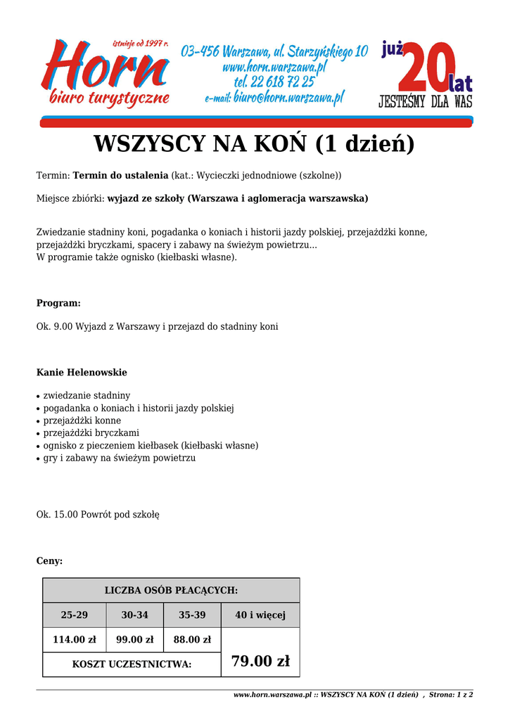 WSZYSCY NA KOŃ (1 dzień) Termin: Termin do ustalenia (kat.: Wycieczki jednodniowe (szkolne)) Miejsce zbiórki: wyjazd ze szkoły (Warszawa i aglomeracja warszawska) Zwiedzanie stadniny koni, pogadanka o koniach i historii jazdy polskiej, przejażdżki konne, przejażdżki bryczkami, spacery i zabawy na świeżym powietrzu... W programie także ognisko (kiełbaski własne). Program: Ok. 9.00 Wyjazd z Warszawy i przejazd do stadniny koni Kanie Helenowskie ● ● ● ● ● ● zwiedzanie stadniny pogadanka o koniach i historii jazdy polskiej przejażdżki konne przejażdżki bryczkami ognisko z pieczeniem kiełbasek (kiełbaski własne) gry i zabawy na świeżym powietrzu Ok. 15.00 Powrót pod szkołę Ceny: LICZBA OSÓB PŁACĄCYCH: 25-29 30-34 35-39 114.00 zł 99.00 zł 88.00 zł KOSZT UCZESTNICTWA: 40 i więcej 79.00 zł www.horn.warszawa.pl :: WSZYSCY NA KOŃ (1 dzień) , Strona: 1 z 2 Uwagi: Cena zawiera: * Transport autokarem klasy * (Mercedes, Bova, Setra...) ze wszystkimi opłatami drogowymi, parkingowymi itp., * Obsługa pilocka i przewodnicka na trasie wycieczki i w zwiedzanych obiektach, * Bilety wstępów do zwiedzanych obiektów wg programu * 3 – 4 miejsca bezpłatne dla opiekunów * ubezpieczenie NNW uczestników wycieczki i opiekunów Cena nie zawiera: * Wyżywienia (możliwe zorganizowanie obiadu) w cenie 19 zł od osoby. Zgłoszenia: tel. 22 618 72 25, kom. 609 462 660, e-mail: [email protected] www.horn.warszawa.pl :: WSZYSCY NA KOŃ (1 dzień) , Strona: 2 z 2