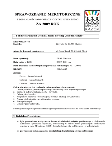 SPRAWOZDANIE MERYTORYCZNE Z DZIAŁALNOŚCI ORGANIZACJI POŻYTKU PUBLICZNEGO ZA 2009 ROK 1. Fundacja Fundusz Lokalny Ziemi Płockiej „Młodzi Razem” KRS 0000216768 Siedziba: Grzybów ½, 09-533 Słubice Adres do doręczeń pocztowych: ul. Stary Rynek 20, 09-400, Płock Data rejestracji: 09.09. 2004 rok Data wpisu w KRS: 09.09. 2004 rok Data uzyskania statusu Organizacji Pożytku Publicznego: 30.11.2005 r REGON: 611426482 Zarząd: Prezes Iwona Marczak Członek Hanna Stańczyk Członek Dariusz Winiarski Celem statutowym jest realizacja zadań publicznych w zakresie: 1. Ochrony zdrowia, pomocy społecznej i rehabilitacji osób niepełnosprawnych. 2. Edukacji, kultury, tradycji, sportu i turystyki. 3. Ochrony środowiska. 4. Programów naukowo – badawczych, oświaty, edukacji i wychowania. 5. Poprawy infrastruktury cywilizacyjnej regionu. 6. Prac społecznych. 7. Ochrony praw człowieka. Fundacja realizuje swoje cele na rzecz ogółu społeczności zwłaszcza na rzecz dzieci i młodzieży. 2. Działalność statutowa: a) była prowadzona wyłącznie w formie działalności pożytku publicznego – obejmowała działalność społecznie użyteczną prowadzoną w sferze zadań publicznych określonych w ustawie z dn. 24 kwietnia 2003r. działalności pożytku publicznego i o wolontariacie b) prowadzona była na zasadzie nieodpłatnej działalności pożytku publicznego I. NIEODPŁATNA działalność pożytku publicznego: Fundacja w swoich działaniach skupia się na wyszukiwaniu i wspieraniu inicjatyw realizowanych przez lokalnych liderów oraz kształceniu liderów w duchu idei zrównoważonego rozwoju. Tworzymy partnerstwo z samorządem powiatowym, jednostkami samorządowymi, organizacjami pozarządowymi i lokalnym biznesem, dlatego przez cały czas rozszerzamy zakres naszej pracy. W kształtowaniu kultury lokalnej bardzo ważna jest idea współpracy, integracja społeczna i idea dobra wspólnego. Dlatego bardzo ważne dla nas jest angażowanie wielu partnerów, których rola polega na pokazaniu, że w naszym środowisku tkwi wielki potencjał kulturotwórczy, tak łatwy do zniszczenia, chociażby poprzez zaniedbanie. Partnerstwo nawiązuje do tworzenia lokalnych więzi społecznych poprzez nawiązywanie do bogatej historii regionu płockiego oraz promocji w skali ogólnopolskiej poprzez ukazywanie twórczości regionalnej. W roku 2009 zrealizowaliśmy następujące projekty: 1. My dla regionu. Okres realizacji: 15 kwietnia do 5 grudnia 2009r. Finansowanie: Samorząd Województwa Mazowieckiego – 18 000, 00zł. Starostwo Powiatowe w Płocku – 2500,00. Cel projektu: budowanie świadomości regionalnej wśród dzieci, młodzieży i w społecznościach lokalnych na terenie powiatów płockiego, sierpeckiego, sochaczewskiego, gostynińskiego i miasta Płocka. Opis podjętych działań: 1. Rozpoczęcie zadania – kwiecień 2009r. Powołany zespół odpowiedzialny za realizację projektu opracował: regulamin zawierający opis celów zadania, warunki uczestnictwa, informacje o organizatorach i adresatach, terminie i kategoriach nadsyłania prac, dodatkowe informacje, kartę uczestnictwa, która została przekazana wszystkim zainteresowanym udziałem w projekcie, którzy zobowiązani byli do wypełnienia i przesłania kart w wyznaczonym terminie, bazę szkół, która posłużyła do przekazywania informacji o projekcie. 2. Akcja informacyjna – kwiecień 2009r Informacja o projekcie została także przekazana lokalnym mediom, jak również została umieszczona na stronie internetowej www.mlodzirazem.pl. Zostały rozesłane zaproszenia wraz z regulaminem, kartą zgłoszeniową do wszystkich szkół ujętych we wcześniej opracowanej bazie. 3. Przyjęcie zgłoszeń – maj 2009r. Wszystkie grupy chcące wziąć udział w projekcie w wyznaczonym terminie przesłały karty zgłoszeniowe. Została opracowana baza uczestników projektu, która posłużyła do ewaluacji projektu w fazie realizacji prac poszczególnych grup. 4. Praca uczestników projektu – czerwiec – wrzesień 2009r. W okresie od czerwca do września zgłoszone grupy pracowały w swoim lokalnym środowisku. Zadaniem każdej grupy było zebranie i opracowanie informacji o postaci historycznej, o ludziach, którzy według nich zasługują także dziś na miano autorytetu. Zebrane informacje grupy opracują w dowolnie wybranej przez siebie kategorii. I – kategoria: film, prezentacja multimedialna, II – folder, ulotka, III – krótka informacja- np. plakat. Grupy oprócz prac przedstawiających osobowości i miejsca regionu przedstawiły także opis podjętych działań (ilość osób zaangażowanych w przygotowanie i opracowanie prac, imię i nazwisko opiekuna grupy, nazwa i adres szkoły bądź jednostki, z którą grupa współpracuje, jak również opis podjętych działań np. ile i z kim było przeprowadzonych wywiadów, rozmów, skąd czerpali informacje itd.) Prace młodzieżowych grup polegały na zbieraniu informacji poprzez: przeprowadzeniu wywiadów, rozmów, spotkań, relacji członków rodziny, sąsiadów, znajomych naszych bohaterów i miejsc nam bliskich; odnalezienie prywatnych archiwów, wykorzystanie dostępnej literatury, gromadzenie dokumentacji fotograficznej, gromadzenie dostępnych wyników prasowych itp. opracowaniu zebranych informacji w dowolnie wybranej przez siebie formie: film, prezentacja multimedialna, folder, ulotka lub krótka informacja np. plakat), przekazaniu zebranych i opracowanych prac do biura Fundacji, (praca zostaną umieszczone na stronie internetowej i w publikacji „My dla regionu”, prezentowaniu swoich prac o naszych bohaterach i miejscach nam bliskich na forum klasowym, podczas szkolnych uroczystości (apeli, festynów), prezentowanie prac w trakcie lokalnych uroczystości, happeningów itp, 5. Stworzenie mapy promującej osobowości i miejsca regionu– październik 2009r. Wszystkie nadesłane prace są umieszczone na mapie promujące osobowości i miejsca regionu, mapa 