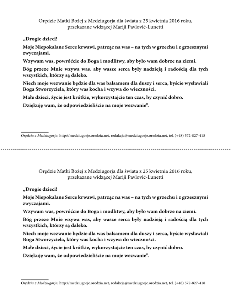 Orędzie Matki Bożej z Medziugorja dla świata z 25 kwietnia 2016 roku, przekazane widzącej Mariji Pavlović-Lunetti „Drogie dzieci! Moje Niepokalane Serce krwawi, patrząc na was – na tych w grzechu i z grzesznymi zwyczajami. Wzywam was, powróćcie do Boga i modlitwy, aby było wam dobrze na ziemi. Bóg przeze Mnie wzywa was, aby wasze serca były nadzieją i radością dla tych wszystkich, którzy są daleko. Niech moje wezwanie będzie dla was balsamem dla duszy i serca, byście wysławiali Boga Stworzyciela, który was kocha i wzywa do wieczności. Małe dzieci, życie jest krótkie, wykorzystajcie ten czas, by czynić dobro. Dziękuję wam, że odpowiedzieliście na moje wezwanie”. Orędzia z Medziugorja, http://medziugorje.oredzia.net, [email protected], tel. (+48) 572-827-418 Orędzie Matki Bożej z Medziugorja dla świata z 25 kwietnia 2016 roku, przekazane widzącej Mariji Pavlović-Lunetti „Drogie dzieci! Moje Niepokalane Serce krwawi, patrząc na was – na tych w grzechu i z grzesznymi zwyczajami. Wzywam was, powróćcie do Boga i modlitwy, aby było wam dobrze na ziemi. Bóg przeze Mnie wzywa was, aby wasze serca były nadzieją i radością dla tych wszystkich, którzy są daleko. Niech moje wezwanie będzie dla was balsamem dla duszy i serca, byście wysławiali Boga Stworzyciela, który was kocha i wzywa do wieczności. Małe dzieci, życie jest krótkie, wykorzystajcie ten czas, by czynić dobro. Dziękuję wam, że odpowiedzieliście na moje wezwanie”. Orędzia z Medziugorja, http://medziugorje.oredzia.net, [email protected], tel. (+48) 572-827-418