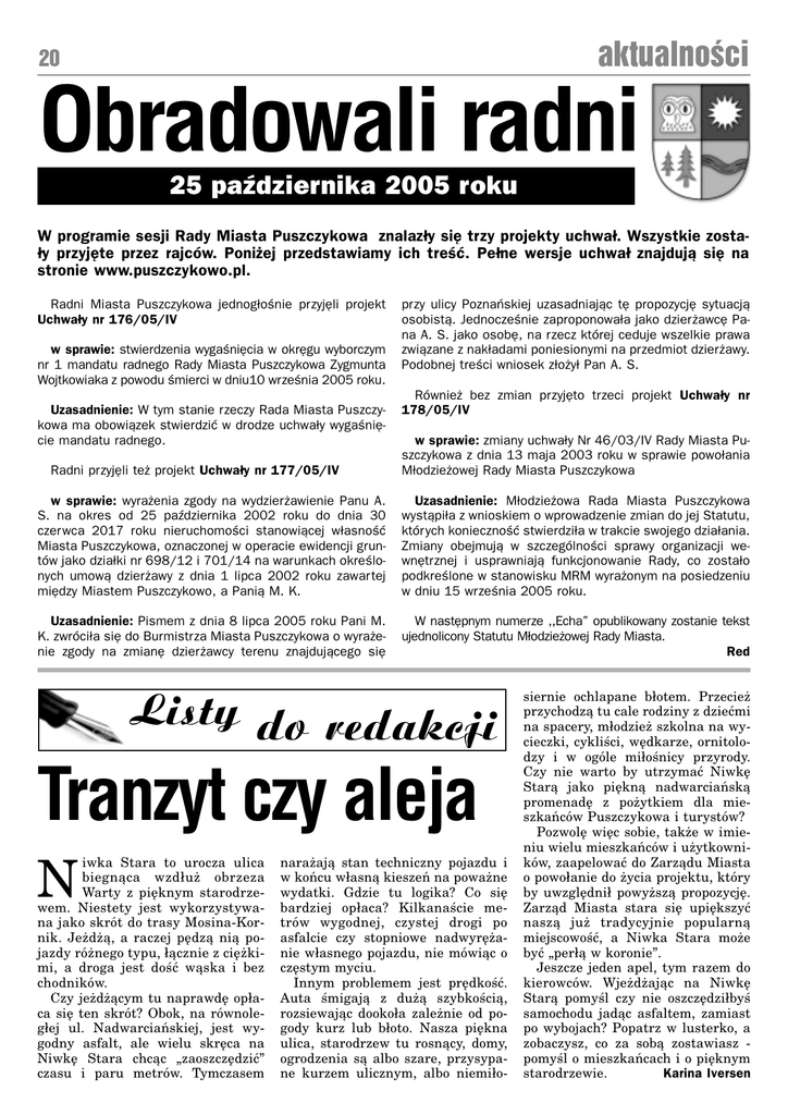 aktualnoci 20 Obradowali radni 25 padziernika 2005 roku W programie sesji Rady Miasta Puszczykowa znalaz³y siê trzy projekty uchwa³. Wszystkie zosta³y przyjête przez rajców. Poni¿ej przedstawiamy ich treæ. Pe³ne wersje uchwa³ znajduj¹ siê na stronie www.puszczykowo.pl. Radni Miasta Puszczykowa jednog³onie przyjêli projekt Uchwa³y nr 176/05/IV w sprawie: stwierdzenia wyganiêcia w okrêgu wyborczym nr 1 mandatu radnego Rady Miasta Puszczykowa Zygmunta Wojtkowiaka z powodu mierci w dniu10 wrzenia 2005 roku. Uzasadnienie: W tym stanie rzeczy Rada Miasta Puszczykowa ma obowi¹zek stwierdziæ w drodze uchwa³y wyganiêcie mandatu radnego. Radni przyjêli te¿ projekt Uchwa³y nr 177/05/IV przy ulicy Poznañskiej uzasadniaj¹c tê propozycjê sytuacj¹ osobist¹. Jednoczenie zaproponowa³a jako dzier¿awcê Pana A. S. jako osobê, na rzecz której ceduje wszelkie prawa zwi¹zane z nak³adami poniesionymi na przedmiot dzier¿awy. Podobnej treci wniosek z³o¿y³ Pan A. S. Równie¿ bez zmian przyjêto trzeci projekt Uchwa³y nr 178/05/IV w sprawie: zmiany uchwa³y Nr 46/03/IV Rady Miasta Puszczykowa z dnia 13 maja 2003 roku w sprawie powo³ania M³odzie¿owej Rady Miasta Puszczykowa w sprawie: wyra¿enia zgody na wydzier¿awienie Panu A. S. na okres od 25 padziernika 2002 roku do dnia 30 czerwca 2017 roku nieruchomoci stanowi¹cej w³asnoæ Miasta Puszczykowa, oznaczonej w operacie ewidencji gruntów jako dzia³ki nr 698/12 i 701/14 na warunkach okrelonych umow¹ dzier¿awy z dnia 1 lipca 2002 roku zawartej miêdzy Miastem Puszczykowo, a Pani¹ M. K. Uzasadnienie: M³odzie¿owa Rada Miasta Puszczykowa wyst¹pi³a z wnioskiem o wprowadzenie zmian do jej Statutu, których koniecznoæ stwierdzi³a w trakcie swojego dzia³ania. Zmiany obejmuj¹ w szczególnoci sprawy organizacji wewnêtrznej i usprawniaj¹ funkcjonowanie Rady, co zosta³o podkrelone w stanowisku MRM wyra¿onym na posiedzeniu w dniu 15 wrzenia 2005 roku. Uzasadnienie: Pismem z dnia 8 lipca 2005 roku Pani M. K. zwróci³a siê do Burmistrza Miasta Puszczykowa o wyra¿enie zgody na zmianê dzier¿awcy terenu znajduj¹cego siê W nastêpnym numerze ,,Echa opublikowany zostanie tekst ujednolicony Statutu M³odzie¿owej Rady Miasta. Red Listy do redakcji Tranzyt czy aleja N iwka Stara to urocza ulica biegn¹ca wzd³u¿ obrzeza Warty z piêknym starodrzewem. Niestety jest wykorzystywana jako skrót do trasy Mosina-Kornik. Je¿d¿¹, a raczej pêdz¹ ni¹ pojazdy ró¿nego typu, ³¹cznie z ciê¿kimi, a droga jest doæ w¹ska i bez chodników. Czy je¿d¿¹cym tu naprawdê op³aca siê ten skrót? Obok, na równoleg³ej ul. Nadwarciañskiej, jest wygodny asfalt, ale wielu skrêca na Niwkê Stara chc¹c zaoszczêdziæ czasu i paru metrów. Tymczasem nara¿aj¹ stan techniczny pojazdu i w koñcu w³asn¹ kieszeñ na powa¿ne wydatki. Gdzie tu logika? Co siê bardziej op³aca? Kilkanacie metrów wygodnej, czystej drogi po asfalcie czy stopniowe nadwyrê¿anie w³asnego pojazdu, nie mówi¹c o czêstym myciu. Innym problemem jest prêdkoæ. Auta migaj¹ z du¿¹ szybkoci¹, rozsiewaj¹c dooko³a zale¿nie od pogody kurz lub b³oto. Nasza piêkna ulica, starodrzew tu rosn¹cy, domy, ogrodzenia s¹ albo szare, przysypane kurzem ulicznym, albo niemi³o- siernie ochlapane b³otem. Przecie¿ przychodz¹ tu cale rodziny z dzieæmi na spacery, m³odzie¿ szkolna na wycieczki, cyklici, wêdkarze, ornitolodzy i w ogóle mi³onicy przyrody. Czy nie warto by utrzymaæ Niwkê Star¹ jako piêkn¹ nadwarciañsk¹ promenadê z po¿ytkiem dla mieszkañców Puszczykowa i turystów? Pozwolê wiêc sobie, tak¿e w imieniu wielu mieszkañców i u¿ytkowników, zaapelowaæ do Zarz¹du Miasta o powo³anie do ¿ycia projektu, który by uwzglêdni³ powy¿sz¹ propozycjê. Zarz¹d Miasta stara siê upiêkszyæ nasz¹ ju¿ tradycyjnie popularn¹ miejscowoæ, a Niwka Stara mo¿e byæ per³¹ w koronie. Jeszcze jeden apel, tym razem do kierowców. Wje¿d¿aj¹c na Niwkê Star¹ pomyl czy nie oszczêdzi³by samochodu jad¹c asfaltem, zamiast po wybojach? Popatrz w lusterko, a zobaczysz, co za sob¹ zostawiasz pomyl o mieszkañcach i o piêknym starodrzewie. Karina Iversen