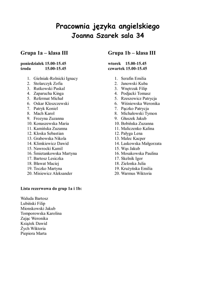 Pracownia języka angielskiego Joanna Szarek sala 34 Grupa 1a – klasa III Grupa 1b – klasa III poniedziałek 15.00-15.45 środa 15.00-15.45 wtorek 15.00-15.45 czwartek 15.00-15.45 1. Gielniak-Rolnicki Ignacy 2. Stolarczyk Zofia 3. Rutkowski Paskal 4. Zaparucha Kinga 5. Refermat Michał 6. Oskar Kleszczewski 7. Patryk Koniel 8. Mach Karol 9. Frozyna Zuzanna 10. Konaszewska Maria 11. Kamińska Zuzanna 12. Kloska Sebastian 13. Grabowska Nikola 14. Klimkiewicz Dawid 15. Nawrocki Kamil 16. Śmietankowska Martyna 17. Bartosz Lesiczka 18. Bławat Maciej 19. Toczko Martyna 20. Misiewicz Aleksander Lista rezerwowa do grup 1a i 1b: Waluda Bartosz Lubiński Filip Mionskowski Jakub Tomporowska Karolina Zając Weronika Książek Dawid Żych Wiktoria Piepiora Marta 1. Serafin Emilia 2. Janowski Kuba 3. Wnętrzak Filip 4. Podjacki Tomasz 5. Rzeszewicz Patrycja 6. Wiśniewska Weronika 7. Pączko Patrycja 8. Michałowski Tymon 9. Głuszek Jakub 10. Bobińska Zuzanna 11. Maliczenko Kalina 12. Pałyga Lena 13. Malec Kacper 14. Laskowska Małgorzata 15. Wąs Jakub 16. Mosakowska Paulina 17. Skelnik Igor 18. Zielonka Julia 19. Krużyńska Emilia 20. Warmus Wiktoria Grupa 2 – klasa IV Grupa 3 – klasa V wtorek 15.50-16.35 piątek 15.00-15.45 poniedziałek 15.50-17.25 środa 15.50-16.35 1. Wołoszyn Karina 2. Zdziebkowska Zuzanna 3. Leśniak Agata 4. Dahm Kinga 5. Krauze Kacper 6. Chodorowski Olivier 7. Wieczorek Kondrad 8. Chomicz Maria 9. Borkowska Julia 10. Mączkowska Wiktoria 11. Szulc Kajetan 12. Chojnowski Mateusz 13. Ościk Arkadiusz 14. Monkiewicz Daria 15. Chylińska Zuzanna 16. Klemann Agnieszka 17. Krajewska Zofia 18. Litkowski Grzegorz 19. Klawikowski Marek 20. Pałyga Filip 1. Florczak Szymon 2. Nyks Daniela 3. Strojna Paulina 4. Żurawińska Emilia 5. Piwowar Joanna 6. Kloskowski Michał 7. Duchowski Marek 8. Neumann Filip 9. Rusek Franciszek 10. Rosa Zuzanna 11. Robak Julia 12. Orlikowski Ziemowit 13. Pluciński Adam 14. Piotrowska Olga 15. Nalepka Elżbieta 16. Bogdanowicz Piotr 17. Puk Gabriela 18. Pozlewicz Aleksandra 19. Misiewicz Mikołaj 20. Ostrowska Patrycja Lista rezerwowa: Lista rezerwowa: Zając Mateusz Korpal Dagmara Laskowska Kinga Kowalska Kinga Kowalska Klaudia Szeptycka Wiktoria Słomiński Alan Zaparucha Aleksandra Brodziński Michał Radkowiak Michał Skonieczna Wiktoria