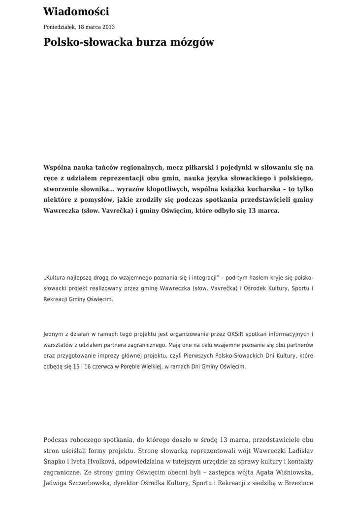 Wiadomości Poniedziałek, 18 marca 2013 Polsko-słowacka burza mózgów Wspólna nauka tańców regionalnych, mecz piłkarski i pojedynki w siłowaniu się na ręce z udziałem reprezentacji obu gmin, nauka języka słowackiego i polskiego, stworzenie słownika… wyrazów kłopotliwych, wspólna książka kucharska – to tylko niektóre z pomysłów, jakie zrodziły się podczas spotkania przedstawicieli gminy Wawreczka (słow. Vavrečka) i gminy Oświęcim, które odbyło się 13 marca. „Kultura najlepszą drogą do wzajemnego poznania się i integracji” – pod tym hasłem kryje się polskosłowacki projekt realizowany przez gminę Wawreczka (słow. Vavrečka) i Ośrodek Kultury, Sportu i Rekreacji Gminy Oświęcim. Jednym z działań w ramach tego projektu jest organizowanie przez OKSiR spotkań informacyjnych i warsztatów z udziałem partnera zagranicznego. Mają one na celu wzajemne poznanie się obu partnerów oraz przygotowanie imprezy głównej projektu, czyli Pierwszych Polsko-Słowackich Dni Kultury, które odbędą się 15 i 16 czerwca w Porębie Wielkiej, w ramach Dni Gminy Oświęcim. Podczas roboczego spotkania, do którego doszło w środę 13 marca, przedstawiciele obu stron uściślali formy projektu. Stronę słowacką reprezentowali wójt Wawreczki Ladislav Šnapko i Iveta Hvolková, odpowiedzialna w tutejszym urzędzie za sprawy kultury i kontakty zagraniczne. Ze strony gminy Oświęcim obecni byli – zastępca wójta Agata Wiśniowska, Jadwiga Szczerbowska, dyrektor Ośrodka Kultury, Sportu i Rekreacji z siedzibą w Brzezince oraz Barbara Gasidło, dyrektor Gminnej Biblioteki Publicznej z siedzibą w Grojcu. Obie strony mimo pewnej bariery językowej świetnie się dogadywały nawet bez pomocy tłumacza; w miłej atmosferze wzbogaconej o regionalne przysmaki toczyła się przysłowiowa „burza mózgów”. Efekty tej twórczej pracy to m.in. pomysł wspólnej nauki tańców regionalnych i nowoczesnych przez dzieci i dorosłych z obu gmin, mecz piłkarski i pojedynki w siłowaniu się na ręce z udziałem reprezentacji obu gmin, nauka języka słowackiego i polskiego, stworzenie słownika… wyrazów kłopotliwych, wspólna książka kucharska, w której znajdą się przepisy na sporządzenie potraw charakterystycznych dla obu gmin uczestniczących w projekcie. Projekt współfinansowany jest w 85 proc. przez Unię Europejską z Europejskiego Funduszu Rozwoju Regionalnego w ramach Współpracy Transgranicznej Rzeczpospolita Polska - Republika Słowacka 20072013 oraz w 10 proc. z budżetu państwa za pośrednictwem Euroregionu Beskidy.