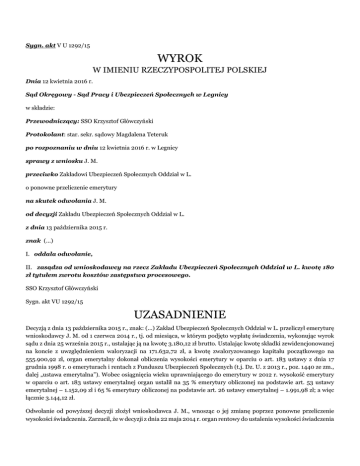 Sygn. akt V U 1292/15 WYROK W IMIENIU RZECZYPOSPOLITEJ POLSKIEJ Dnia 12 kwietnia 2016 r. Sąd Okręgowy - Sąd Pracy i Ubezpieczeń Społecznych w Legnicy w składzie: Przewodniczący: SSO Krzysztof Główczyński Protokolant: star. sekr. sądowy Magdalena Teteruk po rozpoznaniu w dniu 12 kwietnia 2016 r. w Legnicy sprawy z wniosku J. M. przeciwko Zakładowi Ubezpieczeń Społecznych Oddział w L. o ponowne przeliczenie emerytury na skutek odwołania J. M. od decyzji Zakładu Ubezpieczeń Społecznych Oddział w L. z dnia 13 października 2015 r. znak (...) I. oddala odwołanie, II. zasądza od wnioskodawcy na rzecz Zakładu Ubezpieczeń Społecznych Oddział w L. kwotę 180 zł tytułem zwrotu kosztów zastępstwa procesowego. SSO Krzysztof Główczyński Sygn. akt VU 1292/15 UZASADNIENIE Decyzją z dnia 13 października 2015 r., znak: (...) Zakład Ubezpieczeń Społecznych Oddział w L. przeliczył emeryturę wnioskodawcy J. M. od 1 czerwca 2014 r., tj. od miesiąca, w którym podjęto wypłatę świadczenia, wykonując wyrok sądu z dnia 25 września 2015 r., ustalając ją na kwotę 3.180,12 zł brutto. Ustalając kwotę składki zewidencjonowanej na koncie z uwzględnieniem waloryzacji na 171.632,72 zł, a kwotę zwaloryzowanego kapitału początkowego na 555.900,92 zł, organ emerytalny dokonał obliczenia wysokości emerytury w oparciu o art. 183 ustawy z dnia 17 grudnia 1998 r. o emeryturach i rentach z Funduszu Ubezpieczeń Społecznych (t.j. Dz. U. z 2013 r., poz. 1440 ze zm., dalej „ustawa emerytalna”). Wobec osiągnięcia wieku uprawniającego do emerytury w 2012 r. wysokość emerytury w oparciu o art. 183 ustawy emerytalnej organ ustalił na 35 % emerytury obliczonej na podstawie art. 53 ustawy emerytalnej – 1.152,09 zł i 65 % emerytury obliczonej na podstawie art. 26 ustawy emerytalnej – 1.991,98 zł; a więc łącznie 3.144,12 zł. Odwołanie od powyższej decyzji złożył wnioskodawca J. M., wnosząc o jej zmianę poprzez ponowne przeliczenie wysokości świadczenia. Zarzucił, że w decyzji z dnia 22 maja 2014 r. organ rentowy do ustalenia wysokości świadczenia przyjął kwotę składek zaewidencjonowanych na koncie z uwzględnieniem waloryzacji na kwotę 180.185,44 zł, podczas gdy w treści zaskarżonych decyzji kwota przedmiotowych składek została określona na kwotę 171.632,72 zł. Przyjęto też mniejszą wysokość zwaloryzowanego kapitału początkowego niż w decyzji z dnia 22 maja 2014 r. Wobec tego uznał wyliczenia przyjęte w zaskarżonej decyzji za nieprawidłowe i nie uwzględniające treści orzeczenia sądu. W odpowiedzi na odwołanie Zakład Ubezpieczeń Społecznych Oddział w L. wniósł o jego oddalenie wskazując, że decyzja z dnia 22 maja 2014 r. była decyzją zaliczkową, o czym wnioskodawca był poinformowany w jej treści. Ostateczna kwota świadczenia wyliczona była decyzją z dnia 12 czerwca 2014 r., zmienioną orzeczeniem sądowym. Obniżenie kwoty świadczenia w tej decyzji w stosunku do kwoty ustalonej w decyzji zaliczkowej miało związek ze zmianą waloryzacji kapitału początkowego, obniżeniu okresu doliczonego do kapitału początkowego zgodnie z art. 185 ustawy emerytalnej oraz obniżeniem średniego trwania życia wynikającego z obowiązujących tablic średniego dalszego trwania życia. Decyzja zaskarżona była wynikiem wykonania wyroku sądu. Organ rentowy poinformował, że została ona jednak zmieniona decyzją z dnia 7 grudnia 2014 r., w której do przeliczenia emerytury wnioskodawcy uwzględniono kwotę zwaloryzowanego kapitału początkowego w wysokości 625.211,09 zł i kwotę składek zewidencjonowanych na koncie z uwzględnieniem waloryzacji na 171.632,72 zł, co dało emeryturę w wysokości 3.356,54 zł. Sąd ustalił następujący stan faktyczny: Wnioskodawca J. M. urodził się w dniu (...) Wykonując wyrok z dnia 15 kwietnia 2014 r., decyzją z dnia 22 maja 2014 r. Zakład Ubezpieczeń Społecznych Oddział w L. przyznał wnioskodawcy prawo do emerytury od dnia 1 stycznia 2014 r. tj. od daty określonej w tym wyroku i zawiesił wypłatę świadczenia z uwagi na kontynuowanie przez wnioskodawcę zatrudnienia. Emeryturę wyliczono na kwotę 3.294,63 zł, w oparciu o art. 183 ustawy emerytalnej. Organ rentowy do ustalenia wysokości świadczenia przyjął kwotę składek zaewidencjonowanych na koncie z uwzględnieniem waloryzacji na kwotę 180.185,44 zł i kwotę zwaloryzowanego kapitału początkowego w wysokości 617.846,22 zł. Wyliczając kwotę zaewidencjonowanych składek, uwzględnił waloryzację roczną składek za lata 1999-2011 oraz kwartalną za 4 kwartały roku 2012 i 3 pierwsze kwartały roku 2013 r. Decyzja zawierała informację, że wypłata świadczenia podlega zawieszeniu z uwagi na kontynuowanie zatrudnienia, ustalona w niej wysokość emerytury nie jest ostateczna, a ostateczna wysokość świadczenia zostanie ustalona z chwila podjęcia wypłaty emerytury. W dniu 02 czerwca 2014 r. wnioskodawca przedłożył do ZUS świadectwo pracy z dnia 30 maja 2014 r., z którego wynikało, że był on zatrudniony w (...) Spółka Akcyjna w G. od 22 kwietnia 1974 r. do 31 maja 2014 r. Jednocześnie wniósł o wznowienie wypłaty emerytury. Po rozpatrzeniu wniosku J. M. z dnia 02 czerwca 2014 r., kolejną decyzją z dnia 12 czerwca 2014 r., wydaną na podstawie nowych dokumentów, organ rentowy przeliczył emeryturę, ustalając kwotę składki zewidencjonowanej na koncie z uwzględnieniem waloryzacji na 168.921,22 zł, a kwotę skorygowanego i zwaloryzowanego kapitału początkowego na 555.900,92 zł i wyliczył wysokość emerytury na kwotę 3.136,65 zł, w oparciu o art. 183 ustawy emerytalnej. Jednocześnie wymieniony organ wskazał, iż emerytura ustalona decyzją ma charakter zaliczkowy do czasu zaksięgowania składek za miesiąc maj 2014 r. na koncie ubezpieczeniowym ubezpieczonego. Organ rentowy podjął wypłatę świadczenia od 01 czerwca 2014 r. Decyzją z dnia 18 czerwca 2014 r. 