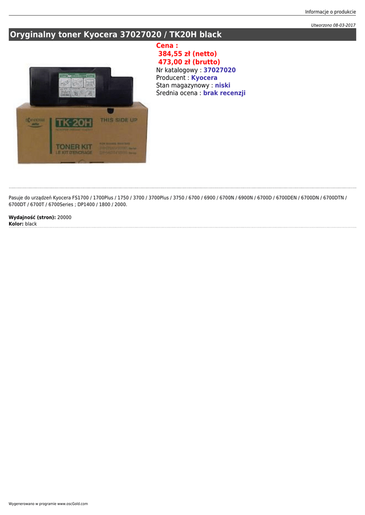 Informacje o produkcie Utworzono 08-03-2017 Oryginalny toner Kyocera 37027020 / TK20H black Cena : 384,55 zł (netto) 473,00 zł (brutto) Nr katalogowy : 37027020 Producent : Kyocera Stan magazynowy : niski Średnia ocena : brak recenzji Pasuje do urządzeń Kyocera FS1700 / 1700Plus / 1750 / 3700 / 3700Plus / 3750 / 6700 / 6900 / 6700N / 6900N / 6700D / 6700DEN / 6700DN / 6700DTN / 6700DT / 6700T / 6700Series ; DP1400 / 1800 / 2000. Wydajność (stron): 20000 Kolor: black Wygenerowano w programie www.oscGold.com