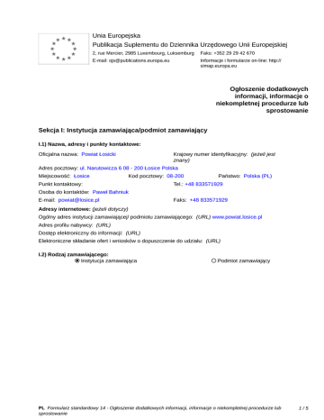 Unia Europejska Publikacja Suplementu do Dziennika Urzędowego Unii Europejskiej 2, rue Mercier, 2985 Luxembourg, Luksemburg Faks: +352 29 29 42 670 E-mail: [email protected] Informacje i formularze on-line: http:// simap.europa.eu Ogłoszenie dodatkowych informacji, informacje o niekompletnej procedurze lub sprostowanie Sekcja I: Instytucja zamawiająca/podmiot zamawiający I.1) Nazwa, adresy i punkty kontaktowe: Krajowy numer identyfikacyjny: (jeżeli jest znany) _____ Oficjalna nazwa: Powiat Łosicki Adres pocztowy: ul. Narutowicza 6 08 - 200 Łosice Polska Miejscowość: Łosice Kod pocztowy: 08-200 Punkt kontaktowy: _____ Państwo: Polska (PL) Tel.: +48 833571929 Osoba do kontaktów: Paweł Bahniuk E-mail: [email protected] Faks: +48 833571929 Adresy internetowe: (jeżeli dotyczy) Ogólny adres instytucji zamawiającej/ podmiotu zamawiającego: (URL) www.powiat.losice.pl Adres profilu nabywcy: (URL) _____ Dostęp elektroniczny do informacji: (URL) _____ Elektroniczne składanie ofert i wniosków o dopuszczenie do udziału: (URL) _____ I.2) Rodzaj zamawiającego: Instytucja zamawiająca Podmiot zamawiający PL Formularz standardowy 14 - Ogłoszenie dodatkowych informacji, informacje o niekompletnej procedurze lub sprostowanie 1/5 Sekcja II: Przedmiot zamówienia II.1.1) Nazwa nadana zamówieniu: Zakup samochodów ratowniczo-gaśniczych oraz samochodu operacyjno-sztabowego w ramach Programu Współpracy Transgranicznej Polska – Białoruś – Ukraina 2007-2013, Priorytet 2 – Poprawa jakości życia, Zadanie 2.1. Ochrona środowiska w obszarze przygranicznym II.1.2) Krótki opis zamówienia lub zakupu: (podano w pierwotnym ogłoszeniu) 1. Przedmiotem zamówienia jest zakup i dostawa samochodów. Przedmiot zamówienia obejmuje: - średni samochód ratowniczo-gaśniczy z wyposażeniem funkcją ratownictwa technicznego – 7 szt. (szczegółowy opis z Załączniku nr 1a do siwz) - ciężki samochód ratowniczo-gaśniczy wraz z przyczepą sprzętową – 1 szt. (szczegółowy opis z Załączniku nr 1b do siwz) - samochód operacyjno-sztabowy – 1 szt. (szczegółowy opis z Załączniku nr 1c do siwz) 2. Przedmiot zamówienia dofinansowany jest ze środków Europejskiego Funduszu Rozwoju Regionalnego w ramach Programu Współpracy Transgranicznej Polska – Białoruś – Ukraina 2007-2013, Priorytet 2 – Poprawa jakości życia, Zadanie 2.1. Ochrona środowiska w obszarze przygranicznym. II.1.3) Wspólny Słownik Zamówień (CPV) Główny przedmiot Dodatkowe przedmioty Słownik główny 34144210 34144200 34223300 35110000 Słownik uzupełniający (jeżeli dotyczy) PL Formularz standardowy 14 - Ogłoszenie dodatkowych informacji, informacje o niekompletnej procedurze lub sprostowanie 2/5 Sekcja IV: Procedura IV.1)Rodzaj procedury (podano w pierwotnym ogłoszeniu) Otwarta Ograniczona Ograniczona przyspieszona Negocjacyjna Negocjacyjna przyspieszona Dialog konkurencyjny Negocjacyjna z uprzednim ogłoszeniem Negocjacyjna bez uprzedniego ogłoszenia Negocjacyjna z publikacją ogłoszenia o zamówieniu Negocjacyjna bez publikacji ogłoszenia o zamówieniu Udzielenie zamówienia bez uprzedniej publikacji ogłoszenia o zamówieniu w Dzienniku Urzędowym Unii Europejskiej IV.2)Informacje administracyjne IV.2.1)Numer referencyjny: (podano w pierwotnym ogłoszeniu) ZP.272.3.2014 IV.2.2)Dane referencyjne ogłoszenia w przypadku ogłoszeń przesłanych drogą elektroniczną: Pierwotne ogłoszenie przesłane przez eNotices TED eSender Login: ENOTICES_pawelbahniuk Dane referencyjne ogłoszenia: 2014-011682 rok i numer dokumentu IV.2.3)Ogłoszenie, którego dotyczy niniejsza publikacja: Numer ogłoszenia w Dz.U.: 2014/S 020-030883 z dnia: 29/01/2014 (dd/mm/rrrr) IV.2.4)Data wysłania pierwotnego ogłoszenia: 24/01/2014 (dd/mm/rrrr) PL Formularz standardowy 14 - Ogłoszenie dodatkowych informacji, informacje o niekompletnej procedurze lub sprostowanie 3/5 Sekcja VI: Informacje uzupełniające VI.1) Ogłoszenie dotyczy: Procedury niepełnej Sprostowania Informacji dodatkowych VI.2) Informacje na temat niepełnej procedury udzielenia zamówienia: Postępowanie o udzielenie zamówienia zostało przerwane Postępowanie o udzielenie zamówienia uznano za nieskuteczne Zamówienia nie udzielono Zamówienie może być przedmiotem ponownej publikacji VI.3) Informacje do poprawienia lub dodania : VI.3.1) Zmiana oryginalnej informacji podanej przez instytucję zamawiającą Publikacja w witrynie TED niezgodna z oryginalną informacją, przekazaną przez instytucję zamawiającą Oba przypadki VI.3.2) W ogłoszeniu pierwotnym W odpowiedniej dokumentacji przetargowej (więcej informacji w odpowiedniej dokumentacji przetargowej) W obu przypadkach (więcej informacji w odpowiedniej dokumentacji przetargowej) VI.3.3) Tekst, który należy poprawić w pierwotnym ogłoszeniu Miejsce, w którym znajduje się Zamiast: Powinno być: zmieniany tekst: Przedmiot zamówienia winien Przedmiot zamówienia winien Sekcja III.1.4 Inne szczególne spełniać następujące wymagania: spełniać następujące wymagania: h) Podwozie pojazdów musi h) Podwozie pojazdów musi warunki: posiadać świadectwo homologacji posiadać świadectwo homologacji typu, wydane przez ministra typu, wydane przez ministra właściwego do spraw transportu, właściwego do spraw transportu, zgodnie z ustawą Prawo o ruchu zgodnie z ustawą Prawo o ruchu drogowym (Dz. U. z 2005 r., drogowym (Dz. U. z 2005 r., Nr 108, poz. 908 z późn. zm.). Nr 108, poz. 908 z późn. zm.). Świadectwo homologacji wraz z Świadectwo homologacji wraz z opisem technicznym należy dołączyć opisem technicznym należy do oferty. dostarczyć Zamawiającemu w dniu odbioru pojazdów. VI.3.4) Daty, które należy poprawić w pierwotnym ogłoszeniu Miejsce, w którym znajdują się Zamiast: zmieniane daty: Powinno być: VI.3.5) Adresy i punkty kontaktowe, które należy poprawić VI.3.6) Tekst, który należy dodać do pierwotnego ogłoszenia Miejsce, w którym należy dodać t