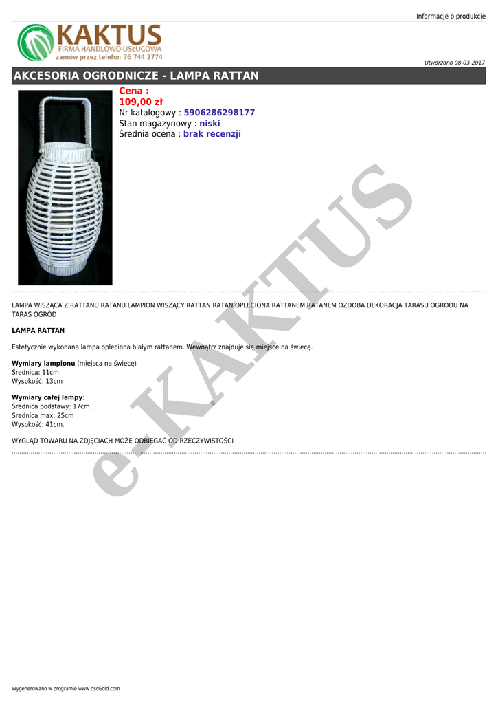 Informacje o produkcie Utworzono 08-03-2017 AKCESORIA OGRODNICZE - LAMPA RATTAN Cena : 109,00 zł AK TU S Nr katalogowy : 5906286298177 Stan magazynowy : niski Średnia ocena : brak recenzji LAMPA WISZĄCA Z RATTANU RATANU LAMPION WISZĄCY RATTAN RATAN OPLECIONA RATTANEM RATANEM OZDOBA DEKORACJA TARASU OGRODU NA TARAS OGRÓD LAMPA RATTAN Estetycznie wykonana lampa opleciona białym rattanem. Wewnątrz znajduje się miejsce na świecę. Wymiary lampionu (miejsca na świecę) Średnica: 11cm Wysokość: 13cm eK Wymiary całej lampy: Średnica podstawy: 17cm. Średnica max: 25cm Wysokość: 41cm. WYGLĄD TOWARU NA ZDJĘCIACH MOŻE ODBIEGAĆ OD RZECZYWISTOŚCI Wygenerowano w programie www.oscGold.com