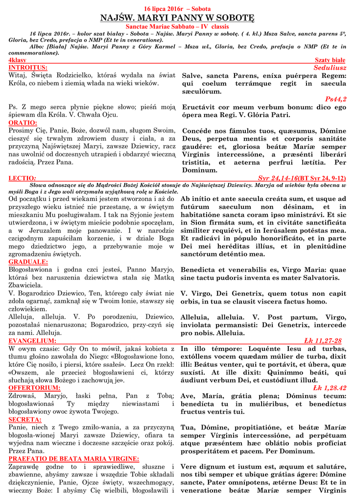 16 lipca 2016r – Sobota NAJŚW. MARYI PANNY W SOBOTĘ Sanctae Mariae Sabbato – IV classis 16 lipca 2016r. – kolor szat białay - Sobota – Najśw. Maryi Panny w sobotę. ( 4. kl.) Msza Salve, sancta parens 5°, Gloria, bez Credo, prefacja o NMP (Et te in veneratione). Albo: [Biała] Najśw. Maryi Panny z Góry Karmel – Msza wł., Gloria, bez Credo, prefacja o NMP (Et te in commemoratione). 4klasy Szaty białe INTROITUS: Seduliusz Witaj, Święta Rodzicielko, któraś wydała na świat Salve, sancta Parens, eníxa puérpera Regem: Króla, co niebem i ziemią włada na wieki wieków. qui coelum terrámque regit in saecula sæculórum. Ps44,2 Ps. Z mego serca płynie piękne słowo; pieśń moją Eructávit cor meum verbum bonum: dico ego śpiewam dla Króla. V. Chwała Ojcu. ópera mea Regi. V. Glória Patri. ORATIO: Prosimy Cię, Panie, Boże, dozwól nam, sługom Swoim, Concéde nos fámulos tuos, quæsumus, Dómine cieszyć się trwałym zdrowiem duszy i ciała, a za Deus, perpetua mentis et corporis sanitáte przyczyną Najświętszej Maryi, zawsze Dziewicy, racz gaudére: et, gloriosa beátæ Maríæ semper nas uwolnić od doczesnych utrapień i obdarzyć wieczną Vírginis intercessióne, a præsénti liberári radością. Przez Pana. tristitia, et aeterna perfrui lætítia. Per Dominum. LECTIO: Syr 24,14-16(BT Syr 24, 9-12) Słowa odnoszące się do Mądrości Bożej Kościół stosuje do Najświętszej Dziewicy. Maryja od wieków była obecna w myśli Boga i z Jego woli otrzymała wyjątkową rolę w Kościele. Od początku i przed wiekami jestem stworzona i aż do przyszłego wieku istnieć nie przestanę, a w świętym mieszkaniu Mu posługiwałam. I tak na Syjonie jestem utwierdzona, i w świętym mieście podobnie spoczęłam, a w Jeruzalem moje panowanie. I w narodzie czcigodnym zapuściłam korzenie, i w dziale Boga mego dziedzictwo jego, a przebywanie moje w zgromadzeniu świętych. GRADUALE: Błogosławiona i godna czci jesteś, Panno Maryjo, któraś bez naruszenia dziewictwa stała się Matką Zbawiciela. V. Bogarodzico Dziewico, Ten, którego cały świat nie zdoła ogarnąć, zamknął się w Twoim łonie, stawszy się człowiekiem. Alleluja, alleluja. V. Po porodzeniu, Dziewico, pozostałaś nienaruszona; Bogarodzico, przyczyń się za nami. Alleluja. EVANGELIUM: W owym czasie: Gdy On to mówił, jakaś kobieta z tłumu głośno zawołała do Niego: «Błogosławione łono, które Cię nosiło, i piersi, które ssałeś». Lecz On rzekł: «Owszem, ale przecież błogosławieni ci, którzy słuchają słowa Bożego i zachowują je». OFFERTORIUM: Zdrowaś, Maryjo, łaski pełna, Pan z Tobą; błogosławionaś Ty między niewiastami i błogosławiony owoc żywota Twojego. SECRETA: Panie, niech z Twego zmiłowania, a za przyczyną błogosławionej Maryi zawsze Dziewicy, ofiara ta wyjedna nam wieczne i doczesne szczęście oraz pokój. Przez Pana. PRAEFATIO DE BEATA MARIA VIRGINE: Zaprawdę godne to i sprawiedliwe, słuszne i zbawienne, abyśmy zawsze i wszędzie Tobie składali dziękczynienie, Panie, Ojcze święty, wszechmogący, wieczny Boże: I abyśmy Cię wielbili, błogosławili i Ab inítio et ante saecula creáta sum, et usque ad futúrum saeculum non désinam, et in habitatióne sancta coram ipso ministrávi. Et sic in Sion firmáta sum, et in civitáte sanctificáta simíliter requiévi, et in Ierúsalem potéstas mea. Et radicávi in pópulo honorificáto, et in parte Dei mei heréditas illíus, et in plenitúdine sanctórum deténtio mea. Benedicta et venerabilis es, Virgo Maria: quae sine tactu pudoris inventa es mater Salvatoris. V. Virgo, Dei Genetrix, quem totus non capit orbis, in tua se clausit viscera factus homo. Alleluia, alleluia. V. Post partum, Virgo, inviolata permansisti: Dei Genetrix, intercede pro nobis. Alleluia. Łk 11,27-28 In illo témpore: Loquénte Iesu ad turbas, extóllens vocem quædam múlier de turba, dixit illi: Beátus venter, qui te portávit, et úbera, quæ suxísti. At ille dixit: Quinímmo beáti, qui áudiunt verbum Dei, et custódiunt illud. Łk 1,28.42 Ave, María, grátia plena; Dóminus tecum: benedícta tu in muliéribus, et benedíctus fructus ventris tui. Tua, Dómine, propitiatióne, et beátæ Maríæ semper Vírginis intercessióne, ad perpétuam atque præséntem hæc oblátio nobis profíciat prosperitátem et pacem. Per Dominum. Vere dignum et iustum est, æquum et salutáre, nos tibi semper et ubique grátias ágere: Dómine sancte, Pater omnípotens, ætérne Deus: Et te in veneratione beátæ Maríæ semper Vírginis wysławiali obchodząc święto Najświętszej Maryi zawsze Dziewicy. Ona to poczęła Jednorodzonego Syna Twojego za sprawą Ducha Świętego i zachowując chwałę dziewictwa wydała światu światłość przedwieczną, Jezusa Chrystusa, Pana naszego. Przez Niego majestat Twój chwalą Aniołowie, uwielbiają Państwa, z lękiem czczą Potęgi. A wspólnie z nimi w radosnym uniesieniu sławią Niebiosa, Moce niebieskie i błogosławieni Serafini. Z nimi to, prosimy, dozwól i naszym głosom wołać w pokornym uwielbieniu: COMMUNIO:. Błogosławione wnętrzności Maryi Panny, które nosiły Syna Ojca Przedwiecznego. POSTCOMMUNIO: Przyjąwszy zasiłek naszego zbawienia, prosimy Cię, Panie, daj, by nas nieustannie chroniła opieka błogosławionej Maryi zawsze Dziewicy, na której cześć złożyliśmy tę ofiarę. Przez Pana. collaudáre, benedícere et prædicáre. Quæ et Unigénitum tuum Sancti Spíritus obumbratióne concépit: et, virginitátis glória permanénte, lumen ætérnum mundo effúdit, Iesum Christum, Dóminum nostrum. Per quem maiestátem tuam laudant Angeli, adórant Dominatiónes, tremunt Potestátes. Coeli coelorúmque Virtútes ac beáta Séraphim sócia exsultatióne concélebrant. Cum quibus et nostras voces ut admitti iubeas, deprecámur, súpplici confessióne dicéntes: Beáta viscera Maríæ Vírginis, quæ portavérunt ætérni Patris Fílium, allelúia. Sum