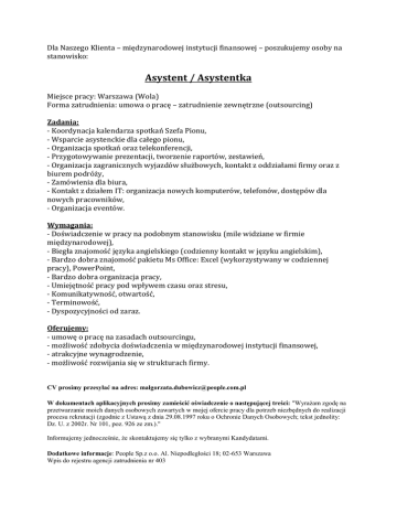 Dla Naszego Klienta – międzynarodowej instytucji finansowej – poszukujemy osoby na stanowisko: Asystent / Asystentka Miejsce pracy: Warszawa (Wola) Forma zatrudnienia: umowa o pracę – zatrudnienie zewnętrzne (outsourcing) Zadania: - Koordynacja kalendarza spotkań Szefa Pionu, - Wsparcie asystenckie dla całego pionu, - Organizacja spotkań oraz telekonferencji, - Przygotowywanie prezentacji, tworzenie raportów, zestawień, - Organizacja zagranicznych wyjazdów służbowych, kontakt z oddziałami firmy oraz z biurem podróży, - Zamówienia dla biura, - Kontakt z działem IT: organizacja nowych komputerów, telefonów, dostępów dla nowych pracowników, - Organizacja eventów. Wymagania: - Doświadczenie w pracy na podobnym stanowisku (mile widziane w firmie międzynarodowej), - Biegła znajomość języka angielskiego (codzienny kontakt w języku angielskim), - Bardzo dobra znajomość pakietu Ms Office: Excel (wykorzystywany w codziennej pracy), PowerPoint, - Bardzo dobra organizacja pracy, - Umiejętność pracy pod wpływem czasu oraz stresu, - Komunikatywność, otwartość, - Terminowość, - Dyspozycyjności od zaraz. Oferujemy: - umowę o pracę na zasadach outsourcingu, - możliwość zdobycia doświadczenia w międzynarodowej instytucji finansowej, - atrakcyjne wynagrodzenie, - możliwość rozwijania się w strukturach firmy. CV prosimy przesyłać na adres: [email protected] W dokumentach aplikacyjnych prosimy zamieścić oświadczenie o następującej treści: "Wyrażam zgodę na przetwarzanie moich danych osobowych zawartych w mojej ofercie pracy dla potrzeb niezbędnych do realizacji procesu rekrutacji (zgodnie z Ustawą z dnia 29.08.1997 roku o Ochronie Danych Osobowych; tekst jednolity: Dz. U. z 2002r. Nr 101, poz. 926 ze zm.)." Informujemy jednocześnie, że skontaktujemy się tylko z wybranymi Kandydatami. Dodatkowe informacje: People Sp.z o.o. Al. Niepodległości 18; 02-653 Warszawa Wpis do rejestru agencji zatrudnienia nr 403