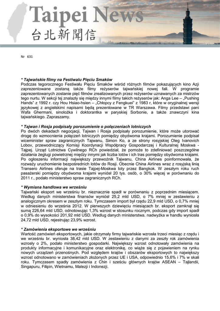 Nr 631 * Tajwańskie filmy na Festiwalu Pięciu Smaków Podczas tegorocznego Festiwalu Pięciu Smaków wśród różnych filmów pokazujących kino Azji zaprezentowane zostaną także filmy reżyserów tajwańskiej nowej fali. W programie zaprezentowanych zostanie pięć filmów zrealizowanych przez reżyserów uznawanych za mistrzów tego nurtu. W sekcji tej znalazły się między innymi filmy takich reżyserów jak: Anga Lee – „Pushing Hands” z 1992 r. czy Hou Hsiao-hsien – „Chłopcy z Fengkuei” z 1983 r, które w oryginalnej wersji językowej z angielskimi napisami będą prezentowane w TR Warszawa. Filmy przedstawi pani Wafa Ghermani, sinolożka i doktorantka w paryskiej Sorbonie, a także znawczyni kina tajwańskiego. Zapraszamy. * Tajwan i Rosja podpisały porozumienie o połączeniach lotniczych Po dwóch dekadach negocjacji, Tajwan i Rosja podpisały porozumienie, które może utorować drogę do wzmocnienia połączeń lotniczych pomiędzy obydwoma krajami. Porozumienie podpisał wiceminister spraw zagranicznych Tajwanu, Simon Ko, a ze strony rosyjskiej Oleg Ivanovich Lobov, przewodniczący Komisji Koordynacji Współpracy Gospodarczej i Kulturalnej Moskwa Tajpej. Urząd Lotnictwa Cywilnego RCh powiedział, że pomoże to zdefiniować poszczególne działania żeglugi powietrznej między innymi jak liczba lotów i ich tras pomiędzy obydwoma krajami. Po ogłoszeniu informacji największy przewoźnik Tajwanu, China Airlines poinformowała, że rozważy uruchomienie bezpośrednich lotów do Rosji. Obecnie China Airlines wraz z rosyjską linią Transero Airlines oferuje na trasie Tajpej-Moskwa loty przez Bangkok. W zeszłym roku ruch pasażerski pomiędzy obydwoma krajami wyniósł 20 tys. osób, o 30% więcej w porównaniu do 2011 r., podało ministerstwo spraw zagranicznych RCh. * Wymiana handlowa we wrześniu Tajwański eksport we wrześniu br. nieznacznie spadł w porównaniu z poprzednim miesiącem. Według danych ministerstwa finansów wyniósł 25,2 mld USD, o 7% mniej w zestawieniu z analogicznym okresem w zeszłym roku. Tymczasem import był rzędu 22,9 mld USD, o 0,7% mniej w odniesieniu do września 2012. W pierwszych dziewięciu miesiącach br. eksport zamknął się sumą 226,64 mld USD, odnotowując 1,3% wzrost w stosunku rocznym, podczas gdy import spadł o 0,9% do wysokości 201,92 mld USD. Według danych ministerstwa. nadwyżka w handlu wyniosła 24,72 mld USD, rejestrując 23,9% wzrost. * Zamówienia eksportowe we wrześniu Wartość zamówień eksportowych, jakie otrzymały firmy tajwańskie wzrosła trzeci miesiąc z rzędu i we wrześniu br. wyniosła 38,42 mld USD. W zestawieniu z danymi za zeszły rok zamówienia wzrosły o 2%, podało ministerstwo gospodarki. Największy wzrost odnotowały zamówienia na produkty informacyjne i komunikacyjne oraz elektronikę, co wiąże się z pojawieniem na rynku nowych urządzeń przenośnych. Pod względem krajów i obszarów eksportowych to największy wzrost odnotowano w zamówieniach złożonych przez UE i USA, odpowiednio 15,6% i 7% w skali roku. Tymczasem spadły zamówienia z Chin i sześciu głównych krajów ASEAN – Tajlandii, Singapuru, Filipin, Wietnamu, Malezji i Indonezji. * Film dokumentalny „Go Grandriders” zgłoszony do Oscara Cieszący się dużą popularnością film dokumentalny „Go Grandriders” został pierwszym tajwańskim filmem dokumentalnym zgłoszonym do Oscarów, podał dystrybutor CNEX Foundation Ltd. Film reżysera Hua Tien-hua opowiada prawdziwą historię grupy 17 starszych motocyklistów przemierzających Tajwan, którzy w 13 dni pokonali trasę 1139 km. Średnia ich wieku to 81 lat, celem ich podróży było spełnienie marzeń i chęć zobaczenia całego kraju. Film został uznany za najlepszy film dokumentalny na 36th Asian American International Film Festiwal w Nowym Yorku, który odbył się w sierpniu. * Park Yehliu na czele najlepszych miejsc krajobrazowych na Tajwanie Park Yehliu w Nowym Tajpej został uznany za najbardziej popularne miejsce na Tajwanie, w głosowaniu online na 10 najbardziej charakterystycznych naturalnych miejsc krajobrazowych. Najbardziej znaną formacją skalną w parku Yehliu jest głowa królowej, Na drugim miejscu uplasowała się góra Jade (najwyższy szczyt we wschodniej Azji) w okręgu Nantou, przed jeziorem Sun Moon znajdującym się także w tym samym okręgu. Sondaż przeprowadziło biuro ds. leśnictwa w celu zwrócenia uwagi na ochronę miejsc krajobrazowych. Pięć z 10 atrakcji, które znalazły się na liście to miejsca objęte ochroną. * Tajwan na 16 miejscu Tajwan zajął 16 miejsce na świecie w raporcie „Doing Business 2014” przygotowanym przez Bank Światowy na temat łatwości prowadzenia biznesu. Tajwan został sklasyfikowany na tym samym miejscu, co w zeszłym roku. Urzędnik Rady ds. Planowania i Rozwoju Gospodarczego (CEPD) nadmienił, że nadal istnieją dziedziny w których mogą być podjęte działania ułatwiające prowadzenie działalności gospodarczej w sektorze prywatnym. Ocenie poddano 189 gospodarek na świecie. * Dwa chóry z Tajwanu zdobyły złote medale Dwa chóry z Tajwanu zdobyły złote medale na Festiwalu i Konkursie Chórów w Busan w Korei Płd. Jeden z medali zdobył chór z Gong Cheng High School z Tajpej, który wystąpił w kategorii chórów dziecięcych i młodzieżowych. Drugi medal wywalczył chór absolwentów z tej samej szkoły w kategorii klasycznych chórów mieszanych. Natomiast Nieh Yen-hsiang, który jest dyrygentem obu chórów, otrzymał nagrodę dla najlepszego dyrygenta. W festiwalu uczestniczyły chóry z 12 krajów rywalizując w sześciu kategoriach, między innymi takich jak: klasyczne chóry mieszane, chóry seniorów, etniczne, grup A capella, oraz chórów dziecięcych i młodzieżowych. * Festiwal Beef Noodle w Tajpej Taipei International Beef Noodle Festiwal odbędzie się w dniach 9-10 listopada. Coroczna impreza ma na celu promocję jednej z najbardziej popula
