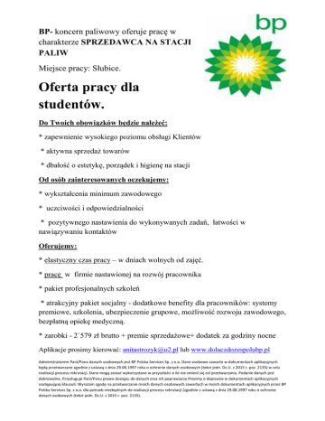 BP- koncern paliwowy oferuje pracę w charakterze SPRZEDAWCA NA STACJI PALIW Miejsce pracy: Słubice. Oferta pracy dla studentów. Do Twoich obowiązków będzie należeć: * zapewnienie wysokiego poziomu obsługi Klientów * aktywna sprzedaż towarów * dbałość o estetykę, porządek i higienę na stacji Od osób zainteresowanych oczekujemy: * wykształcenia minimum zawodowego * uczciwości i odpowiedzialności * pozytywnego nastawienia do wykonywanych zadań, łatwości w nawiązywaniu kontaktów Oferujemy: * elastyczny czas pracy – w dniach wolnych od zajęć. * pracę w firmie nastawionej na rozwój pracownika * pakiet profesjonalnych szkoleń * atrakcyjny pakiet socjalny - dodatkowe benefity dla pracowników: systemy premiowe, szkolenia, ubezpieczenie grupowe, możliwość rozwoju zawodowego, bezpłatną opiekę medyczną. * zarobki - 2`579 zł brutto + premie sprzedażowe+ dodatek za godziny nocne Aplikacje prosimy kierować: [email protected] lub www.dolaczdozespolubp.pl Administratorem Pani/Pana danych osobowych jest BP Polska Services Sp. z o.o. Dane osobowe zawarte w dokumentach aplikacyjnych będą przetwarzane zgodnie z ustawą z dnia 29.08.1997 roku o ochronie danych osobowych (tekst jedn. Dz.U. z 2015 r. poz. 2135) w celu realizacji procesu rekrutacji. Dane mogą zostać wykorzystane w przyszłości o ile nie zmieni się cel przetwarzania. Podanie danych jest dobrowolne. Przysługuje Pani/Panu prawo dostępu do danych oraz ich poprawiania.Prosimy o dopisanie w dokumentach aplikacyjnych następującej klauzuli: Wyrażam zgodę na przetwarzanie moich danych osobowych zawartych w moich dokumentach aplikacyjnych przez BP Polska Services Sp. z o.o. dla potrzeb niezbędnych do realizacji procesu rekrutacji (zgodnie z ustawą z dnia 29.08.1997 roku o ochronie danych osobowych (tekst jedn. Dz.U. z 2015 r. poz. 2135).