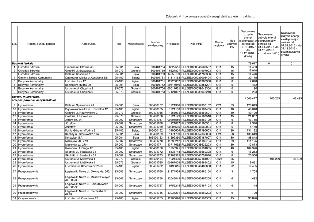 Załącznik Nr 1 do umowy sprzedaży energii elektrycznej nr … z dnia …. L.p. Rodzaj punktu poboru Budynki i lokale 1 Ośrodek Zdrowia 2 Ośrodek Zdrowia 3 Ośrodek Zdrowia 4 Gminny Zakład Komunalny 5 Budynek komunalny 6 Budynek komunalny 7 Budynek komunalny 8 Budynek komunalny Adres/ulica Gieczno ul. Główna 43 Grotniki ul. Brzozowa 23 Biała ul. Kościelna 1 Dąbrówka Wielka ul.Kościelna 6/8 Lućmierz Las 17 Besiekierz Rudny 20 Ustronie ul. Chopina 2 Ustronie ul. Chopina 9 kod Miejscowość 95-001 95-073 95-001 95-100 95-100 95-001 95-073 95-073 Biała Grotniki Biała Zgierz Zgierz Biała Grotniki Grotniki Numer ewidencyjny 800401764 800401759 800401763 800401761 800401751 800401752 800401754 800401753 Nr licznika Kod PPE Grupa taryfowa 8622551 6627827 14050139 11814153 12220037 29616949 60517661 27124807 PLLZED000046569507 PLLZED000041907903 PLLZED000041786306 PLLZED000039006404 PLLZED000041363306 PLLZED000040354201 PLLZED000039043304 PLLZED000039043210 C11 C11 C11 C11 G11 G11 G11 G11 Szacowane zużycie energii Moc elektrycznej w umowna okresie od kW 01.01.2015 r. do 31.12.2016 r. (kWh) 15 15 15 15 0 0 0 0 Obiekty (hydrofornie, przepompowenia, oczyszczalnia) 9 10 11 12 13 14 15 16 17 18 19 20 21 22 23 24 25 26 Hydrofornia Hydrofornia Hydrofornia Hydrofornia Hydrofornia Hydrofornia Hydrofornia Hydrofornia Hydrofornia Hydrofornia Hydrofornia Hydrofornia Hydrofornia Hydrofornia Hydrofornia Hydrofornia Hydrofornia Hydrofornia 27 Przepompownia 28 Przepompownia 29 Przepompownia 30 Przepompownia 31 Oczyszczalnia 79 677 14 483 17 040 14 476 30 175 2 678 472 90 263 1 046 417 Biała ul. Spacerowa 2A Dąbrówka Wielka ul. Kościelna 12 Grotniki ul. Rozrywkowa 3 Grotniki ul. Lipowa 42 Janów dz. 24 Józefów Józefów Kania Góra ul. Wodna 2 Kębliny ul. Strykowska 17A Kotowice 16A Maciejów dz. 27/4 Maciejów dz. 27/4 Rosanów ul. Długa 17 Skotniki ul. Strażacka 31 Skotniki ul. Strażacka 31 Ustronie ul. Myśliwska 1 Ustronie ul. Myśliwska 1 Lućmierz ul. Klonowa dz.255/9 95-001 95-100 95-073 95-073 95-002 95-002 95-002 95-100 95-001 95-001 95-002 95-002 95-100 95-002 95-002 95-073 95-073 95-100 Biała Zgierz Grotniki Grotniki Smardzew Smardzew Smardzew Zgierz Biała Biała Smardzew Smardzew Zgierz Smardzew Smardzew Grotniki Grotniki Zgierz 806400157 806400155 800401766 806400156 800401767 800401768 800401769 806400152 806400159 806400153 800401770 800401771 806400158 800401772 800401773 806400154 800401765 800401762 1221366 1221163 1253934 1221179 00205589 1221087 00205585 3190604 1171769 11592350 11598212 13717692 1253941 8436748 12109583 1221436 00167409 3190615 PLLZED000057333102 PLLZED000057187405 PLLZED000046569601 PLLZED000057187510 PLLZED000046569109 PLLZED000041166301 PLLZED000046569004 PLLZED000057190603 PLLZED000057335003 PLLZED000057187007 PLLZED000041189704 PLLZED000038629203 PLLZED000057191805 PLLZED000046569308 PLLZED000040751010 PLLZED000057181901 PLLZED000046569402 PLLZED000046406608 C21 C11 C11 C11 C11 C11 C11 C11 C21 C11 C11 C11 C11 C11 C11 C22b C11 C11 63 18 39 15 6 6 6 39 58 30 39 39 40 6 6 55 15 22 126 649 48 048 49 190 21 057 43 785 2 340 5 150 131 122 138 649 88 848 111 125 12 873 102 926 16 283 20 956 Łagiewniki Nowe ul. Okólna dz. 643/1 95-002 Smardzew 800401760 21274958 PLLZED000043485104 C11 3 1 705 95-002 Smardzew 800401758 12045043 PLLZED000043467208 C11 6 492 95-002 Smardzew 800401757 9759215 PLLZED000043467103 C11 6 148 95-002 Smardzew 800401756 13934271 PLLZED000046569203 C11 9 709 95-100 Zgierz 800401755 12905098 PLLZED000043107503 C11 15 95 826 Łagiewniki Nowe ul. Maków Polnych dz. 686/39 Łagiewniki Nowe ul. Smardzewska dz. 686/38 Łagiewniki Nowe ul. Piętnastki dz. 675/2 Lućmierz ul. Osiedlowa 23 9 051 19 485 Szacowane zużycie energii elektrycznej w okresie od 01.01.2015 r. do 31.12.2016 r. szczytowa (kWh) Szacowane zużycie energii elektrycznej w okresie od 01.01.2015 r. do 31.12.2016 r. pozaszczytowa (kWh) 0 0 105 239 48 499 105 239 48 499