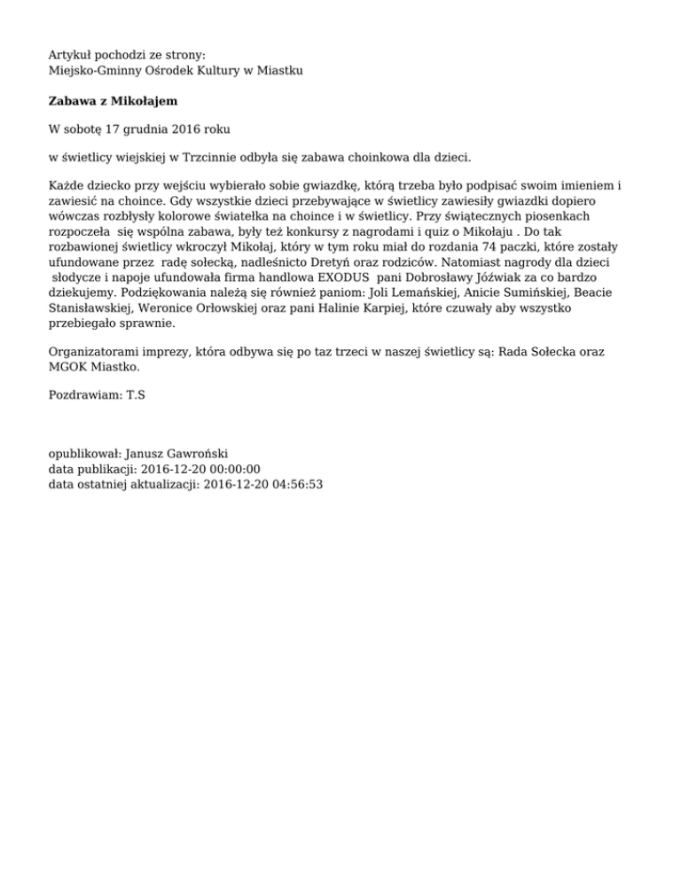 Artykuł pochodzi ze strony: Miejsko-Gminny Ośrodek Kultury w Miastku Zabawa z Mikołajem W sobotę 17 grudnia 2016 roku w świetlicy wiejskiej w Trzcinnie odbyła się zabawa choinkowa dla dzieci. Każde dziecko przy wejściu wybierało sobie gwiazdkę, którą trzeba było podpisać swoim imieniem i zawiesić na choince. Gdy wszystkie dzieci przebywające w świetlicy zawiesiły gwiazdki dopiero wówczas rozbłysły kolorowe światełka na choince i w świetlicy. Przy świątecznych piosenkach rozpoczeła się wspólna zabawa, były też konkursy z nagrodami i quiz o Mikołaju . Do tak rozbawionej świetlicy wkroczył Mikołaj, który w tym roku miał do rozdania 74 paczki, które zostały ufundowane przez radę sołecką, nadleśnicto Dretyń oraz rodziców. Natomiast nagrody dla dzieci słodycze i napoje ufundowała firma handlowa EXODUS pani Dobrosławy Jóźwiak za co bardzo dziekujemy. Podziękowania należą się również paniom: Joli Lemańskiej, Anicie Sumińskiej, Beacie Stanisławskiej, Weronice Orłowskiej oraz pani Halinie Karpiej, które czuwały aby wszystko przebiegało sprawnie. Organizatorami imprezy, która odbywa się po taz trzeci w naszej świetlicy są: Rada Sołecka oraz MGOK Miastko. Pozdrawiam: T.S opublikował: Janusz Gawroński data publikacji: 2016-12-20 00:00:00 data ostatniej aktualizacji: 2016-12-20 04:56:53