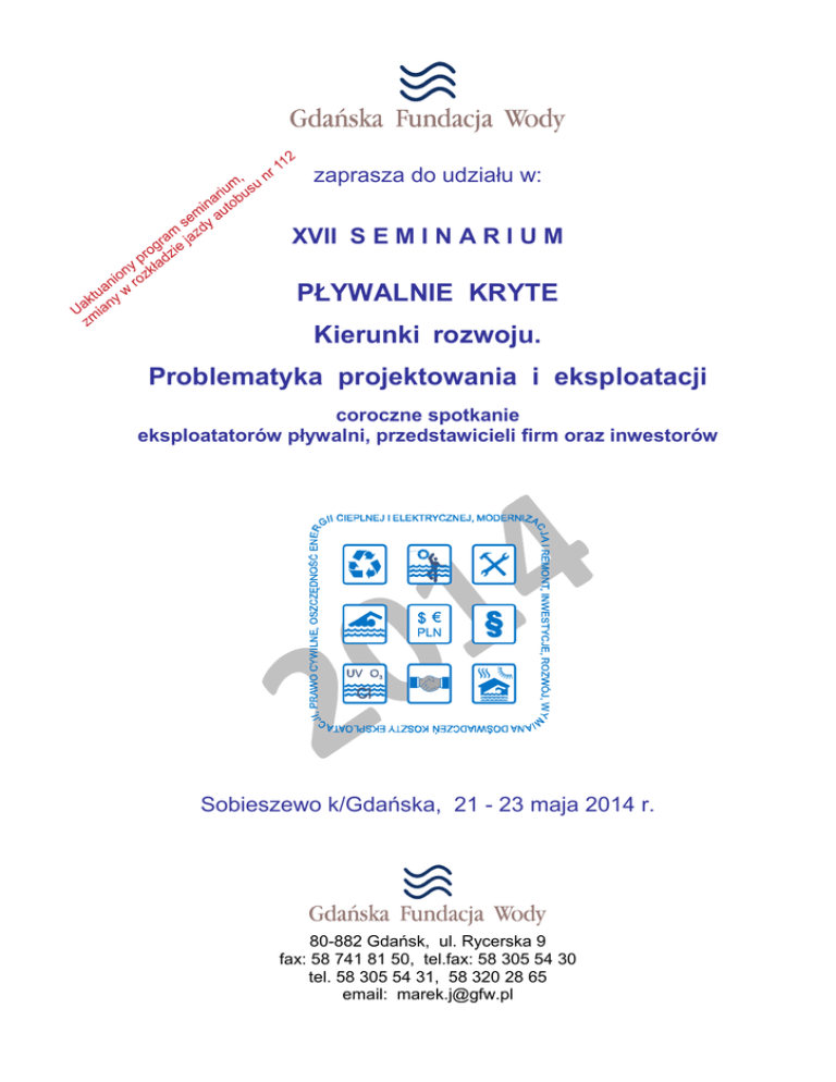 zaprasza do udziału w: XVII S E M I N A R I U M PŁYWALNIE KRYTE Kierunki rozwoju. Problematyka projektowania i eksploatacji coroczne spotkanie eksploatatorów pływalni, przedstawicieli firm oraz inwestorów Sobieszewo k/Gdańska, 21 - 23 maja 2014 r. 80-882 Gdańsk, ul. Rycerska 9 fax: 58 741 81 50, tel.fax: 58 305 54 30 tel. 58 305 54 31, 58 320 28 65 email: [email protected] Gdańska Fundacja Wody Z wielką przyjemnością zapraszamy Państwa do udziału w XVII Seminarium - spotkaniu, które co roku odbywa się w drugiej połowie maja i stało się miejscem uzyskiwania praktycznej wiedzy i wymiany informacji. Ponad szesnaście lat seminarium jest miejscem, które gromadzi wielu specjalistów z terenu całego kraju: eksploatatorów, projektantów i przedstawicieli firm działających w branŜy pływalni krytych. Podczas jego trwania, uczestnicy wzajemnie dzielą się doświadczeniem i wiedzą nabytą poprzez lata działalności zawodowej. Jako organizatorzy, dokładamy starań by obecna edycja seminarium swoim programem nawiązywała do poprzednich, gdyŜ „nie modyfikuje się dobrego i sprawdzonego”. W tym roku utrzymana będzie tematyka ekonomii eksploatacji, nie zabraknie równieŜ informacji o nowych, bądź mało rozpowszechnionych technologiach uzdatniania wody. Nie mniej waŜną tematyką są nowe uregulowania prawne odnoszące się do bezpieczeństwa kąpiących się, równieŜ jak co roku, nie zabraknie tematów z zakresu prawa cywilnego. Tradycją seminarium jest wymiana doświadczeń zawodowych, pozwalająca w praktyce wprowadzić dobre wzorce zastosowane gdzie indziej. Chcielibyśmy, aŜeby te doroczne spotkania stały się miejscem wypracowywania najlepszych praktyk w projektowaniu i eksploatacji obiektów basenowych - dlatego teŜ program seminarium uwzględnia sugestie uczestników naszych spotkań o poszerzanie wymiany praktycznych doświadczeń, tak przydatnych w codziennej pracy. Odnośnie do miejsca odbywania się seminarium, to po zasięgnięciu Państwa opinii - w tym roku ponownie zapraszamy do Centrum Konferencyjnego "Orle" w Sobieszewie k./Gdańska. Zapraszamy! PROGRAM XVII SEMINARIUM 21 maja 2014 r. (środa) 900- 910 Przywitanie, wprowadzenie do tematyki seminarium. 10 00 9 -10 Uboczne produkty dezynfekcji wody basenowej Gdańska Fundacja Wody Małgorzata Prędota Gdańska Fundacja Wody 1000-1040 Dwutlenek chloru jako środek dezynfekcyjny. Małgorzata Prędota Gdańska Fundacja Wody 1040-1120 Optymalizacji procesu uzdatniania wody basenowej według WAPOTEC® SYSTEM 20 40 przerwa 40 20 Udoskonalenie procesu dezynfekcji oraz obniŜanie poziomu chloru związanego (chloramin) w wodzie basenowej – rozwiązania proponowane przez Astralpool. 11 -11 11 -12 1220-1300 Wypadki poprzez poślizgnięcia - problem i skuteczne rozwiązanie. Marian Dudko Wapotec Polska Lidia Konopka Fluidra Polska Sp. z o.o. Arkadiusz Bonder C.T. Service Sp. z o.o. 1300-1400 obiad 1400-1430 Ozonatory ciśnieniowe - energooszczędna alternatywa dla systemów podciśnieniowych. Zbigniew Ludwiczak Krzysztof Karkosza ProMinent Dozotechnika Sp. z o.o. 30 00 14 -15 00 00 15 -16 Marek Straczycki . DINOTEC Polska s.c., Wrocław Działania przygotowawcze do remontu systemu wentylacji w Kompleksie Rekreacyjno-Sportowym FALA w Goleniowie. Agnieszka Kulinicz Kompleks Rekreacyjno-Sportowy „Fala” w Goleniowie 1600-1615 przerwa 1615-1700 Niekonwencjonalne źródła ciepła - ryzyko nie osiągnięcia zamierzonych efektów. Sobieszewo k/Gdańska 21 – 23 maja 2014 r. Zbigniew Wnukowicz ELBAS, Warszawa Gdańska Fundacja Wody 1700-1730 Wprowadzanie systemu BMS-SCADA na pływalnię. Sterowanie kosztami eksploatacji obiektu. 30 00 17 -18 Samodzielne wytwarzanie energii elektrycznej oraz energii cieplnej gwarancją oszczędności i bezpieczeństwa eksploatacji obiektów basenowych. Andrzej Paczkowski APACZ, Gdynia Michał Rodak Centrum Elektroniki Stosowanej CES sp. z o.o. Kraków 1830 kolacja 22 maja 2014 r. (czwartek) 900 Wprowadzenie do tematyki dnia. 900-1000 Outsourcing w praktyce. Dlaczego nie w KCRiS Oaza? Wojciech Kiełbasiewicz KCRiS Oaza, Kórnik 1000-1045 Zwiększenie funkcjonalności pływalni poprzez wyposaŜenie obiektu w pomost wypłycający. Doświadczenia z etapu przygotowania i realizacji inwestycji. Mirosław Rak Spółka Celowa Wałbrzyskie Centrum Sportowo - Rekreacyjne „AQUA - ZDRÓJ” Sp. z o.o. 1045-1100 przerwa 1100-1130 Uzupełniające wyposaŜenie zaplecza oraz hali basenowej spełniające wymogi funkcjonalne oraz sanitarne. Raimondas Matijošius Donatas Vasiliauskas HISPACK BALTIC JSC Lietuva 1130-1210 Spełnienie wymogów technologicznych przy zastosowaniu Tomasz Witczak produktów chemii budowlanej SOPRO Polska - najczęstsze powody SOPRO Polska, Warszawa utraty udzielanej gwarancji. 1210-1240 Cena czy jakość i trwałość prac remontowych na krytej pływalni? Najmniej kosztowny remont. Doświadczenia MCSiR w Płońsku. Zbigniew Dylewski MCSiR w Płońsku 1240-1330 Obiad 1400 Wyjazd studyjny: wizyta na pływalni Centrum Sportu Akademickiego Politechniki Gdańskiej, połączona z pokazem pracy odkurzaczy wodnych firmy MARINER. 2030 Powrót do hotelu Orle 23 maja 2014 r. (piątek) 900 Wprowadzenie do tematyki dnia. 910- 1020 Kontrole pływalni krytych. Rodzaje. Uprawnienia kontrolujących. WspółzaleŜności. Michał Behnke Kancelaria Radców Prawnych CIC, Gdynia 1020-1035 przerwa 1035-1145 Zatrudnianie ratowników wodnych. Weryfikacja prawidłowości dokumentów ratowników wodnych po zmianie 1 stycznia 2014 stanu prawnego w tym zakresie. 1145-1230 WspomoŜenie pracy ratownika na pływalni poprzez zastosowanie monitoringu video. Dokumentowanie zdarzeń. Jarosław J. Rypniewski Fundacja Ratownictwa „Bezpieczni nad wodą” Jarosław J. Rypniewski Fundacja Ratownictwa „Bezpieczni nad wodą” 1230 Podsumowanie seminarium. Obiad Gdańska Fundacja Wody zastrzega moŜliwość niewielkich zmian oraz poszerzenia programu seminarium. Sobieszewo k/Gdańska 21 – 23 maja 20