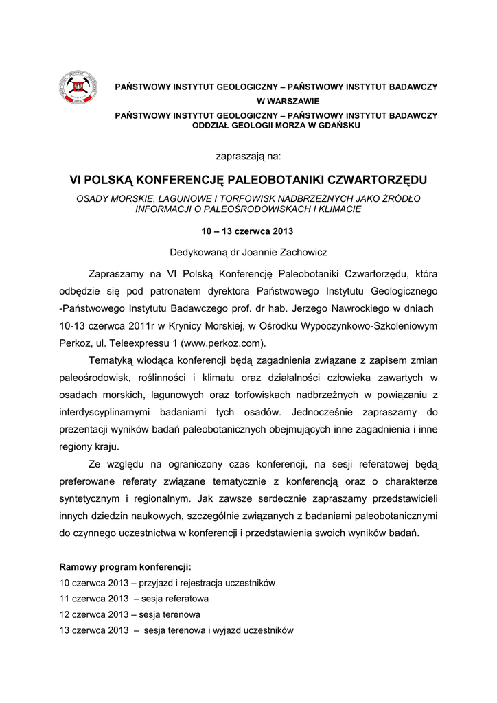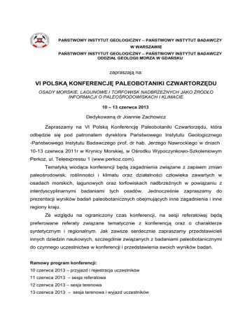 PAŃSTWOWY INSTYTUT GEOLOGICZNY – PAŃSTWOWY INSTYTUT BADAWCZY W WARSZAWIE PAŃSTWOWY INSTYTUT GEOLOGICZNY – PAŃSTWOWY INSTYTUT BADAWCZY ODDZIAŁ GEOLOGII MORZA W GDAŃSKU zapraszają na: VI POLSKĄ KONFERENCJĘ PALEOBOTANIKI CZWARTORZĘDU OSADY MORSKIE, LAGUNOWE I TORFOWISK NADBRZEŻNYCH JAKO ŹRÓDŁO INFORMACJI O PALEOŚRODOWISKACH I KLIMACIE 10 – 13 czerwca 2013 Dedykowaną dr Joannie Zachowicz Zapraszamy na VI Polską Konferencję Paleobotaniki Czwartorzędu, która odbędzie się pod patronatem dyrektora Państwowego Instytutu Geologicznego -Państwowego Instytutu Badawczego prof. dr hab. Jerzego Nawrockiego w dniach 10-13 czerwca 2011r w Krynicy Morskiej, w Ośrodku Wypoczynkowo-Szkoleniowym Perkoz, ul. Teleexpressu 1 (www.perkoz.com). Tematyką wiodąca konferencji będą zagadnienia związane z zapisem zmian paleośrodowisk, roślinności i klimatu oraz działalności człowieka zawartych w osadach morskich, lagunowych oraz torfowiskach nadbrzeżnych w powiązaniu z interdyscyplinarnymi badaniami tych osadów. Jednocześnie zapraszamy do prezentacji wyników badań paleobotanicznych obejmujących inne zagadnienia i inne regiony kraju. Ze względu na ograniczony czas konferencji, na sesji referatowej będą preferowane referaty związane tematycznie z konferencją oraz o charakterze syntetycznym i regionalnym. Jak zawsze serdecznie zapraszamy przedstawicieli innych dziedzin naukowych, szczególnie związanych z badaniami paleobotanicznymi do czynnego uczestnictwa w konferencji i przedstawienia swoich wyników badań. Ramowy program konferencji: 10 czerwca 2013 – przyjazd i rejestracja uczestników 11 czerwca 2013 – sesja referatowa 12 czerwca 2013 – sesja terenowa 13 czerwca 2013 – sesja terenowa i wyjazd uczestników Przewidywany koszt uczestnictwa 700 PLN. Opłata obejmuje: noclegi, wyżywienie, sesje terenowe, materiały konferencyjne oraz spotkanie towarzyskie. Kwotę wysokości 700 PLN należy wpłacić do 30 kwietnia 2013r na konto: PAŃSTWOWY INSTYTUT GEOLOGICZNY – PAŃSTWOWY INSTYTUT BADAWCZY Rakowiecka 4, 00-975 Warszawa Bank PeKaO S.A. 46124062471111000049789654 z dopiskiem VI Konferencja Paleobotaniki Termin nadsyłania streszczeń: referatów do 3 stron i posterów (1 strona) do dnia 5 KWIETNIA 2013 . Zgłoszenia i streszczenia prosimy przysyłać na adres: Mgr Izabela Olczak-Dusseldorp Państwowy Instytut Geologiczny, Rakowiecka 4, 00-975 Warszawa e-mail: [email protected] W imieniu komitetu organizacyjnego serdecznie zapraszamy do udziału w konferencji. dr Hanna Winter PIG-PIB Warszawa dr hab. Szymon Uścinowicz prof. PIG-PIB Oddział Geologii Morza Gdańsk dr Grażyna Miotk-Szpiganowicz PIG-PIB Oddział Geologii Morza Gdańsk Mgr Izabela Olczak-Dusseldorp PIG-PIB Warszawa VI POLSKA KONFERENCJA PALEOBOTANIKI CZWARTORZĘDU OSADY MORSKIE, LAGUNOWE I TORFOWISK NADBRZEŻNYCH JAKO ŹRÓDŁO INFORMACJI O PALEOŚRODOWISKACH I KLIMACIE 10 – 13 czerwca 2013 ZGŁOSZENIE UCZESTNICTWA Imię i nazwisko:............................................................................................................................ Tytuł i stopień naukowy:............................................................................................................... Instytucja:...................................................................................................................................... Adres do korespondencji:.............................................................................................................. ....................................................................................................................................................... ....................................................................................................................................................... Telefon/fax, e-mail............................................ ........................................................................... Zgłaszam: referat poster Autorzy/autor:............................................................................................................................... Tytuł:............................................................................................................................................. ....................................................................................................................................................... ....................................................................................................................................................... Prosimy o powiadomienie wszystkich zainteresowanych Prosimy o wypełnienie i odesłanie poniższego formularza, niezbędnego do wystawienia faktur. Imię i nazwisko Adres NIP