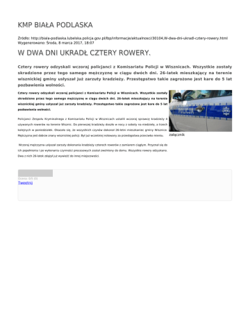 KMP BIAŁA PODLASKA Źródło: http://biala-podlaska.lubelska.policja.gov.pl/lbp/informacje/aktualnosci/30104,W-dwa-dni-ukradl-cztery-rowery.html Wygenerowano: Środa, 8 marca 2017, 18:07 W DWA DNI UKRADŁ CZTERY ROWERY. Cztery rowery odzyskali wczoraj policjanci z Komisariatu Policji w Wisznicach. Wszystkie zostały skradzione przez tego samego mężczyznę w ciągu dwóch dni. 26-latek mieszkający na terenie wisznickiej gminy usłyszał już zarzuty kradzieży. Przestępstwo takie zagrożone jest kare do 5 lat pozbawienia wolności. Cztery rowery odzyskali wczoraj policjanci z Komisariatu Policji w Wisznicach. Wszystkie zostały skradzione przez tego samego mężczyznę w ciągu dwóch dni. 26-latek mieszkający na terenie wisznickiej gminy usłyszał już zarzuty kradzieży. Przestępstwo takie zagrożone jest kare do 5 lat pozbawienia wolności. Policjanci Zespołu Kryminalnego z Komisariatu Policji w Wisznicach ustalili wczoraj sprawcę kradzieży 4 używanych rowerów na terenie Wisznic. Do pierwszej kradzieży doszło w nocy z soboty na niedzielę, a trzech kolejnych w poniedziałek. Okazało się, że wszystkich czynów dokonał 26-letni mieszkaniec gminy Wisznice. Mężczyzna jest dobrze znany wisznickiej policji. Był już wcześniej notowany za przestępstwa przeciwko mieniu. Wczoraj mężczyzna usłyszał zarzuty dokonania kradzieży czterech rowerów z zamiarem ciągłym. Przyznał się do ich popełnienia i po wykonaniu czynności procesowych został zwolniony do domu. Wszystkie rowery odzyskano. Dwa z nich 26-latek zdążył już wywieźć do innej miejscowości. Ocena: 0/5 (0) Tweetnij załącznik
