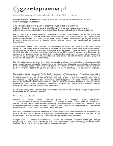 Gazeta Prawna Nr 67 (1685) wtorek, 4 kwietnia 2006 r. > Biznes PARKI PRZEMYSŁOWE/W CIĄGU 9 MIESIĘCY SFINANSOWANO 60 PROJEKTÓW Gminy ściągają inwestorów ■ W Polsce działa juŜ 46 parków przemysłowych i technologicznych ■ Gminy kuszą inwestorów ulgami podatkowymi, a same zyskują miejsca pracy ■ Parki są coraz powaŜniejszym konkurentem dla specjalnych stref ekonomicznych Od początku roku w Polsce powstało kilka nowych parków przemysłowych i technologicznych. Na listę wpisały się m.in. Gdański Park Naukowo-Technologiczny i Podwarszawski Park Przemysłowy Grodzisk Mazowiecki. W pierwszym uczelnie mają wspierać przedsiębiorców w zastosowaniu innowacji technologicznych, w drugim miasto oferuje tereny, by przyciągnąć do regionu inwestorów. W tworzeniu parków coraz bardziej zainteresowane są samorządy lokalne – bo dzięki temu powstają nowe miejsca pracy. Gminy liczą nie tylko na powaŜnych inwestorów, ale i unijne granty. Konkurując ze specjalnymi strefami ekonomicznymi, samorządy mają konkretny argument. W strefach ulgi dla większości inwestorów skończą się po 2011 roku. W parkach przedsiębiorcy nie otrzymują co prawda prawa do zwolnień z podatku dochodowego czy subwencji za tworzenie miejsc pracy, ale mogą liczyć na ulgi udzielane przez gminy i to bezterminowo. Są to na przykład zwolnienia od podatku od nieruchomości. Nic więc dziwnego, Ŝe zarówno firmy jak i samorządy lokalne z niecierpliwością wyglądają czwartej rundy przyjmowania wniosków (kieruje się je do Ministerstwa Gospodarki) o dotacje na tworzenie parków. Podczas trzech poprzednich rund (październik 2004 oraz maj i czerwiec 2005) na rozruch parków przyznano łącznie 562,1 mln zł zarówno z budŜetu państwa, jak i ze środków unijnych. Najwięcej środków otrzymał Płocki Park Przemysłowo-Technologiczny. Przedsięwzięcie, które powstało z inicjatywy PKN Orlen, najbogatszej firmy w Polsce, i władz samorządowych Płocka, dofinansowano kwotą 39,37 mln zł. Działa tam juŜ 12 firm z branŜy handlowej, budowlanej, informatycznej, logistycznej czy chemicznej, zatrudniających 120 osób. Wkrótce powstanie wytwórnia wyrobów chemicznych firmy PCC Rokita. Koszt jej budowy wyniesie 40 mln zł. Tlenek etylenu dla fabryki Rokity rurociągiem ma dostarczać PKN Orlen, koncern uzbroi równieŜ teren w niezbędne media. Wartość umowy sięga 350 mln zł. W Policach amerykański koncern Becco zainwestuje ok. 92 mln zł w budowę fabryki komponentów do biopaliw. Firma zatrudni 200 osób. To nie fabryka obuwia Pytanie o realne efekty działania parku nie wszędzie budzi entuzjazm. – To nie jest fabryka obuwia czy makaronu – to wymaga lat pracy – mówi Tadeusz Kłaczkowski, prezes zarządu Park Naukowo-Technologiczny Polska-Wschód w Suwałkach. Pierwszy etap funkcjonowania parku – etap inkubacji – zajmie 3 lata (2005-2007). Od grudnia ub.r. na terenie parku działają 3 firmy, które zatrudniają razem 19 osób. Na pozór większymi sukcesami moŜe się poszczycić Warszawski Park Przemysłowy. Funkcjonuje w nim aŜ 67 firm. Są to jednak w większości przedsiębiorstwa małe, związane z handlem, a nie przemysłem. Głównie wietnamskie i chińskie handlujące tekstyliami i obuwiem. Kolejny park – Kozielsko-Kędzierzyński – działa na terenach zakładów azotowych. Dotąd przyciągnął 17 firm, które zatrudniają 125 osób. Nieruchomościami interesują się takŜe firmy zagraniczne, w tym np. wykorzystujące technologię laserową. Pieniądze są waŜne Czy parki powinny być dochodowe? – Dla tych, którzy inwestują w parkach, oczywiście tak. Natomiast dla firm czy instytucji zarządzających parkiem działalność ta powinna być na poziomie kosztów (non-profit) – uwaŜa Arkadiusz KręŜel, prezes zarządu Agencji Rozwoju Przemysłu. Przypomina, Ŝe w Unii Europejskiej specjalne strefy ekonomiczne są produktem zabronionym, natomiast parki przemysłowe są uwaŜane za twór naturalny. – Parki przemysłowe są elementem dopuszczalnego instrumentu prorozwojowego, w ramach którego państwo się dokłada, aby stworzyć dobre warunki inwestorom. One z czasem po 2017 r. wyprą strefy – konkluduje Arkadiusz KręŜel. WSPIERANIE INWESTYCJI Parki przemysłowe i technologiczne zostały po raz pierwszy w Polsce zdefiniowane w ustawie o finansowym wspieraniu inwestycji 20 marca 2002 r. (Dz.U. z 2002 r. nr 41, poz. 363, uwzględnia Dz.U. 2005 r. 249, poz. 2104). Zgodnie z nią parkiem przemysłowym jest zespół nieruchomości z infrastrukturą techniczną po restrukturyzowanym lub likwidowanym przedsiębiorcy, utworzony na podstawie umowy cywilnoprawnej, której jedną ze stron jest jednostka samorządu terytorialnego. ZałoŜenia parku technologicznego są podobne, tylko Ŝe w tym przypadku chodzi przede wszystkim o przepływ wiedzy i technologii pomiędzy jednostkami naukowymi a przedsiębiorcami. Autor artykułu: Tadeusz Barzdo [email protected]