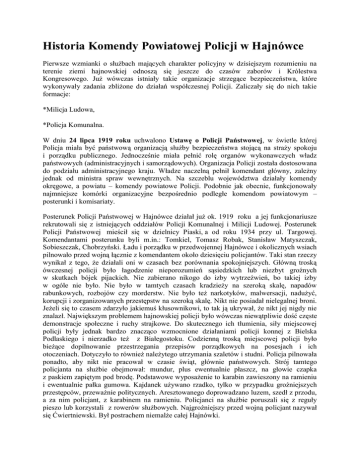 Historia Komendy Powiatowej Policji w Hajnówce Pierwsze wzmianki o służbach mających charakter policyjny w dzisiejszym rozumieniu na terenie ziemi hajnowskiej odnoszą się jeszcze do czasów zaborów i Królestwa Kongresowego. Już wówczas istniały takie organizacje strzegące bezpieczeństwa, które wykonywały zadania zbliżone do działań współczesnej Policji. Zaliczały się do nich takie formacje: *Milicja Ludowa, *Policja Komunalna. W dniu 24 lipca 1919 roku uchwalono Ustawę o Policji Państwowej, w świetle której Policja miała być państwową organizacją służby bezpieczeństwa stojącą na straży spokoju i porządku publicznego. Jednocześnie miała pełnić rolę organów wykonawczych władz państwowych (administracyjnych i samorządowych). Organizacja Policji została dostosowana do podziału administracyjnego kraju. Władze naczelną pełnił komendant główny, zależny jednak od ministra spraw wewnętrznych. Na szczeblu województwa działały komendy okręgowe, a powiatu – komendy powiatowe Policji. Podobnie jak obecnie, funkcjonowały najmniejsze komórki organizacyjne bezpośrednio podległe komendom powiatowym – posterunki i komisariaty. Posterunek Policji Państwowej w Hajnówce działał już ok. 1919 roku a jej funkcjonariusze rekrutowali się z istniejących oddziałów Policji Komunalnej i Milicji Ludowej. Posterunek Policji Państwowej mieścił się w dzielnicy Piaski, a od roku 1934 przy ul. Targowej. Komendantami posterunku byli m.in.: Tomkiel, Tomasz Robak, Stanisław Matyszczak, Sobieszczak, Chobrzyński. Ładu i porządku w przedwojennej Hajnówce i okolicznych wsiach pilnowało przed wojną łącznie z komendantem około dziesięciu policjantów. Taki stan rzeczy wynikał z tego, że działali oni w czasach bez porównania spokojniejszych. Główną troską ówczesnej policji było łagodzenie nieporozumień sąsiedzkich lub niezbyt groźnych w skutkach bójek pijackich. Nie zabierano nikogo do izby wytrzeźwień, bo takiej izby w ogóle nie było. Nie było w tamtych czasach kradzieży na szeroką skalę, napadów rabunkowych, rozbojów czy morderstw. Nie było też narkotyków, malwersacji, nadużyć, korupcji i zorganizowanych przestępstw na szeroką skalę. Nikt nie posiadał nielegalnej broni. Jeżeli się to czasem zdarzyło jakiemuś kłusownikowi, to tak ją ukrywał, że nikt jej nigdy nie znalazł. Największym problemem hajnowskiej policji było wówczas niewątpliwie dość częste demonstracje społeczne i ruchy strajkowe. Do skutecznego ich tłumienia, siły miejscowej policji były jednak bardzo znacząco wzmocnione działaniami policji konnej z Bielska Podlaskiego i nierzadko też z Białegostoku. Codzienną troską miejscowej policji było bieżące dopilnowanie przestrzegania przepisów porządkowych na posesjach i ich otoczeniach. Dotyczyło to również należytego utrzymania szaletów i studni. Policja pilnowała ponadto, aby nikt nie pracował w czasie świąt, głównie państwowych. Strój tamtego policjanta na służbie obejmował: mundur, plus ewentualnie płaszcz, na głowie czapka z paskiem zapiętym pod brodę. Podstawowe wyposażenie to karabin zawieszony na ramieniu i ewentualnie pałka gumowa. Kajdanek używano rzadko, tylko w przypadku groźniejszych przestępców, przeważnie politycznych. Aresztowanego doprowadzano luzem, szedł z przodu, a za nim policjant, z karabinem na ramieniu. Policjanci na służbie poruszali się z reguły pieszo lub korzystali z rowerów służbowych. Najgroźniejszy przed wojną policjant nazywał się Ćwiertniewski. Był postrachem niemalże całej Hajnówki. Milicja Obywatelska - W lipcu 1944 roku po wyzwoleniu Hajnówki ukonstytuowała się nowa władza lokalna, która powołała Komendę Milicji Obywatelskiej w Hajnówce w miejsce dotychczas istniejącej Komendy Garnizonu Wojska Polskiego. Ówczesnym Komendantem Milicji Obywatelskiej w Hajnówce pierwszym w historii powojennej, został Wiktor Haring. Do służby w milicji jako pierwsi zgłosili się: Józef Litwińczuk, Stefan Szpakowicz, Seweryn Uszyński, Jan Wydzierzecki. Początkowo milicjanci chodzili w ubraniach cywilnych, gdyż brak było umundurowania. W dniu 7 października 1944 roku Polski Komitet Wyzwolenia Narodowego uchwalił dekret o utworzeniu Milicji Obywatelskiej, ustalający zasady działania i kompetencje świeżo utworzonych organów ładu i porządku nowego ustroju. W styczniu 1945 r. dowódcą Komendy MO został Józef Litwińczuk. Był b. trudny okres, gdyż w terenie powstawały organizacje podziemne: Obywatelska Armia Krajowa - OAK, Wolność i Niezawisłość – WiN, Narodowe Zjednoczenie Wojskowe – NZW. 28 stycznia 1946 r. oddział podziemia w sile 300 ludzi opanował Hajnówkę, atakując z trzech stron. Komendant MO J. Litwińczuk został zamknięty w piwnicy. Komisariat miejski mieścił się w budynku na rogu ul. 1 Maja i Jagiełły do 1963 r. W 1950 r. formy i metody działalności podziemia zmieniły się. Wzrastała ilość przestępstw gospodarczych i kryminalnych, sabotażu, dywersji, podpaleń, pogróżek, kolportażu wrogich państwu ludowemu ulotek i napisów. W związku z tym zmieniły się formy i metody działania organów MO. Do ich zadań należało: ochrona gospodarki narodowej, wykrywanie i zwalczanie przestępstw przeciwko państwu i bezpieczeństwu publicznemu, zwalczanie dywersji ideologicznej. Załoga Posterunku MO w Hajnówce Milicjanci na przeszkoleniu wojskowym KBW w Białymstoku Komendantami posterunku miejskiego byli: 1. 2. 3. 4. 5. 6. 7. 8. Wiktor Haring (1944) Józef Litwińczuk (1945-46), Jan Bukowiec (1946), Jutkiewicz ((1946), Kaczor (1946-48), Czesław Kunygiel (1949-54), Jan Pawlak (1954-57), Stanisław Krzemiński (1957-63) W 1954 r. na mocy uchwały PKWN powstała Komenda Powiatowa MO w Hajnówce posiadająca 30 funkcjonariuszy i 1 samochód. Początkowo mieściła się w dawnym budynku piekarza Proppa na rogu ul. Warszawskiej i Ptaszyńskiego, w 1961 r