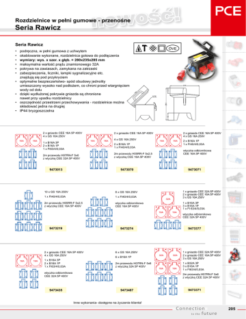 ! ć ś o w no Rozdzielnice w pełni gumowe - przenośne Seria Rawicz Seria Rawicz • 50 10TE 280 • 235 60 • ÖVE 5 • podręczna, w pełni gumowa z uchwytem okablowanie wykonane, rozdzielnica gotowa do podłączenia wymiary: wys. x szer. x głęb. = 280x235x285 mm maksymalna wartość prądu znamionowego 32A pokrywa na zawiasach, zamykana na zatrzaski zabezpieczenia, liczniki, lampki sygnalizacyjne etc. znajdują się pod przykryciem optymalne bezpieczeństwo- spód obudowy jednolity umieszczony wysoko nad podłożem, co chroni przed wtargnięciem wody od dołu dzięki wydłużonej pokrywie gniazda są chronione nawet przy upadku rozdzielnicy oszczędność przestrzeni przechowywania - rozdzielnice można składować jedna na drugiej IP44 bryzgoszczelna 28 • • • • • • 2 x gniazdo CEE 16A 5P 400V 4 x GS 16A 250V 1 x B16A 3P 2 x B16A 1P 1 x FI63/4/0,03A 2 x gniazdo CEE 16A 5P 400V 4 x GS 16A 250V 2 x B16A 1P 1 x FI40/4/0,03A 2m przewodu H07RN-F 5x6 z wtyczką CEE 32A 5P 400V 2m przewodu H05RR-F 5x2,5 z wtyczką CEE 16A 5P 400V 9473013 9473070 10 x GS 16A 250V 8 x GS 16A 250V 1 x FI40/4/0,03A 1 x FI40/4/0,03A 2m przewodu H05RR-F 5x2,5 z wtyczką CEE 16A 5P 400V wtyczka odbiornikowa CEE 16A 5P 400V 2 x gniazdo CEE 16A 5P 400V 4 x GS 16A 250V 2 x B16A 1P 1 x FI40/4/0,03A wtyczka odbiornikowa CEE 16A 5P 400V 9473071 1 x gniazdo CEE 32A 5P 400V 2 x gniazdo CEE 16A 5P 400V 3 x GS 16A 250V 1 x B16A 3P 3 x B16A 1P 1 x FI 63/4/0,03A wtyczka odbiornikowa CEE 32A 5P 400V 9473219 9473274 2 x gniazdo CEE 16A 5P 400V 4 x GS 16A 250V 1 x B16A 3P 2 x B16A 1P 1 x FI63/4/0,03A 6 x GS 16A 250V 6 x B16A 1P 2m przewodu H07RN-F 5x6 z wtyczką 32A 5P 400V wtyczka odbiornikowa CEE 32A 5P 400V 9473435 9473377 1 x gniazdo CEE 32A 5P 400V 2 x gniazdo CEE 16A 5P 400V 3 x GS 16A 250V 1 x B32A 3P 3 x B16A 1P 1 x FI63/4/0,03A 2m przewodu H07RN-F 5x6 z wtyczką CEE 32A 5P 400V 9473487 9473371 Inne wykonania- dostępne na życzenie klienta! Connec tion to the futu re 205