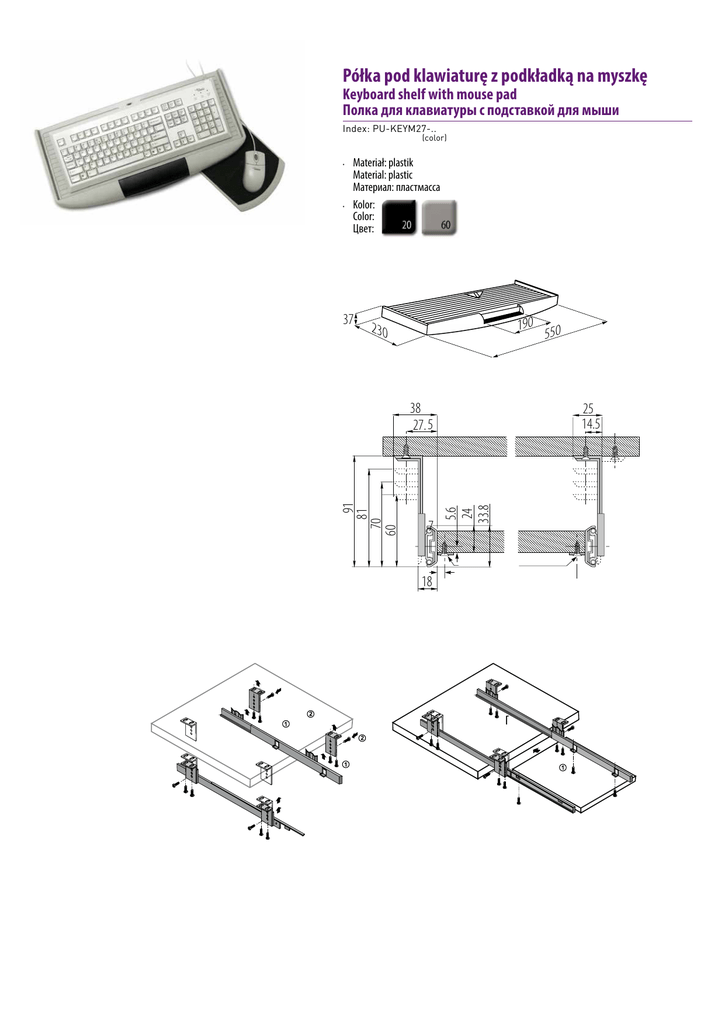 Półka pod klawiaturę z podkładką na myszkę Keyboard shelf with mouse pad Полка для клавиатуры с подставкой для мыши Index: PU-KEYM27-.. (color) Materiał: plastik Material: plastic Материал: пластмасса • Kolor: Color: Цвет: • 37 190 230 7 18 25 14.5 5.6 24 33.8 91 81 70 60 38 27. 5 550