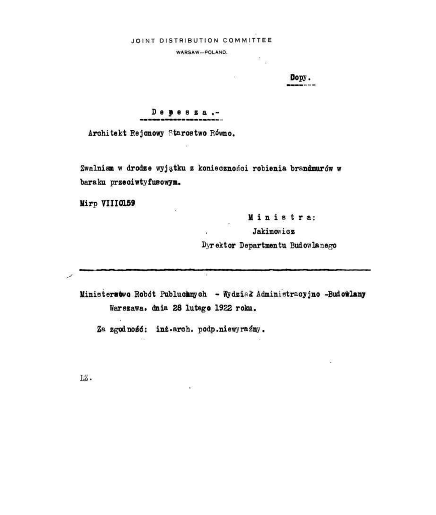 JOINT DISTRIBUTION COMMITTEE WARSAW—POLAND. Dopy. Depesza.Architekt Rejonowy Ptarostwo Rdvmo. Zwalniam w drodze wyjatku z koniecznosoi robienia brandmurdw w baraku przeoiwtyfusowym. Mirp VIII0159 Ministra: Jakimov.icz Dyrektor Department!! Budowlanego Ministenrtwo Robdt Publuoknyoh - llilydziai Administraoyjno -Budoilany Warszawa. dnia 28 lutego 1922 roku. Za zgodno£d: LZ. inz-arch. podp.niewyraz"ny.