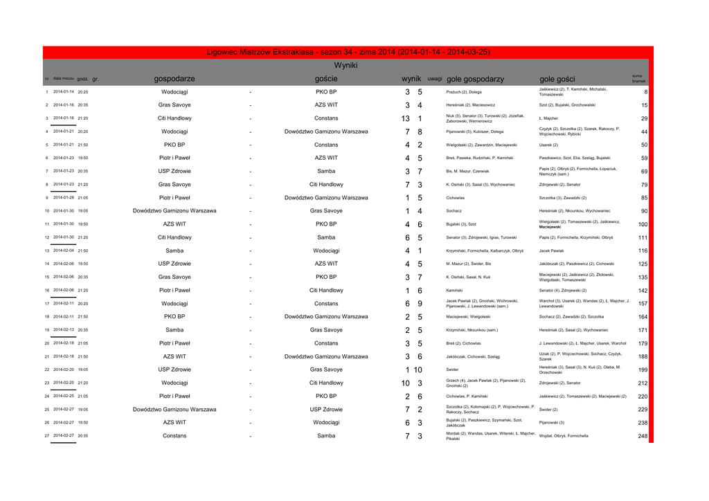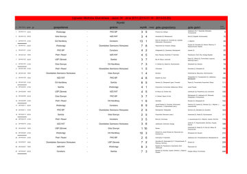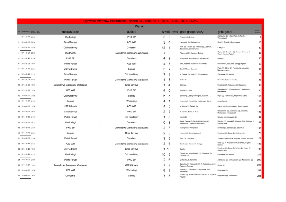 Ligowiec Mistrzów Ekstraklasa - sezon 34 - zima 2014 (2014-01-14 - 2014-03-25) Wyniki nr data meczu godz. gr. gospodarze goście wynik uwagi gole gospodarzy gole gości suma bramek 1 2014-01-14 20:20 Wodociągi - PKO BP 3 5 PraŜuch (2), Dolega Jaśkiewicz (2), T. Kamiński, Michalski, Tomaszewski 2 2014-01-16 20:35 Gras Savoye - AZS WIT 3 4 Hereśniak (2), Maciesowicz Szot (2), Bujalski, Grochowalski 15 1 Niuk (5), Senator (3), Turowski (2), Józefiak, Zaborowski, Wernerowicz Ł. Majcher 29 44 3 2014-01-16 21:20 Citi Handlowy - Constans 13 8 4 2014-01-21 20:20 Wodociągi - Dowództwo Garnizonu Warszawa 7 8 Pijanowski (5), Kubiszer, Dolega CzyŜyk (2), Szczotka (2), Szarek, Rakoczy, P. Wojciechowski, Rybicki 5 2014-01-21 21:50 PKO BP - Constans 4 2 Wielgołaski (2), Zawardzin, Maciejewski Usarek (2) 50 6 2014-01-23 19:50 Piotr i Paweł - AZS WIT 4 5 Breś, Pasieka, Rudziński, P. Kamiński Paszkiewicz, Szot, Elia, Szeląg, Bujalski 59 69 7 2014-01-23 20:35 USP Zdrowie - Samba 3 7 Bis, M. Mazur, Czerwiak Papis (2), Olbryś (2), Formichella, Łopaciuk, Niemczyk (sam.) 8 2014-01-23 21:20 Gras Savoye - Citi Handlowy 7 3 K. Osiński (3), Sasal (3), Wychowaniec Zdrojewski (2), Senator 79 9 2014-01-28 21:05 Piotr i Paweł - Dowództwo Garnizonu Warszawa 1 5 Cichowlas Szczotka (3), Zawadzki (2) 85 10 2014-01-30 19:05 Dowództwo Garnizonu Warszawa - Gras Savoye 1 4 Sochacz Hereśniak (2), Nkounkou, Wychowaniec 90 11 2014-01-30 19:50 AZS WIT - PKO BP 4 6 Bujalski (3), Szot Wielgołaski (2), Tomaszewski (2), Jaśkiewicz, Maciejewski 100 12 2014-01-30 21:20 Citi Handlowy - Samba 6 5 Senator (3), Zdrojewski, Igras, Turowski Papis (2), Formichella, Krzymiński, Olbryś 111 13 2014-02-04 21:50 Samba - Wodociągi 4 1 Krzymiński, Formichella, Kalbarczyk, Olbryś Jacek Pawlak 116 14 2014-02-06 19:50 USP Zdrowie - AZS WIT 4 5 M. Mazur (2), Świder, Bis Jakóbczak (2), Paszkiewicz (2), Cichowski 125 15 2014-02-06 20:35 Gras Savoye - PKO BP 3 7 K. Osiński, Sasal, N. Kuś Maciejewski (2), Jaśkiewicz (2), Złotowski, Wielgołaski, Tomaszewski 135 16 2014-02-06 21:20 Piotr i Paweł - Citi Handlowy 1 6 Kamiński Senator (4), Zdrojewski (2) 142 Warchoł (3), Usarek (2), Wandas (2), Ł. Majcher, J. Lewandowski 157 17 2014-02-11 20:20 Wodociągi - Constans 6 9 Jacek Pawlak (2), Gnoiński, Wichrowski, Pijanowski, J. Lewandowski (sam.) 18 2014-02-11 21:50 PKO BP - Dowództwo Garnizonu Warszawa 2 5 Maciejewski, Wielgołaski Sochacz (2), Zawadzki (2), Szczotka 164 19 2014-02-13 20:35 Samba - Gras Savoye 2 5 Krzymiński, Nkounkou (sam.) Hereśniak (2), Sasal (2), Wychowaniec 171 20 2014-02-18 21:05 Piotr i Paweł - Constans 3 5 Breś (2), Cichowlas J. Lewandowski (2), Ł. Majcher, Usarek, Warchoł 179 Jakóbczak, Cichowski, Szeląg Uziak (2), P. Wojciechowski, Sochacz, CzyŜyk, Szarek 188 Świder Hereśniak (3), Sasal (3), N. Kuś (2), Oleba, M. Orzechowski 199 Zdrojewski (2), Senator 212 21 22 2014-02-18 2014-02-20 21:50 19:05 AZS WIT USP Zdrowie - Dowództwo Garnizonu Warszawa Gras Savoye 23 2014-02-20 21:20 Wodociągi - Citi Handlowy 24 2014-02-25 21:05 Piotr i Paweł - PKO BP 25 2014-02-27 19:05 26 2014-02-27 19:50 27 2014-02-27 20:35 Dowództwo Garnizonu Warszawa AZS WIT Constans - USP Zdrowie Wodociągi Samba 3 6 1 10 10 3 Grzech (4), Jacek Pawlak (2), Pijanowski (2), Gnoiński (2) 2 6 Cichowlas, P. Kamiński Jaśkiewicz (2), Tomaszewski (2), Maciejewski (2) 220 2 Szczotka (2), Kołomajski (2), P. Wojciechowski, P. Rakoczy, Sochacz Świder (2) 229 3 Bujalski (2), Paszkiewicz, Szymański, Szot, Jakóbczak Pijanowski (3) 238 3 Mordak (2), Wandas, Usarek, Witerski, Ł. Majcher, Wojdat, Olbryś, Formichella Pikalski 7 6 7 248 28 2014-03-04 20:20 Constans - Gras Savoye 3 4 Warchoł, Mordak, Wandas Sasal (2), Wychowaniec (2) 255 29 2014-03-04 21:05 Piotr i Paweł - Wodociągi 5 4 P. Kamiński (2), Breś, Pasieka, Szwarczewski Wichrowski (3), Pijanowski 264 30 2014-03-04 21:50 Piotr i Paweł - USP Zdrowie 5 9 Breś (2), Ptaszek (2), P. Kamiński Niemczyk (2), Bis (2), Czerwiak, Świder, Ogledziński, M. Mazur, S. Szewczyk 278 31 2014-03-06 20:35 Samba - AZS WIT 1 8 Papis Bujalski (5), Paszkiewicz, Jakóbczak, Szot 287 32 2014-03-06 21:20 Citi Handlowy - Dowództwo Garnizonu Warszawa 8 1 Zdrojewski (3), Igras (2), Senator (2), Małeta Rybicki 296 33 2014-03-11 20:20 Piotr i Paweł - Gras Savoye 0 5 - - 301 34 2014-03-11 21:05 USP Zdrowie - Wodociągi 6 10 Bis (3), M. Mazur (2), Czerwiak Wichrowski (4), Pijanowski (4), Dolega, Kisiel 317 Krzymiński, Kalbarczyk 326 wo. 35 2014-03-11 21:50 Dowództwo Garnizonu Warszawa - Samba 7 2 Szczotka (2), Rybicki (2), Sochacz, P. Rakoczy, P. Wojciechowqski 36 2014-03-13 20:35 Constans - AZS WIT 1 5 Ł. Majcher W. Szymański (3), Paszkiewicz, Bujalski 332 37 2014-03-13 21:20 PKO BP - Citi Handlowy 3 4 Wielgołaski (2), Tomaszewski Małeta (2), Igras, Zdrojewski 339 3 Mordak (4), Ł. Majcher (2), J. Lewandowski (2), Usarek (2), Warchoł (2), Wandas Mazur (2), Bis 355 1 Sasal (3), Wychowaniec (3), K. Osiński (2), Hereśniak Pijanowski 365 8 Kacprzak, Wojdat Wielgołaski (2), Tomaszewski (2), Zawardzin (2), Maciejewski, Jaśkiewicz 375 38 39 2014-03-18 2014-03-18 Constans 20:20 - Gras Savoye 21:05 - Samba - USP Zdrowie Wodociągi PKO BP 13 9 2 40 2014-03-18 41 2014-03-20 21:20 AZS WIT - Citi Handlowy 5 5 Bujalski, Szot, Grochowalski, Paszkiewicz, Jakóbczak Igras (3), Zaborowski, Zdrojewski 385 42 2014-03-25 19:35 Dowództwo Garnizonu Warszawa - Constans 5 1 Sochacz (4), Szczotka J. Lewandowski 391 43 2014-03-25 21:05 Piotr i Paweł - Samba 0 5 - - 396 44 2014-03-25 21:50 PKO BP - USP Zdrowie 3 Tomaszewski (3), Wielgołaski (2), Maciejewski, Złotowski Bis, Niemczyk, Świder 406 45 2014-03-27 22:05 Citi Handlowy - USP Zdrowie 9 Senator (4), Igras (2), Turowski (2), Zdrojewski (2), M. Mazur (5), Świder (3), Bis Mazur (sam.) 21:50 7 11 wo. 426 Tabela: poz zespół m z r p b+ b- pkt 1. PKO BP 9 7 0 2 48 28 21 Dowództwo 2. Garnizonu 9 7 0 2 45 30 21 3. Gras Savoye 9 7 0 2 50 22 21 4. C