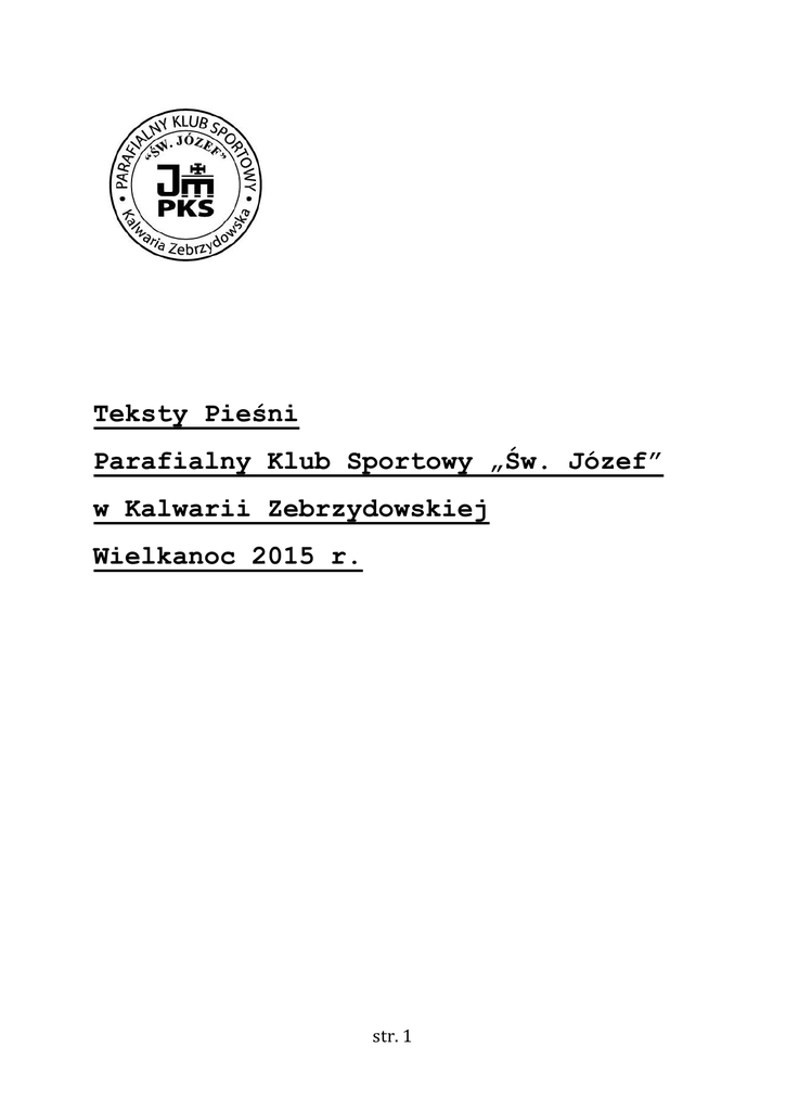 Teksty Pieśni Parafialny Klub Sportowy „Św. Józef” w Kalwarii Zebrzydowskiej Wielkanoc 2015 r. str. 1 Nie bój się (https://www.youtube.com/watch?v=QXk-Ql7dlCk) d A7 d A7 Nie bój się, nie lękaj się d C F C (d A7) Bóg sam wystarczy x2 d A7 d A7 Zostań tu i ze mną się módl d C F C (d A7) Razem czuwajmy x2 Dzięki za twój krzyż C Dzięki F dzięki C dzięki F dzięki (https://www.youtube.com/watch?v=N99Xyycmg8g) G a za Twój Krzyż, C G za zwycięstwo Twe, G a że Twa krew oczyszcza mnie, G G7 c G7 za miłosierdzie Twe. Krzyż nadzieją moją jest d Krzyż F Krzyż d Krzyż d Krzyż (https://www.youtube.com/watch?v=dQGXmAiyzXc) a* d C nadzieją moją jeest. g A A7 nadaje życiu sens. C F A miłością, krzyż wiernością, a* d nadzieją moją jest. Bóg jest miłością 2x (https://www.youtube.com/watch?v=E92Z3bwBVyI) A D A Bóg jest miłością cis fis h E Miejcie odwagę żyć dla miłości. A D A Bóg jest miłością, fis E A Nie lękajcie się. str. 2 Pewnej nocy (https://www.youtube.com/watch?v=AqoZGgFSjIc) D e 1. Pewnej nocy łzy z oczu mych A D otarł dłonią swą Jezus h e i powiedział mi: „Nie martw się, A7 D Jam przy boku jest twym.” D e Potem spojrzał na grzeszny świat A D pogrążony w ciemności, h e i zwracając się do mnie, A7 D pełen smutku tak rzekł: Ref. D e „Powiedz ludziom, że kocham ich, A D że się o nich wciąż troszczę, h e jeśli zeszli już z moich dróg, A7 D powiedz, że szukam ich." (2x) D e 2. Gdy na wzgórzu Golgoty A D Życie za nich oddałem h e To umarłem za wszystkich A7 D Aby każdy mógł żyć D e Nie zapomnę tej chwili A D Gdy mnie spotkał mój Jezus h e Wtedy byłem jak ślepy A7 D On przywrócił mi wzrok Ref. Powiedz ludziom... str. 3 Rozpięty na ramionach a C G Rozpięty na ramionach F a E7 Jak sokół na niebie. a C G Chrystusie, Synu Boga, F a E7 Spójrz proszę na ziemię. a d G c 1.Na ruchliwe ulice, Zabieganych ludzi. F d E E7 Gdy dzień się już kończy, A ranek się budzi. a d G c Uśmiechnij się przyjaźnie Z wysokiego krzyża. F d E E7 Do ciężko pracujących, Których głód poniża. Ref. a d G c 2. Pociesz zrozpaczonych, chleba daj głodującym. F d e e7 Modlących Ciebie słuchaj i wybacz umierającym. a d G c Spójrz cierpienia sokole na wszechświat, na ziemię. F d E E7 Na cichy ciemny Kościół, dziecko wzywające Ciebie. Ref. a d G c 3. A gdy będziesz nas sądził, Boskie Miłosierdzie. F d E E7 Prosimy, Twoje dzieci, nie sądź na miarę siebie. Ref. str. 4 Mów do mnie Panie h A G Mów do mnie Panie h A chcę słyszeć Cię, h A przyjąć od Ciebie G co masz dla mnie. h A G Nie chcę się chować h D lecz w Tobie skryć . h A w cieniu Twym Panie G chce iść. Ref. h A G h Święty Potężny jesteś Panie nasz A G h przed Tobą dziś możemy stać G dzięki łasce D A nie dzięki nam samym. str. 5 Matka, która pod krzyżem stała (https://www.youtube.com/watch?v=ovaq4V6hlGs) e D Jeśli masz chwile smutne w swym życiu, H7 e Powierz się Matce. e D Kiedy rozpacz ogarnia twe serce, H7 e Ofiaruj się Jej. Ref. e Matce, która pod krzyżem stała, C Matce, która się z Synem żegnała, D Która uczyć cię będzie pokory, G H7 Cierpienie znieść ci pomoże. e Ona, Matka, która pod krzyżem stała C Matka, która się z Synem żegnała D Która uczyć cię będzie pokory, G H7 Cierpienie znieść ci pomoże. e D 2. Kiedy ruszasz w daleką wędrówkę H7 e Powierz się Matce. e D Gdy na szlaku zaskoczy cię burza H7 e Ofiaruj się Jej. e D 3. Jeśli zgubisz swą drogę do Boga H7 e Powierz się Matce. e D Gdy w twym sercu znów gości trwoga H7 e Ofiaruj się Jej. str. 6 Quo Vadis (https://www.youtube.com/watch?v=UvYbnPzBR8I) C a Powiedz Panie dokąd idziesz F G W tę upalną letnią noc C a Dokąd Cię prowadzi droga F G Czemu idziesz w taki mrok C a Powiedz Panie czemu w oczach F G Taki wielki smutek masz C a Czemu patrzysz jakbyś prosił F G O coś powiedz - Quo Vaa_dis wyż. Ref. C a F G Idę jeszcze raz swe do krzyża przybić ręce C a F G Idę jeszcze raz życie swe poświęcę C a F G Jeszcze jeden raz idę spojrzeć z krzyża tam C a F G Gdzie stoi Matka dla Ciebie - człowieku C a Nie chcę Panie abyś zdążył F G W tę upalną letnią noc C a By na krzyż Cię prowadziła F G Szara droga w taki mrok C a Wiem już Panie czemu w oczach F G Taki wielki smutek masz C a Czemu patrzysz jakbyś prosił F G O coś - wiem i wra_cam wyż. Ref. C a F G I pójdę jeśli chcesz dać do krzyża przybić ręce C a F G Pójdę zamiast Ciebie życie swe poświęcę C a F G Chociaż jeden raz pójdę spojrzeć z krzyża tam C a F G Gdzie stoją ludzie dla Ciebie - Chrystusie str. 7