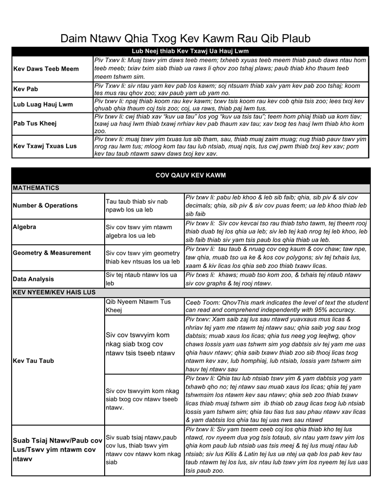 Daim Ntawv Qhia Txog Kev Kawm Rau Qib Plaub Kev Daws Teeb Meem Kev Pab Lub Luag Hauj Lwm Pab Tus Kheej Kev Txawj Txuas Lus Lub Neej thiab Kev Txawj Ua Hauj Lwm Piv Txwv li: Muaj tswv yim daws teeb meem; txheeb xyuas teeb meem thiab paub daws ntau hom teeb meeb; txiav txim siab thiab ua raws li qhov zoo tshaj plaws; paub thiab kho thaum teeb meem tshwm sim. Piv Txwv li: siv ntau yam kev pab los kawm; soj ntsuam thiab xaiv yam kev pab zoo tshaj; koom tes mus rau qhov zoo; xav paub yam ub yam no. Piv txwv li: npaj thiab koom rau kev kawm; txwv tsis koom rau kev cob qhia tsis zoo; lees txoj kev qhuab qhia thaum coj tsis zoo; coj, ua raws, thiab paj lwm tus. Piv txwv li: cwj thiab xav “kuv ua tau” los yog “kuv ua tsis tau”; teem hom phiaj thiab ua kom tiav; txawj ua hauj lwm thiab txawj nrhiav kev pab thaum xav tau; xav txog tes hauj lwm thiab kho kom zoo. Piv txwv li: muaj tswv yim txuas lus sib tham, sau, thiab muaj zaim muag; nug thiab pauv tswv yim nrog rau lwm tus; mloog kom tau tau lub ntsiab, muaj nqis, tus cwj pwm thiab txoj kev xav; pom kev tau taub ntawm sawv daws txoj kev xav. COV QAUV KEV KAWM MATHEMATICS Number & Operations Algebra Geometry & Measurement Data Analysis Piv txwv li: pabu leb khoo & leb sib faib; qhia, sib piv & siv cov decimals; qhia, sib piv & siv cov puas feem; ua leb khoo thiab leb sib faib Piv txwv li: Siv cov kevcai tso rau thiab tsho tawm, tej theem rooj Siv cov tswv yim ntawm thiab duab tej los qhia ua leb; siv leb tej kab nrog tej leb khoo, leb algebra los ua leb sib faib thiab siv yam tsis paub los qhia thiab ua leb. Piv txwv li: tau taub & nruag cov ceg kaum & cov chaw; taw npe, Siv cov tswv yim geometry taw qhia, muab tso ua ke & kos cov polygons; siv tej txhais lus, thiab kev ntsuas los ua leb xaam & kiv licas los qhia seb zoo thiab txawv licas. Siv tej ntaub ntawv los ua Piv txws li: khaws; muab tso kom zoo, & txhais tej ntaub ntawv leb siv cov graphs & tej rooj ntawv. Tau taub thiab siv nab npawb los ua leb KEV NYEEM/KEV HAIS LUS Qib Nyeem Ntawm Tus Kheej Ceeb Toom: QhovThis mark indicates the level of text the student can read and comprehend independently with 95% accuracy. Piv txwv: Xam saib zaj lus sau ntawd yuavxaus mus licas & nhriav tej yam me ntawm tej ntawv sau; qhia saib yog sau txog Siv cov tswvyim kom dabtsis; muab xaus los licas; qhia tus neeg yog leejtwg, qhov nkag siab txog cov chaws lossis yam uas tshwm sim yog dabtsis siv tej yam me uas qhia hauv ntawv; qhia saib txawv thiab zoo sib thooj licas txog ntawv tsis tseeb ntawv Kev Tau Taub ntawm kev xav, lub homphiaj, lub ntsiab, lossis yam tshwm sim hauv tej ntawv sau Piv txwv li: Qhia tau lub ntsiab tswv yim & yam dabtsis yog yam txhawb qho no; tej ntawv sau muab xaus los licas; qhia tej yam Siv cov tswvyim kom nkag tshwmsim los ntawm kev sau ntawv; qhia seb zoo thiab txawv siab txog cov ntawv tseeb licas thiab muaj tshwm sim ib thiab ob zaug licas txog lub ntsiab ntawv. lossis yam tshwm sim; qhia tau tias tus sau phau ntawv xav licas & yam dabtsis los qhia tau tej uas nws sau ntawd Piv txwv li: Siv yam tseem ceeb coj los qhia thiab kho tej lus Siv suab tsiaj ntawv,paub ntawd, rov nyeem dua yog tsis totaub, siv ntau yam tswv yim los Suab Tsiaj Ntawv/Paub cov cov lus, thiab tswv yim qhia kom paub lub ntsiab uas tsis meej & tej lus muaj ntau lub Lus/Tswv yim ntawm cov ntawv cov ntawv kom nkag ntsiab; siv lus Kilis & Latin tej lus ua ntej ua qab los pab kev tau ntawv siab taub ntawm tej los lus, siv ntau lub tswv yim los nyeem tej lus uas tsis paub zoo. COV QAUV KEV KAWM, cont. KEV TXUAS LUS KEV SAU NTAWV Sau kom zoo thiab meej rau lub hom phiaj ntawd. Siv cov cim, qauv sau ntawv, thiab sau kom yog rau cov lus Hais lus, saib, Sib tham kev txawj ntse & thiab mloog, xov xwm & tswv yim txog ntau yam kev kawm Technology los ntawm tib neeg ntau txoj kev Piv txwv li: Siv txoj kev qhia sau ntawv; sau ntawv txog yug kev xav los ntawm kev tswj qhia; sau kom zoo & tob qhia txog yam tseeb lossis xav txog ntawm lub neej siv tej los lus kom meej thiab to taub. Piv txwv li: Siv cov cim kom yog rau kev sib txuas lus; sau kom tau cov lus kom yog raws li qib kawm, siv tej phau ntawv los kuaj saib yog los tsis yog. Piv txwv li: sib koom txog kev sib tham nrog rau lwm haiv tib neeg hais txog qib kawm thiab ntawv kawm; kev sib txawv, tau taub, thiab siv kev sau txawv, kev siv ob peb yam khoophivtawj; kev sib tham uas siv ntau hom ntawv ( hais lus, sau,khoos phiv tawj, ntau yam ees thaws nej); siv technology cov cuab yeej rau kev sib txuas lus kev kawm. KEV NOJ QAB HAUS HUV Tau taub & Qhia kev txawj txog kev Piv txwv li: tau taub txog kev noj qab haus huv ntawm lub neej ntiav noj qab haus huv & cov tswv yim ntiav; siv tej yaam ntaub ntawv zoo coj los pab yug xyaum ua lub los mus ua kom noj qab haus huv. neej zoo ntawm txoj kev noj qab nyob zoo SCIENCE Piv txwv li: Siv tej kev txaj ntse lus nug los teb tej lus nug; taw & muab tej pob zeb los tso ua ke raws li qhov zoo thiab txawv; tau taub tias dej ntws hauv av, hiav txwv & huab cua kiv; qhia txog yam Tau taub & qhia txog kev txawj ntse uas tawv, dej & pa tsw; qhia tias energy muaj ntau hom xws li sov science & tswv yim heat & sib nplaum magnetism; taw & tshawb txog tej yam uas tsis tau paub & siv tej ntawd coj los daws teem meem ntawm lub neej txhua hnub KEV KAWM UA NOJ UA HAUS Tau taub & qhia txog kev kawm ua noj ua haus & tswv yim Piv txwv li: Qhia ntau txojkev uas ib tus neeg xam xaj ua los txiav txim siab; tau taub & siv kev tau taub los pab kev txiav txim siab; tau taub txog kev sib koom tes licas ntawm tibneeg thiab tej liaj tej teb; siv tej ntawv qhia maps los tau taub vim licas tibneeg thiaj li txav los nyob rau tebchaws North America Tau taub & qhia txog kev kos duab & tswv yim Piv txwv li: tsim & kho 2 & 3 yam qauv kev kos duab; qhia tias vim licas yug tsim daim duab ntawd; qhia ntau yam uas los txhawb lub tswv yim kev kos duab; qhia tau xim, kab, zoo licas, qhov chaws & ntxhwb thiab mos licas coj los siv tsim tej duab ntawd KEV KOS DUAB