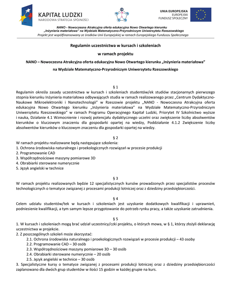 Regulamin uczestnictwa w kursach i szkoleniach w ramach projektu NANO – Nowoczesna Atrakcyjna oferta edukacyjna Nowo Otwartego kierunku „Inżynieria materiałowa” na Wydziale Matematyczno-Przyrodniczym Uniwersytetu Rzeszowskiego §1 Regulamin określa zasady uczestnictwa w kursach i szkoleniach studentów/ek studiów stacjonarnych pierwszego stopnia kierunku Inżynieria materiałowa odbywających studia w ramach realizowanego przez „Centrum DydaktycznoNaukowe Mikroelektroniki i Nanotechnologii” w Rzeszowie projektu „NANO - Nowoczesna Atrakcyjna oferta edukacyjna Nowo Otwartego kierunku „Inżynieria materiałowa” na Wydziale Matematyczno-Przyrodniczym Uniwersytetu Rzeszowskiego” w ramach Programu Operacyjnego Kapitał Ludzki, Priorytet IV Szkolnictwo wyższe i nauka, Działanie 4.1 Wzmocnienie i rozwój potencjału dydaktycznego uczelni oraz zwiększenie liczby absolwentów kierunków o kluczowym znaczeniu dla gospodarki opartej na wiedzy, Poddziałanie 4.1.2 Zwiększenie liczby absolwentów kierunków o kluczowym znaczeniu dla gospodarki opartej na wiedzy. §2 W ramach projektu realizowane będą następujące szkolenia: 1. Ochrona środowiska naturalnego i proekologicznych rozwiązań w procesie produkcji 2. Programowanie CAD 3. Współrzędnościowe maszyny pomiarowe 3D 4. Obrabiarki sterowane numerycznie 5. Język angielski w technice §3 W ramach projektu realizowanych będzie 12 specjalistycznych kursów prowadzonych przez specjalistów procesów technologicznych o tematyce związanej z procesami produkcji lotniczej oraz z dziedziny przedsiębiorczości. §4 Celem udziału studentów/tek w kursach i szkoleniach jest uzyskanie dodatkowych kwalifikacji i uprawnień, podniesienie kwalifikacji, a tym samym lepsze przygotowanie do potrzeb rynku pracy, a także uzyskanie zatrudnienia. §5 1. W kursach i szkoleniach mogą brać udział uczestnicy/czki projektu, o których mowa, w § 1, którzy złożyli deklarację uczestnictwa w projekcie. 2. Z poszczególnych szkoleń może skorzystać: 2.1. Ochrona środowiska naturalnego i proekologicznych rozwiązań w procesie produkcji – 43 osoby 2.2. Programowanie CAD – 30 osób 2.3. Współrzędnościowe maszyny pomiarowe 3D – 30 osób 2.4. Obrabiarki sterowane numerycznie – 20 osób 2.5. Język angielski w technice – 30 osób 3. Specjalistyczne kursy o tematyce związanej z procesami produkcji lotniczej oraz z dziedziny przedsiębiorczości zaplanowano dla dwóch grup studentów w ilości 15 godzin w każdej grupie na kurs. §6 Informacja o procesie rekrutacji na kursy i szkolenia będzie ogłaszana na stronie internetowej projektu oraz tablicy ogłoszeń. §7 1. Studenci/tki, którzy/re wyrażą chęć udziału w szkoleniach zobowiązani/ne są do złożenia w podanym w ogłoszeniu terminie w Biurze projektu (CDNMiN ul. Pigonia 1, B3 p. 210) Wniosku rekrutacyjnego na odpowiednie szkolenie lub kurs, który stanowi Załącznik do niniejszego Regulaminu. 2. Nie złożenie Wniosku rekrutacyjnego w terminie wiąże się z utratą możliwości udziału w kursie lub szkoleniu. 3. Wybór uczestników kursu lub szkolenia będzie dokonywany przez Komisję Kwalifikacyjną w ramach limitu miejsc na podstawie listy rankingowej studentów ubiegających się o udział w danym kursie lub szkoleniu. 4. Listę rankingową ustala się na podstawie średniej z uzyskanych ocen z ostatniego semestru. 5. W przypadku uzyskania takiej samej ilości punktów o kolejności na liście rankingowej decyduje Komisja Kwalifikacyjna po uwzględnieniu ocen z poprzedniego semestru 6. Uczestnicy/czki poszczególnych kursów lub szkoleń zostaną wyłonieni przez Komisję Kwalifikacyjną w składzie: Kierownik projektu, Asystent ds. organizacyjnych i monitoringu, Asystent ds. rozliczeń i sprawozdawczości oraz Koordynator ds. współpracy z pracodawcami. 7. Listy uczestników/czek oraz listy rezerwowe zostaną umieszczone na stronie internetowej projektu. §8 1. W przypadku zwolnienia się miejsca na liście uczestników/czek kursów lub szkolenia miejsce to otrzymuje kolejna osoba z listy rezerwowej. 2. W przypadku, gdy uczestnik/czka projektu straci status studenta/tki traci jednocześnie prawo do udziału w kursach i szkoleniach. 3. Osoba zakwalifikowana na kurs lub szkolenie zobowiązuje się do uczestnictwa w nim. §9 1. W uzasadnionych przypadkach Zespół zarządzający projektem zastrzega sobie prawo zmiany zasad uczestnictwa w kursach i szkoleniach. 2. W sprawach nieuregulowanych w niniejszych przepisach znajdują zastosowanie Regulamin Uczestnictwa w Projekcie oraz wewnętrzne regulacje Uczelni. § 10 1. Zasady uczestnictwa w kursach i szkoleniach wchodzą w życie 01.03.2013r. 2. Zasady obowiązują w okresie kształcenia w ramach projektu.