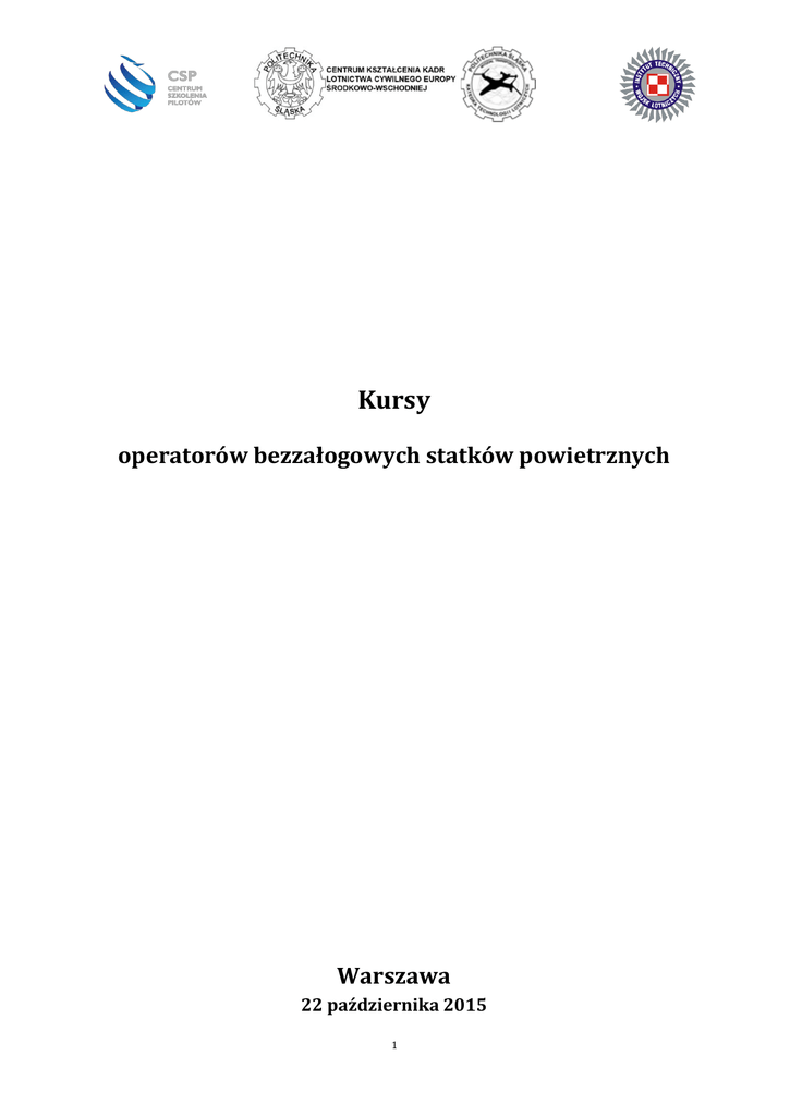 Kursy operatorów bezzałogowych statków powietrznych Warszawa 22 października 2015 1 1. Wymagania ogólne stawiane kandydatom biorącym udział w szkoleniu do świadectwa kwalifikacji operatora bezzałogowych statków powietrznych UAVO a) ukończone 18 lat; b) ważne orzeczenie lotniczo-lekarskie; c) ubezpieczenie OC*; * Centrum Szkolenia Pilotów współpracuje z brokerem, który zapewnia ubezpieczenie na czas kursu oraz ofertę dla kursantów, którzy będą musieli się ubezpieczyć ( świadectwo kwalifikacji jest nieaktywne bez ubezpieczenia OC), orientacyjne ceny w PZU – 125 zł za 2 tygodnie i od 500 zł za rok. 2. Zakres programu szkolenia Program obejmuje szkolenie do Świadectwa Kwalifikacji Operatora Bezzałogowego Statku Powietrznego używanego w celach innych niż rekreacyjne (UAVO) oraz uprawnień przyznawanych i przypisywanych do świadectw. Szkolenie ma na celu nabycie przez kandydatów na operatorów UAVO wiedzy i umiejętności potrzebnych do właściwego planowania i bezpiecznego wykonywania lotów bezzałogowym statkiem powietrznym oraz do jego prawidłowej obsługi naziemnej. Z uwagi na bardzo dużą różnorodność bezzałogowych statków powietrznych oraz systemów i urządzeń służących do ich pilotowania i obsługi, niniejszy program określa ogólny i niezbędny zakres szkolenia. 2 2.1. VLOS (Visual Line of Sight) – loty w zasięgu wzroku 2.1.1. SZKOLENIE TEORETYCZNE 2.1.1.1. Cel szkolenia Celem szkolenia teoretycznego jest zdobycie przez kursanta wiedzy wymaganej do uzyskania świadectwa kwalifikacji operatora bezzałogowego statku powietrznego używanego w celach innych niż rekreacyjne i sportowe z uprawnieniem podstawowym do wykonywania lotów w zasięgu wzroku (VLOS) oraz do bezpiecznego wykonywania lotów i obsługi bezzałogowych statków powietrznych. 2.1.2.2. Uwagi organizacyjno-metodyczne Szkolenie teoretyczne jest prowadzone w trybie stacjonarnym, w formie wykładów, zajęć seminaryjnych, konsultacji, ćwiczeń lub pokazu na sprzęcie. Wykaz przedmiotów oraz liczby godzin, przeznaczonych na każdy przedmiot przedstawione zostały w pkt. 2.1.2.3. Szczegółowy program szkolenia znajduje się w pkt. 2.1.2.4. Szkolenie teoretyczne może odbywać się w postaci samokształcenia z zakresu wiedzy określonego w tabelach, jednak zwykle stosujemy system wykładów oraz materiały do nauki własnej. Takie podejście zapewnia nam wyższy poziom jakości kształcenia kandydatów na operatorów. 3 2.1.2.3. Wykaz przedmiotów szkolenia teoretycznego L.p. Przedmiot 1. Podstawy prawa lotniczego 5 2. 2 3. Człowiek jako pilot i operator UAV – możliwości i ograniczenia Zasady wykonywania lotów 4. Bezpieczeństwo wykonywania lotów i sytuacje niebezpieczne 3 5. Budowa i eksploatacja bezzałogowego statku powietrznego – kategoria MR/A/H RAZEM 3 2.1.2.4. Liczba godzin 3 16 Szczegółowy program szkolenia teoretycznego L.p. Przedmiot 1. Podstawy prawa lotniczego: - przepisy licencjonowania odnoszące się do świadectwa kwalifikacji operatora (UAVO) - przepisy i procedury ruchu lotniczego - służby i organy ruchu lotniczego - klasyfikacja przestrzeni powietrznej - skutki naruszenia przepisów lotniczych 2. Człowiek jako pilot i operator UAV – możliwości i ograniczenia: - podstawowa wiedza o fizjologii i psychologii człowieka oraz ich wpływie na operowanie bezzałogowym statkiem powietrznym - wpływ chorób, higieny, medykamentów i środków psychotropowych na wydolność psychofizyczną operatora bezzałogowego statku powietrznego - czynnik ludzki w lotnictwie 3. Zasady wykonywania lotów: 4. Podstawowa wiedza z aerodynamiki i mechaniki wykonywania lotów Bezpieczeństwo wykonywania lotów i sytuacje niebezpieczne: - zapewnienie separacji od innych statków powietrznych, ludzi, pojazdów, 4 budynków i innych przeszkód 5. - zasady wykonywania lotów bezzałogowych VLOS Budowa i eksploatacja bezzałogowego statku powietrznego – kategoria MR/A/H - omówienie budowy statku powietrznego poszczególnych kategorii MR/A/H - eksploatacja poszczególnych elementów budowy - zasady bezpieczeństwa 2.1.2. SZKOLENIE PRAKTYCZNE 2.1.2.1. Cel szkolenia Celem szkolenia praktycznego jest zdobycie przez kursanta umiejętności wymaganych do uzyskania świadectwa kwalifikacji operatora bezzałogowego statku powietrznego używanego w celach innych niż rekreacyjne i sportowe oraz do bezpiecznego wykonywania lotów i obsługi bezzałogowych statków powietrznych. 2.1.2.2. Uwagi organizacyjno-metodyczne Szkolenie powinno być realizowane w formie ćwiczeń naziemnych oraz szkolenia praktycznego w locie. Zaleca się, aby w przypadku osób nieposiadających doświadczenia w pilotowaniu bezzałogowych statków powietrznych danej kategorii, szkolenie praktyczne rozpocząć od nauki podstawowych manewrów na programie komputerowym, symulującym wykonywanie lotów odpowiednią kategorią bezzałogowego statku powietrznego. 2.1.2.3. Zakres szkolenia praktycznego 5 Szkolenie praktyczne obejmuje swoim zakresem następujące zagadnienia: przygotowanie do lotu bezzałogowego statku powietrznego obsługę naziemną bezzałogowego statku powietrznego ocenę zdatności do lotu bezzałogowego statku powietrznego wykonywanie czynności lotniczych. 6 2.1.2.4. Szczegółowy program szkolenia praktycznego L.p. 1. Szkolenie naziemne Przygotowanie do lotu bezzałogowego statku powietrznego: 2. - Przedstartowa kontrola urządzeń i systemów bezzałogowego statku powietrznego Obsługa naziemna bezzałogowego statku powietrznego: 3 -Przygotowanie układu napędowego i systemu zasilania Wykonywanie czynności lotniczych (kursant powinien opanować wykonywanie wszystkich wymienionych poniżej manewrów w różnych orientacjach przestrzennych UAV względem operatora): - Utrzymywanie równowagi w locie po prostej i na stałej wysokości - Wprowadzanie w zakręt, wyprowadzanie z zakrętu, krążenie - Zmiany wysokości lotu - Wykonywanie startu - Wykonywanie lądowania - Zawis (w przypadku