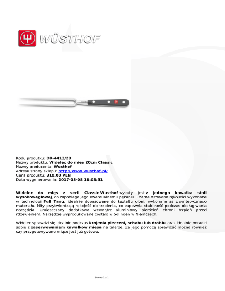 Kodu produtku: DR-4413/20 Nazwy produktu: Widelec do mięs 20cm Classic Nazwy producenta: Wusthof Adresu strony sklepu: http://www.wusthof.pl/ Cena produktu: 310.00 PLN Data wygenerowania: 2017-03-08 18:08:51 Widelec do mięs z serii Classic Wusthof wykuty jest z jednego kawałka stali wysokowęglowej, co zapobiega jego ewentualnemu pękaniu. Czarne nitowane rękojeści wykonane w technologii Full Tang, idealnie dopasowane do kształtu dłoni, wykonane są z syntetycznego materiału. Nity przytwierdzają rękojeść do trzpienia, co zapewnia stabilność podczas obsługiwania narzędzia. Umieszczony dodatkowo wewnątrz aluminiowy pierścień chroni trzpień przed rdzewieniem. Narzędzie wyprodukowane zostało w Solingen w Niemczech. Widelec sprawdzi się idealnie podczas krojenia pieczeni, schabu lub drobiu oraz idealnie poradzi sobie z zaserwowaniem kawałków mięsa na talerze. Za jego pomocą sprawdzić można również czy przygotowywane mięso jest już gotowe. Strona 1 z 1