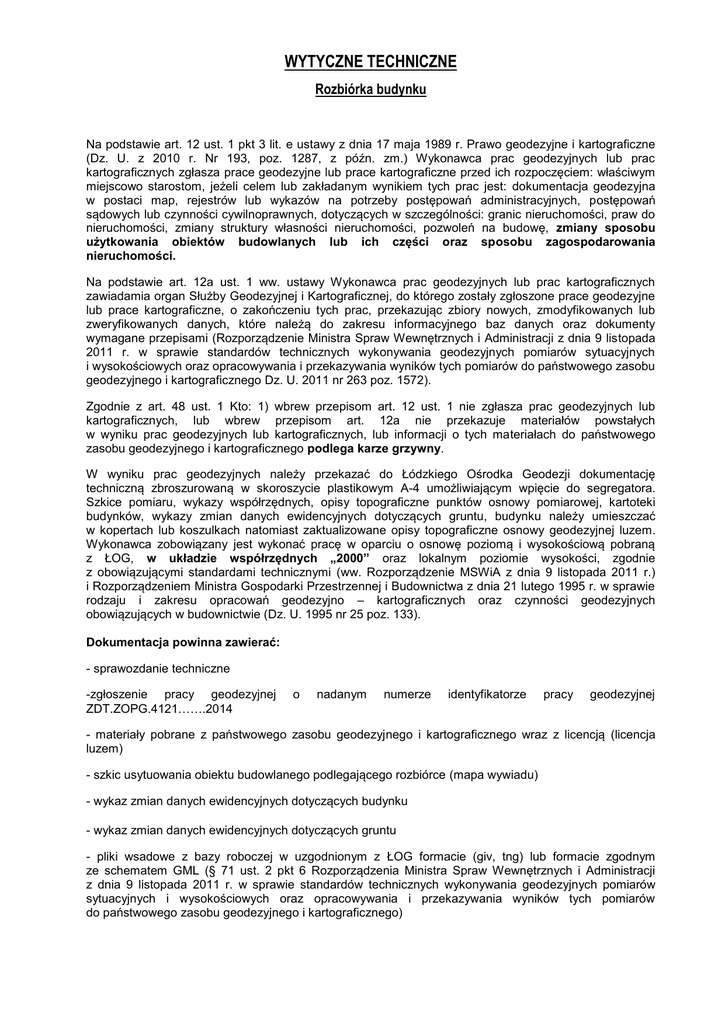 WYTYCZNE TECHNICZNE Rozbiórka budynku Na podstawie art. 12 ust. 1 pkt 3 lit. e ustawy z dnia 17 maja 1989 r. Prawo geodezyjne i kartograficzne (Dz. U. z 2010 r. Nr 193, poz. 1287, z późn. zm.) Wykonawca prac geodezyjnych lub prac kartograficznych zgłasza prace geodezyjne lub prace kartograficzne przed ich rozpoczęciem: właściwym miejscowo starostom, jeżeli celem lub zakładanym wynikiem tych prac jest: dokumentacja geodezyjna w postaci map, rejestrów lub wykazów na potrzeby postępowań administracyjnych, postępowań sądowych lub czynności cywilnoprawnych, dotyczących w szczególności: granic nieruchomości, praw do nieruchomości, zmiany struktury własności nieruchomości, pozwoleń na budowę, zmiany sposobu użytkowania obiektów budowlanych lub ich części oraz sposobu zagospodarowania nieruchomości. Na podstawie art. 12a ust. 1 ww. ustawy Wykonawca prac geodezyjnych lub prac kartograficznych zawiadamia organ Służby Geodezyjnej i Kartograficznej, do którego zostały zgłoszone prace geodezyjne lub prace kartograficzne, o zakończeniu tych prac, przekazując zbiory nowych, zmodyfikowanych lub zweryfikowanych danych, które należą do zakresu informacyjnego baz danych oraz dokumenty wymagane przepisami (Rozporządzenie Ministra Spraw Wewnętrznych i Administracji z dnia 9 listopada 2011 r. w sprawie standardów technicznych wykonywania geodezyjnych pomiarów sytuacyjnych i wysokościowych oraz opracowywania i przekazywania wyników tych pomiarów do państwowego zasobu geodezyjnego i kartograficznego Dz. U. 2011 nr 263 poz. 1572). Zgodnie z art. 48 ust. 1 Kto: 1) wbrew przepisom art. 12 ust. 1 nie zgłasza prac geodezyjnych lub kartograficznych, lub wbrew przepisom art. 12a nie przekazuje materiałów powstałych w wyniku prac geodezyjnych lub kartograficznych, lub informacji o tych materiałach do państwowego zasobu geodezyjnego i kartograficznego podlega karze grzywny. W wyniku prac geodezyjnych należy przekazać do Łódzkiego Ośrodka Geodezji dokumentację techniczną zbroszurowaną w skoroszycie plastikowym A-4 umożliwiającym wpięcie do segregatora. Szkice pomiaru, wykazy współrzędnych, opisy topograficzne punktów osnowy pomiarowej, kartoteki budynków, wykazy zmian danych ewidencyjnych dotyczących gruntu, budynku należy umieszczać w kopertach lub koszulkach natomiast zaktualizowane opisy topograficzne osnowy geodezyjnej luzem. Wykonawca zobowiązany jest wykonać pracę w oparciu o osnowę poziomą i wysokościową pobraną z ŁOG, w układzie współrzędnych „2000” oraz lokalnym poziomie wysokości, zgodnie z obowiązującymi standardami technicznymi (ww. Rozporządzenie MSWiA z dnia 9 listopada 2011 r.) i Rozporządzeniem Ministra Gospodarki Przestrzennej i Budownictwa z dnia 21 lutego 1995 r. w sprawie rodzaju i zakresu opracowań geodezyjno – kartograficznych oraz czynności geodezyjnych obowiązujących w budownictwie (Dz. U. 1995 nr 25 poz. 133). Dokumentacja powinna zawierać: - sprawozdanie techniczne -zgłoszenie pracy geodezyjnej ZDT.ZOPG.4121…….2014 o nadanym numerze identyfikatorze pracy geodezyjnej - materiały pobrane z państwowego zasobu geodezyjnego i kartograficznego wraz z licencją (licencja luzem) - szkic usytuowania obiektu budowlanego podlegającego rozbiórce (mapa wywiadu) - wykaz zmian danych ewidencyjnych dotyczących budynku - wykaz zmian danych ewidencyjnych dotyczących gruntu - pliki wsadowe z bazy roboczej w uzgodnionym z ŁOG formacie (giv, tng) lub formacie zgodnym ze schematem GML (§ 71 ust. 2 pkt 6 Rozporządzenia Ministra Spraw Wewnętrznych i Administracji z dnia 9 listopada 2011 r. w sprawie standardów technicznych wykonywania geodezyjnych pomiarów sytuacyjnych i wysokościowych oraz opracowywania i przekazywania wyników tych pomiarów do państwowego zasobu geodezyjnego i kartograficznego)