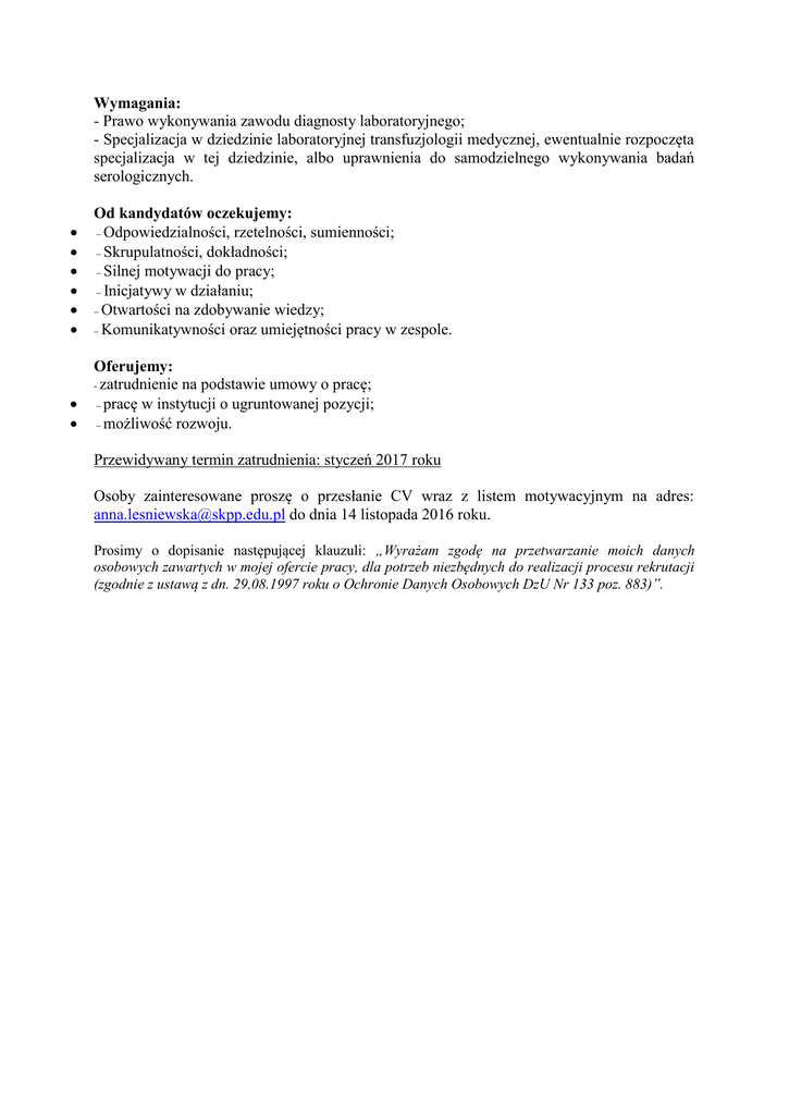 Wymagania: - Prawo wykonywania zawodu diagnosty laboratoryjnego; - Specjalizacja w dziedzinie laboratoryjnej transfuzjologii medycznej, ewentualnie rozpoczęta specjalizacja w tej dziedzinie, albo uprawnienia do samodzielnego wykonywania badań serologicznych. Od kandydatów oczekujemy: Odpowiedzialności, rzetelności, sumienności; Skrupulatności, dokładności; Silnej motywacji do pracy; Inicjatywy w działaniu; Otwartości na zdobywanie wiedzy; Komunikatywności oraz umiejętności pracy w zespole. Oferujemy: - zatrudnienie na podstawie umowy o pracę; pracę w instytucji o ugruntowanej pozycji; możliwość rozwoju. Przewidywany termin zatrudnienia: styczeń 2017 roku Osoby zainteresowane proszę o przesłanie CV wraz z listem motywacyjnym na adres: [email protected] do dnia 14 listopada 2016 roku. Prosimy o dopisanie następującej klauzuli: „Wyrażam zgodę na przetwarzanie moich danych osobowych zawartych w mojej ofercie pracy, dla potrzeb niezbędnych do realizacji procesu rekrutacji (zgodnie z ustawą z dn. 29.08.1997 roku o Ochronie Danych Osobowych DzU Nr 133 poz. 883)”.