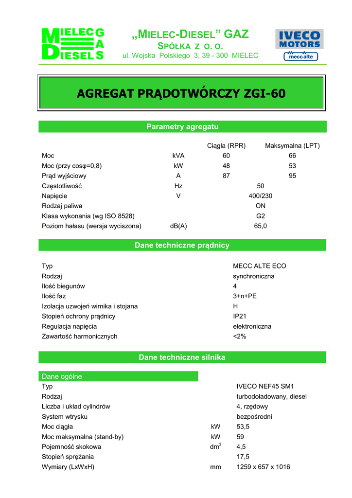 „MIELEC-DIESEL” GAZ AGREGAT PRĄDOTWÓRCZY ZGI-60