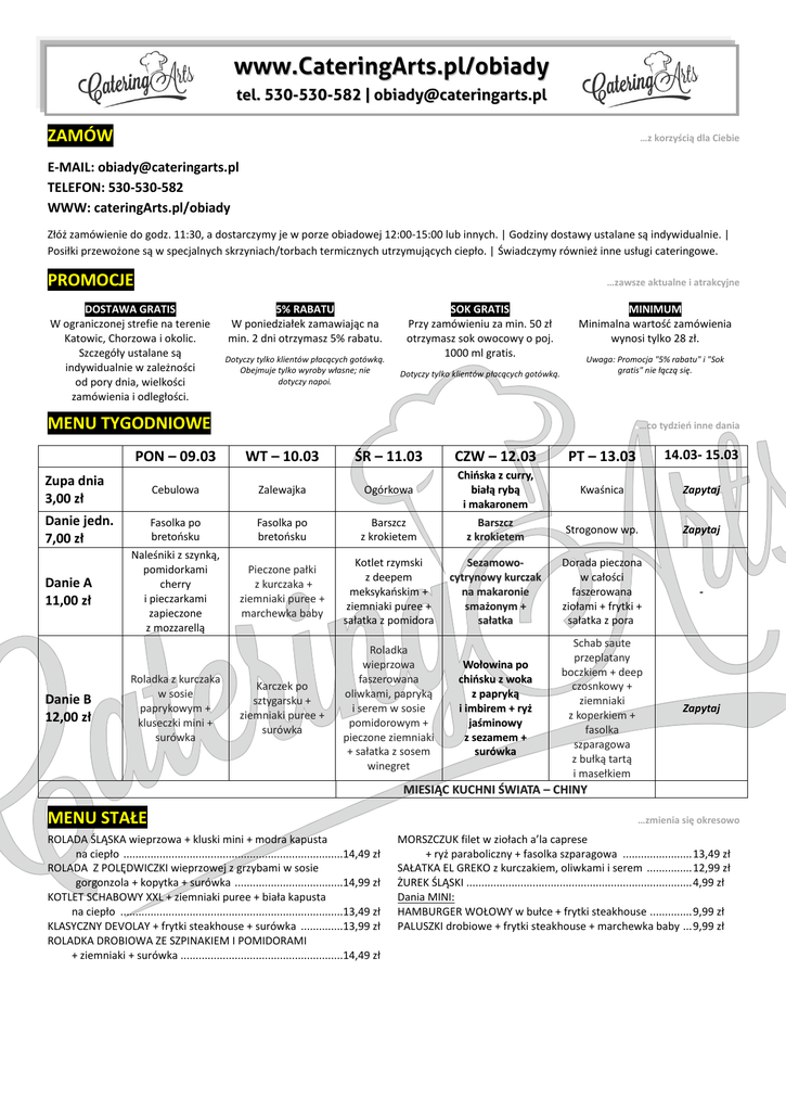 www.CateringArts.pl/obiady n tel. 530-530-582 | [email protected] ZAMÓW. …z korzyścią dla Ciebie E-MAIL: [email protected] TELEFON: 530-530-582 WWW: cateringArts.pl/obiady Złóż zamówienie do godz. 11:30, a dostarczymy je w porze obiadowej 12:00-15:00 lub innych. | Godziny dostawy ustalane są indywidualnie. | Posiłki przewożone są w specjalnych skrzyniach/torbach termicznych utrzymujących ciepło. | Świadczymy również inne usługi cateringowe. PROMOCJE. …zawsze aktualne i atrakcyjne DOSTAWA GRATIS W ograniczonej strefie na terenie Katowic, Chorzowa i okolic. Szczegóły ustalane są indywidualnie w zależności od pory dnia, wielkości zamówienia i odległości. 5% RABATU W poniedziałek zamawiając na min. 2 dni otrzymasz 5% rabatu. Dotyczy tylko klientów płacących gotówką. Obejmuje tylko wyroby własne; nie dotyczy napoi. SOK GRATIS Przy zamówieniu za min. 50 zł otrzymasz sok owocowy o poj. 1000 ml gratis. Dotyczy tylko klientów płacących gotówką. MINIMUM Minimalna wartość zamówienia wynosi tylko 28 zł. Uwaga: Promocja "5% rabatu" i "Sok gratis" nie łączą się. MENU TYGODNIOWE PON – 09.03 .…co tydzień inne dania WT – 10.03 ŚR – 11.03 CZW – 12.03 PT – 13.03 14.03- 15.03 Kwaśnica Zapytaj Zupa dnia 3,00 zł Cebulowa Zalewajka Ogórkowa Chińska z curry, białą rybą i makaronem Danie jedn. 7,00 zł Fasolka po bretońsku Fasolka po bretońsku Barszcz z krokietem Barszcz z krokietem Strogonow wp. Zapytaj Naleśniki z szynką, pomidorkami cherry i pieczarkami zapieczone z mozzarellą Pieczone pałki z kurczaka + ziemniaki puree + marchewka baby Kotlet rzymski z deepem meksykańskim + ziemniaki puree + sałatka z pomidora Sezamowocytrynowy kurczak na makaronie smażonym + sałatka Dorada pieczona w całości faszerowana ziołami + frytki + sałatka z pora - Karczek po sztygarsku + ziemniaki puree + surówka Roladka wieprzowa faszerowana oliwkami, papryką i serem w sosie pomidorowym + pieczone ziemniaki + sałatka z sosem winegret Wołowina po chińsku z woka z papryką i imbirem + ryż jaśminowy z sezamem + surówka Schab saute przeplatany boczkiem + deep czosnkowy + ziemniaki z koperkiem + fasolka szparagowa z bułką tartą i masełkiem Zapytaj Danie A 11,00 zł Danie B 12,00 zł Roladka z kurczaka w sosie paprykowym + kluseczki mini + surówka MIESIĄC KUCHNI ŚWIATA – CHINY MENU STAŁE ROLADA ŚLĄSKA wieprzowa + kluski mini + modra kapusta na ciepło .........................................................................14,49 zł ROLADA Z POLĘDWICZKI wieprzowej z grzybami w sosie gorgonzola + kopytka + surówka ....................................14,99 zł KOTLET SCHABOWY XXL + ziemniaki puree + biała kapusta na ciepło ..........................................................................13,49 zł KLASYCZNY DEVOLAY + frytki steakhouse + surówka ..............13,99 zł ROLADKA DROBIOWA ZE SZPINAKIEM I POMIDORAMI + ziemniaki + surówka ......................................................14,49 zł .…zmienia się okresowo MORSZCZUK filet w ziołach a’la caprese + ryż paraboliczny + fasolka szparagowa ....................... 13,49 zł SAŁATKA EL GREKO z kurczakiem, oliwkami i serem ............... 12,99 zł ŻUREK ŚLĄSKI ........................................................................... 4,99 zł Dania MINI: HAMBURGER WOŁOWY w bułce + frytki steakhouse .............. 9,99 zł PALUSZKI drobiowe + frytki steakhouse + marchewka baby ... 9,99 zł