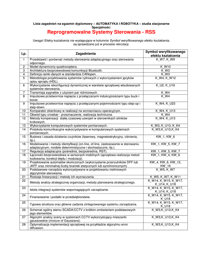 Lista zagadnień na egzamin dyplomowy – AUTOMATYKA I ROBOTYKA – studia stacjonarne Specjalność: Reprogramowalne Systemy Sterowania - RSS Uwaga! Efekty kształcenia nie występujące w kolumnie Symbol weryfikowanego efektu kształcenia, są sprawdzane już w procesie rekrutacji. Lp. Zagadnienia 1 Przedstawić i porównać metody sterowania adaptacyjnego oraz sterowania odpornego. Model dynamiczny quadrocoptera. Architektura bezprzewodowej komunikacji Bluetooth. Definicja ramki danych w standardzie CANopen. Metodologia projektowania systemów cyfrowych z wykorzystaniem języków opisu sprzętu (HDL). Wykorzystanie rekonfiguracji dynamicznej w warstwie sprzętowej wbudowanych systemów sterowania. Transmisja sygnałów z użyciem par różnicowych. Impulsowe przetwornice napięcia z przełączanymi indukcyjnościami typu buck i boost. Impulsowe przetwornice napięcia z przełączanymi pojemnościami typu step-up i step-down. Komparator okienkowy w realizacji na wzmacniaczu operacyjnym. Obwód typu crowbar - przeznaczenie, realizacja techniczna. Metody kompensacji stałej czasowej uzwojeń w sterownikach silników krokowych. Wykorzystanie komputerowych systemów pomiarowych. Protokoły komunikacyjne wykorzystywane w komputerowych systemach pomiarowych. Budowa i zasada działania czujników (laserowy, magnetostrykcyjny, ciśnienia, itp.). Modelowanie i metody identyfikacji (on-line, of-line, zastosowanie w sterowaniu adaptacyjnym, modele deterministyczne i stochastyczne, itp.). Regulacja adaptacyjna (pośrednia, bezpośrednia, RST). Łączność bezprzewodowa w sensorach mobilnych (sprzętowa realizacja metod kodowania, korekcji błędu i modulacji). Projektowanie automatów skończonych (wykorzystanie przerzutników DFF lub JKFF oraz minimalnej liczby bramek statycznych lub synchronicznych) Podstawowe narzędzia wykorzystywane w projektowaniu nieliniowych algorytmów sterowania. Rodzaje linearyzacji i metody ich wyznaczania. 2 3 4 5 6 7 8 9 10 11 12 13 14 15 16 17 18 19 20 21 22 23 24 25 26 27 28 Metody analizy strategicznej organizacji, metody planowania strategicznego. Istota integracji systemów wspomagających zarządzanie. Finansowanie i podatki w przedsiębiorstwie. Typowa struktura oraz główne zadania zintegrowanego systemu zarządzania. Schemat ogólny stemu SCADA/CCTV z krótkim omówieniem podstawowych jego elementów. Algorytm analizy sceny w systemach CCTV wykorzystujący mieszanki gaussowskie (mixture of Gaussians). Optymalizacja implementacji sprzętowej na przykładzie algorytmu error diffussion. Symbol weryfikowanego efektu kształcenia K_W7, K_W9 K_W10 K_W3 K_W3 K_W4, K_W12 K_U2, K_U16 K_W4 K_W4 K_W4, K_U23 K_W4, K_U13 K_W4 K_W4, K_U13 K_W3, K_U13, K_K4 K_W3,K_U13,K_K4 KW_1, KW_6 KW_1, KW_5, KW_7 KW_1, KW_5, KW_7 KW_1, KW_4, KW_6 KW_4, KW_6, KW_12, KW_16 K_W5, K_W7 K_W5, K_W7, K_W11 K_W14, K_W15, K_W17, K_U14, K_U18 K_W14, K_W15, K_W17, K_U14, K_U18 K_W14, K_W15, K_W17, K_U18 K_W14, K_W15, K_W17, K_U18 K_W3,K_U13,K_K4 K_W3,K_U13,K_K4 K_W3,K_U13,K_K4