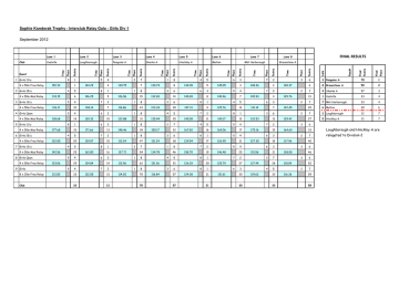 Sophie Konderak Trophy - Interclub Relay Gala - Girls Div 1 September 2012 133.15 126.11 5 138.68 5 Girls 11/u 4 x 50m Med Relay 8 177.68 6 Girls 15/u 4 x 50m Free Relay 122.00 7 Girls 13/u 4 x 50m Med Relay 4 8 Girls Open 4 x 50m Free Relay 5 9 Girls 8 x 25m Free Relay Club 129.07 8 6 4 33 33 113.24 2 1 2 21 21 1 4 70 57 8 21 7 30 2 4 119.62 33 33 4 20 6 Melton 30 6 7 2 Loughborough 21 7 27 5 Hinckley A 21 7 117.96 6 33 Loughborough and Hinckley A are 7 relogated to Division 2 40 3 138.08 6 46 3 118.04 6 52 2 Place 7 Mkt Harborough Final 4 7 2 Points 33 Final 1 Coalville 164.69 116.36 Result 3 13 Lane 57 3 5 33 4 Sharks A 129.42 7 28 2 7 2 3 21 117.44 Time Points 6 1 59 122.45 3 18 151.56 3 30 Place 127.35 70 8 Braunstone A 2 2 15 6 2 27 6 121.61 175.16 3 Penguins A 6 129.76 6 13 7 4 25 125.79 Time Points 5 132.53 6 2 3 7 3 4 21 146.48 1 21 Place 126.95 131.14 3 140.37 2 4 6 4 17 5 1 20 8 124.38 169.06 2 145.93 1 13 5 2 19 126.03 Time Points 7 140.17 2 7 5 12 8 1 17 158.70 6 57 Place Time 129.54 125.76 7 148.26 4 7 4 5 16 8 5 51 3 116.84 167.82 3 140.46 2 11 4 8 46 121.36 140.09 3 5 1 9 7 6 38 134.78 8 70 Points 121.24 147.31 6 145.05 3 8 8 7 32 3 8 62 1 114.02 150.17 5 140.65 5 25 2 7 54 112.96 135.44 5 6 6 20 4 8 47 137.71 123.34 4 144.09 6 14 3 8 39 1 3 19 7 122.55 148.46 8 132.83 8 31 1 1 16 124.84 122.88 8 3 8 23 1 2 15 163.00 116.86 1 130.74 8 15 1 3 13 7 4 29 5 121.00 171.66 7 126.56 3 10 6 5 25 123.06 139.32 7 1 2 7 6 5 20 142.56 138.14 2 130.75 1 5 7 1 15 4 4 146.25 4 14 4 8 4 10 5 144.29 5 6 5 4 Girls Open 4 x 50m Med Relay 1 4 3 Girls 13/u 4 x 50m Free Relay 1 Points 2 Girls 15/u 4 x 50m Med Relay 8 152.33 FINAL RESULTS Place 4 x 50m Free Relay Place Event 1 Girls 11/u Time Braunstone A Points Lane 8 Mkt Harborough Place Lane 7 Melton Time Lane 6 Hinckley A Points Lane 5 Sharks A Place Lane 4 Penguins A Time Lane 3 Loughborough Points Lane 2 Coalville Place Lane 1 Time Club 7 59 59