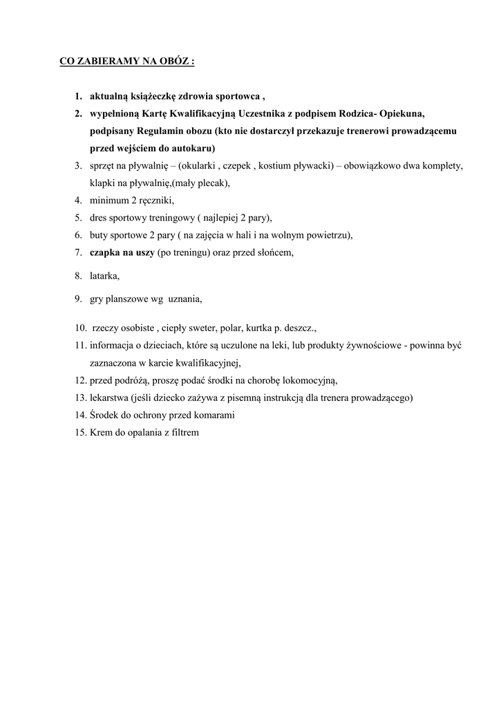 CO ZABIERAMY NA OBÓZ : 1. aktualną książeczkę zdrowia sportowca , 2. wypełnioną Kartę Kwalifikacyjną Uczestnika z podpisem Rodzica- Opiekuna, podpisany Regulamin obozu (kto nie dostarczył przekazuje trenerowi prowadzącemu przed wejściem do autokaru) 3. sprzęt na pływalnię – (okularki , czepek , kostium pływacki) – obowiązkowo dwa komplety, klapki na pływalnię,(mały plecak), 4. minimum 2 ręczniki, 5. dres sportowy treningowy ( najlepiej 2 pary), 6. buty sportowe 2 pary ( na zajęcia w hali i na wolnym powietrzu), 7. czapka na uszy (po treningu) oraz przed słońcem, 8. latarka, 9. gry planszowe wg uznania, 10. rzeczy osobiste , ciepły sweter, polar, kurtka p. deszcz., 11. informacja o dzieciach, które są uczulone na leki, lub produkty żywnościowe - powinna być zaznaczona w karcie kwalifikacyjnej, 12. przed podróżą, proszę podać środki na chorobę lokomocyjną, 13. lekarstwa (jeśli dziecko zażywa z pisemną instrukcją dla trenera prowadzącego) 14. Środek do ochrony przed komarami 15. Krem do opalania z filtrem