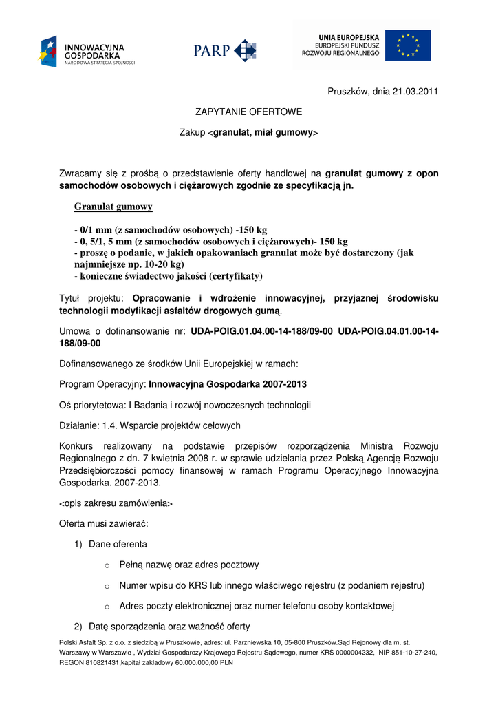 Pruszków, dnia 21.03.2011 ZAPYTANIE OFERTOWE Zakup <granulat, miał gumowy> Zwracamy się z prośbą o przedstawienie oferty handlowej na granulat gumowy z opon samochodów osobowych i cięŜarowych zgodnie ze specyfikacją jn. Granulat gumowy - 0/1 mm (z samochodów osobowych) -150 kg - 0, 5/1, 5 mm (z samochodów osobowych i cięŜarowych)- 150 kg - proszę o podanie, w jakich opakowaniach granulat moŜe być dostarczony (jak najmniejsze np. 10-20 kg) - konieczne świadectwo jakości (certyfikaty) Tytuł projektu: Opracowanie i wdroŜenie innowacyjnej, przyjaznej środowisku technologii modyfikacji asfaltów drogowych gumą. Umowa o dofinansowanie nr: UDA-POIG.01.04.00-14-188/09-00 UDA-POIG.04.01.00-14188/09-00 Dofinansowanego ze środków Unii Europejskiej w ramach: Program Operacyjny: Innowacyjna Gospodarka 2007-2013 Oś priorytetowa: I Badania i rozwój nowoczesnych technologii Działanie: 1.4. Wsparcie projektów celowych Konkurs realizowany na podstawie przepisów rozporządzenia Ministra Rozwoju Regionalnego z dn. 7 kwietnia 2008 r. w sprawie udzielania przez Polską Agencję Rozwoju Przedsiębiorczości pomocy finansowej w ramach Programu Operacyjnego Innowacyjna Gospodarka. 2007-2013. <opis zakresu zamówienia> Oferta musi zawierać: 1) Dane oferenta o Pełną nazwę oraz adres pocztowy o Numer wpisu do KRS lub innego właściwego rejestru (z podaniem rejestru) o Adres poczty elektronicznej oraz numer telefonu osoby kontaktowej 2) Datę sporządzenia oraz waŜność oferty Polski Asfalt Sp. z o.o. z siedzibą w Pruszkowie, adres: ul. Parzniewska 10, 05-800 Pruszków.Sąd Rejonowy dla m. st. Warszawy w Warszawie , Wydział Gospodarczy Krajowego Rejestru Sądowego, numer KRS 0000004232, NIP 851-10-27-240, REGON 810821431,kapitał zakładowy 60.000.000,00 PLN 3) Cenę całkowitą netto i brutto 4) Warunki i termin płatności 5) Maksymalny czas dostarczenia zamówienia 6) Informacje o doświadczeniu 7) Posiadane referencje (w formie listy: nazwa przedsiębiorstwa, osoba kontaktowa, numer telefonu) 8) Podpis (w tym elektroniczny) osoby lub osób upowaŜnionych do reprezentowania oferenta. Zamawiający zastrzega sobie prawo nierozpatrywania ofert złoŜonych niezgodnie z niniejszym zapytaniem. Wybór najkorzystniejszej oferty nastąpi w oparciu o następujące kryteria: L. p. 1. 2. 3. 4. 5. Kryterium Cena Doświadczenie Termin płatności Termin realizacji Posiadane referencje Razem Maksymalna ilość punktów 40 20 10 20 10 100 punktów Zamawiający po dokonaniu oceny ofert prześle wyniki do wszystkich oferentów, a następnie zaproponuje oferentowi, który uzyskał największą ilość punktów zawarcie umowy <opis zamówienia>. W przypadku nie zaakceptowania przez oferenta umowy w wersji proponowanej przez Zamawiającego, Zamawiający zastrzega sobie prawo do odrzucenia oferty oraz złoŜenia propozycji zawarcia umowy oferentowi, który załoŜył ofertę kolejną, co do ilości punktów. Oferta moŜe być złoŜona: 1) W formie elektronicznej na adres: mirosł[email protected] 2) W formie tradycyjnej w biurze: Polski Asfalt Sp. z o.o. ul. Parzniewska 10, 05-800 Pruszków Termin składania ofert mija 28.03.2011 Decyduje data dostarczenia oferty pod wskazany powyŜej adres. Nasze zapytanie ofertowe przesłano do potencjalnych dostawców oraz zamieszczono: na stronie www.polskiasfalt.pl oraz w siedzibie firmy. Polski Asfalt Sp. z o.o. z siedzibą w Pruszkowie, adres: ul. Parzniewska 10, 05-800 Pruszków.Sąd Rejonowy dla m. st. Warszawy w Warszawie , Wydział Gospodarczy Krajowego Rejestru Sądowego, numer KRS 0000004232, NIP 851-10-27-240, REGON 810821431,kapitał zakładowy 60.000.000,00 PLN