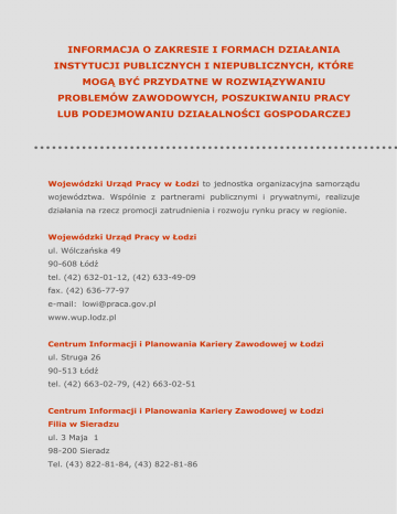 INFORMACJA O ZAKRESIE I FORMACH DZIAŁANIA INSTYTUCJI PUBLICZNYCH I NIEPUBLICZNYCH, KTÓRE MOGĄ BYĆ PRZYDATNE W ROZWIĄZYWANIU PROBLEMÓW ZAWODOWYCH, POSZUKIWANIU PRACY LUB PODEJMOWANIU DZIAŁALNOŚCI GOSPODARCZEJ Wojewódzki Urząd Pracy w Łodzi to jednostka organizacyjna samorządu województwa. Wspólnie z partnerami publicznymi i prywatnymi, realizuje działania na rzecz promocji zatrudnienia i rozwoju rynku pracy w regionie. Wojewódzki Urząd Pracy w Łodzi ul. Wólczańska 49 90-608 Łódź tel. (42) 632-01-12, (42) 633-49-09 fax. (42) 636-77-97 e-mail: [email protected] www.wup.lodz.pl Centrum Informacji i Planowania Kariery Zawodowej w Łodzi ul. Struga 26 90-513 Łódź tel. (42) 663-02-79, (42) 663-02-51 Centrum Informacji i Planowania Kariery Zawodowej w Łodzi Filia w Sieradzu ul. 3 Maja 1 98-200 Sieradz Tel. (43) 822-81-84, (43) 822-81-86 Ochotnicze Hufce Pracy to państwowa jednostka budżetowa, wykonująca zadania państwa w zakresie zatrudnienia oraz przeciwdziałania marginalizacji i wykluczeniu społecznemu młodzieży, a także zadania w zakresie jej kształcenia i wychowania. W zakresie kształcenia i wychowania młodzieży Ochotnicze Hufce Pracy w szczególności prowadzą działania mające na celu: 1) umożliwienie młodzieży, która nie ukończyła szkoły podstawowej lub gimnazjum albo nie kontynuuje nauki po ukończeniu tych szkół, zdobycie kwalifikacji zawodowych oraz uzupełnienie wykształcenia podstawowego lub gimnazjalnego; 2) umożliwienie młodzieży uzupełniania ponadgimnazjalnego wykształcenia ogólnego i zawodowego. Głównym celem działalności OHP jest stwarzanie młodzieży warunków do prawidłowego rozwoju społecznego. Adresatem oddziaływań OHP są grupy młodzieży w wieku 15-25 lat. W ramach struktury OHP znajdują się jednostki zajmujące się pośrednictwem pracy, doradztwem zawodowym i informacją zawodową oraz szkoleniami zawodowymi. Są nimi młodzieżowe biura pracy i ich filie, kluby pracy, mobilne centra informacji zawodowej, młodzieżowe zawodowego. Hufiec Pracy w Wieluniu ul. Piłsudskiego 6 98-300 Wieluń tel. (43) 843-96-52 e-mail: [email protected] www.ohpwielun.republika.pl Punkt Pośrednictwa Pracy ul. Piłsudskiego 6 98-300 Wieluń tel. (43) 843-96-52 centra kariery, ośrodki szkolenia e-mail: [email protected] www.ohpwielun.republika.pl MŁODZIEŻOWE CENTRUM KARIERY W WIELUNIU Plac Kazimierza Wielkiego 2 98-300 Wieluń tel. 43 886-02-85 e-mail: [email protected] Agencje zatrudnienia są niepublicznymi jednostkami organizacyjnymi zajmującymi się pomocą w niezbędnym do prowadzenia poszukiwaniu agencji zatrudnienia. zatrudnienia, czyli Warunkiem legalnego pośrednictwa pracy – jest posiadanie stosownego wpisu do Krajowego Rejestru Agencji Zatrudnienia www.kraz.praca.gov.pl Agencja Zatrudnienia „WORKPROFIT" ul. Wojska Polskiego 63 98-300 Wieluń tel.(43) 886-07-44, 609-675-650 http://nasz.wielun.pl/workprofit.php Państwowa Inspekcja Pracy jest organem powołanym do sprawowania nadzoru i kontroli przestrzegania prawa pracy, w szczególności przepisów i zasad bezpieczeństwa i higieny pracy, a także przepisów dotyczących legalności zatrudnienia i innej pracy zarobkowej w zakresie określonym w ustawie z dnia 13 kwietnia 2007roku o Państwowej Inspekcji Pracy. Państwowa Inspekcja Pracy Okręgowy Inspektorat Pracy w Łodzi al. Kościuszki 123 90-441 Łódź tel. (42) 636-23-13, (42) 636-85-13 e-mail: [email protected] www.lodz.oip.pl http://www.pip.gov.pl Państwowa Inspekcja Pracy Okręgowy Inspektorat Pracy w Łodzi Oddział w Sieradzu ul. Polskiej Organizacji Wojskowej 64 98-200 Sieradz tel. (43) 828-61-03 http://www.pip.gov.pl Powiatowy Zespół do Spraw Orzekania o Niepełnosprawności w Wieluniu rozpatruje wnioski o wydanie: orzeczenia o niepełnosprawności (dzieci do 16. roku życia); orzeczenia o stopniu niepełnosprawności (osoby powyżej 16. roku życia); orzeczenia o wskazaniach do ulg i uprawnień (dla osób posiadających ważne orzeczenie o inwalidztwie lub niezdolności do pracy); legitymacji osoby niepełnosprawnej. Powiatowy Zespół do Spraw Orzekania o Niepełnosprawności ul. Śląska 23 98-300 Wieluń tel. (43) 843-14-90 e-mail: [email protected] www.powiat-wielun.finn.pl Instytucje i organizacje wspierające przedsiębiorczość w województwie łódzkim. Agencja Rozwoju Lokalnego "AGROTUR" S.A. Krupski Młyn ul. Kolejowa 63 98-300 Wieluń tel. (43) 843-30-27 e-mail: [email protected] www.agrotur.org.pl Agencja Rozwoju Regionu Kutnowskiego S.A. ul. Wyszyńskiego 11 99-300 Kutno tel. (24) 355-74-50; (24) 355-74-53 fax. (24) 355-74-50 wew.110 e-mail: [email protected] www.arrk.kutno.net.pl Fundacja Rozwoju Gminy Zelów ul. Mickiewicza 4 97-425 Zelów tel. (44) 634-10-06, (44) 634-10-14 fax. (44) 634-12-30 e-mail: [email protected] www.frgz.pl Fundacja Rozwoju Gminy Zelów ul. 3 Maja 2 97-300 Piotrków Trybunalski tel. (44) 649-99-72 fax. (44) 649-84-40 e-mail: [email protected] Fundacja Rozwoju Przedsiębiorczości w Łodzi ul. Piotrkowska 86 90-103 Łódź tel. (42) 630-36-67 fax. (42) 632-90-89 e-mail: [email protected] www.frp.lodz.pl Łódzka Agencja Rozwoju Regionalnego S.A. Regionalny Punkt Konsultacyjny ul. Tuwima 22/26 90-002 Łódź tel. (42) 664-30-40 fax. (42) 664-37-50 e-mail: [email protected] www.larr.lodz.pl Regionalna Izba Gospodarcza ul. Sarańska 5 98-200 Sieradz tel. (42) 630-73-54 fax. (42) 632-72-92 e-mail: [email protected] Regionalna Izba Przemysłowo – Handlowa w Radomsku ul. Kościuszki 6 97-500 Radomsko tel. (44) 683-77-03, 793-830-175 fax. (44) 683-19-93 e-mail: [email protected] www.pk.riph.radomsko.pl Główny Punkt Informacyjny o funduszach europejskich ul. Roosevelta 15 90-056 Łódź tel. (42) 663-31-07, (42) 663-34-05, (42) 663-30-94 e-mail: [email protected] www.rpo.lodzkie.pl
