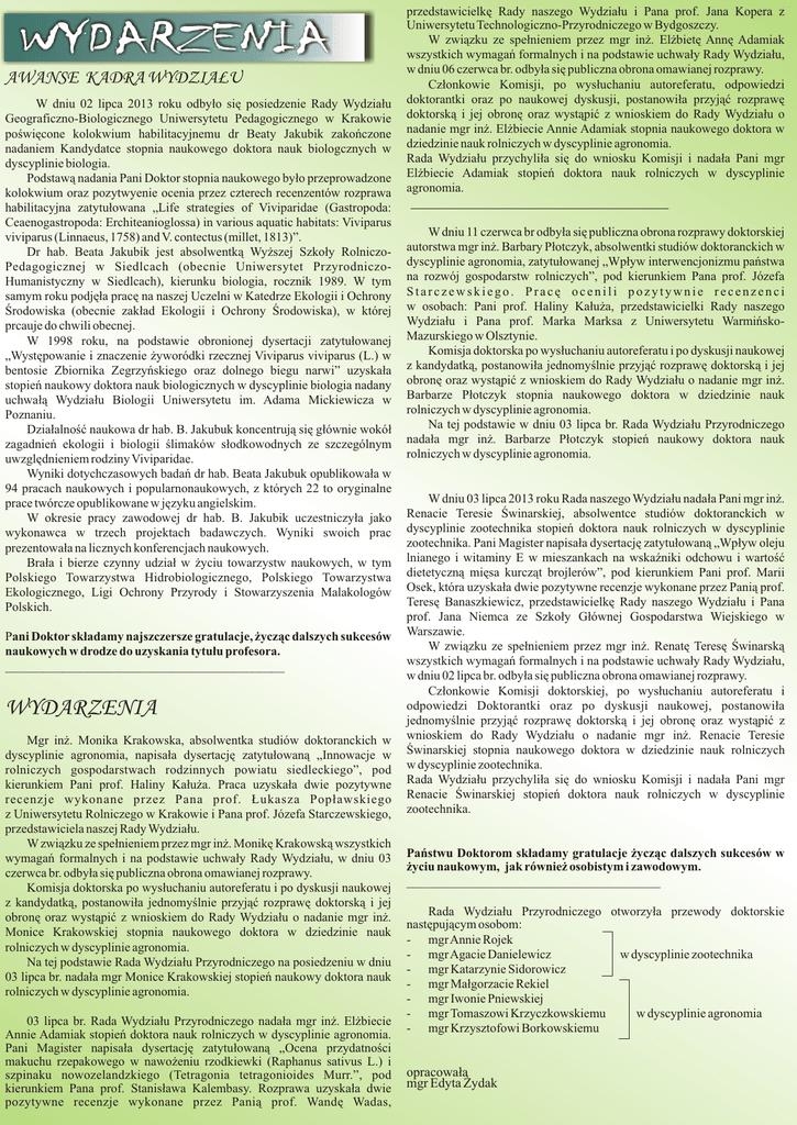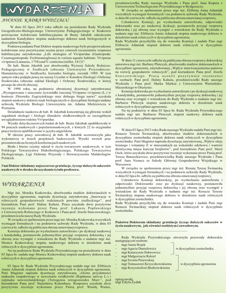 AWANSE KADRA WYDZIA£U W dniu 02 lipca 2013 roku odby³o siê posiedzenie Rady Wydzia³u Geograficzno-Biologicznego Uniwersytetu Pedagogicznego w Krakowie poœwiêcone kolokwium habilitacyjnemu dr Beaty Jakubik zakoñczone nadaniem Kandydatce stopnia naukowego doktora nauk biologcznych w dyscyplinie biologia. Podstaw¹ nadania Pani Doktor stopnia naukowego by³o przeprowadzone kolokwium oraz pozytwyenie ocenia przez czterech recenzentów rozprawa habilitacyjna zatytu³owana „Life strategies of Viviparidae (Gastropoda: Ceaenogastropoda: Erchiteanioglossa) in various aquatic habitats: Viviparus viviparus (Linnaeus, 1758) and V. contectus (millet, 1813)”. Dr hab. Beata Jakubik jest absolwentk¹ Wy¿szej Szko³y RolniczoPedagogicznej w Siedlcach (obecnie Uniwersytet PrzyrodniczoHumanistyczny w Siedlcach), kierunku biologia, rocznik 1989. W tym samym roku podjê³a pracê na naszej Uczelni w Katedrze Ekologii i Ochrony Œrodowiska (obecnie zak³ad Ekologii i Ochrony Œrodowiska), w której prcauje do chwili obecnej. W 1998 roku, na podstawie obronionej dysertacji zatytu³owanej „Wystêpowanie i znaczenie ¿yworódki rzecznej Viviparus viviparus (L.) w bentosie Zbiornika Zegrzyñskiego oraz dolnego biegu narwi” uzyska³a stopieñ naukowy doktora nauk biologicznych w dyscyplinie biologia nadany uchwa³¹ Wydzia³u Biologii Uniwersytetu im. Adama Mickiewicza w Poznaniu. Dzia³alnoœæ naukowa dr hab. B. Jakubuk koncentruj¹ siê g³ównie wokó³ zagadnieñ ekologii i biologii œlimaków s³odkowodnych ze szczególnym uwzglêdnieniem rodziny Viviparidae. Wyniki dotychczasowych badañ dr hab. Beata Jakubuk opublikowa³a w 94 pracach naukowych i popularnonaukowych, z których 22 to oryginalne prace twórcze opublikowane w jêzyku angielskim. W okresie pracy zawodowej dr hab. B. Jakubik uczestniczy³a jako wykonawca w trzech projektach badawczych. Wyniki swoich prac prezentowa³a na licznych konferencjach naukowych. Bra³a i bierze czynny udzia³ w ¿yciu towarzystw naukowych, w tym Polskiego Towarzystwa Hidrobiologicznego, Polskiego Towarzystwa Ekologicznego, Ligi Ochrony Przyrody i Stowarzyszenia Malakologów Polskich. Pani Doktor sk³adamy najszczersze gratulacje, ¿ycz¹c dalszych sukcesów naukowych w drodze do uzyskania tytu³u profesora. ____________________________________________ WYDARZENIA Mgr in¿. Monika Krakowska, absolwentka studiów doktoranckich w dyscyplinie agronomia, napisa³a dysertacjê zatytu³owan¹ „Innowacje w rolniczych gospodarstwach rodzinnych powiatu siedleckiego”, pod kierunkiem Pani prof. Haliny Ka³u¿a. Praca uzyska³a dwie pozytywne recenzje wykonane przez Pana prof. £ukasza Pop³awskiego z Uniwersytetu Rolniczego w Krakowie i Pana prof. Józefa Starczewskiego, przedstawiciela naszej Rady Wydzia³u. W zwi¹zku ze spe³nieniem przez mgr in¿. Monikê Krakowsk¹ wszystkich wymagañ formalnych i na podstawie uchwa³y Rady Wydzia³u, w dniu 03 czerwca br. odby³a siê publiczna obrona omawianej rozprawy. Komisja doktorska po wys³uchaniu autoreferatu i po dyskusji naukowej z kandydatk¹, postanowi³a jednomyœlnie przyj¹æ rozprawê doktorsk¹ i jej obronê oraz wyst¹piæ z wnioskiem do Rady Wydzia³u o nadanie mgr in¿. Monice Krakowskiej stopnia naukowego doktora w dziedzinie nauk rolniczych w dyscyplinie agronomia. Na tej podstawie Rada Wydzia³u Przyrodniczego na posiedzeniu w dniu 03 lipca br. nada³a mgr Monice Krakowskiej stopieñ naukowy doktora nauk rolniczych w dyscyplinie agronomia. 03 lipca br. Rada Wydzia³u Przyrodniczego nada³a mgr in¿. El¿biecie Annie Adamiak stopieñ doktora nauk rolniczych w dyscyplinie agronomia. Pani Magister napisa³a dysertacjê zatytu³owan¹ „Ocena przydatnoœci makuchu rzepakowego w nawo¿eniu rzodkiewki (Raphanus sativus L.) i szpinaku nowozelandzkiego (Tetragonia tetragonioides Murr.”, pod kierunkiem Pana prof. Stanis³awa Kalembasy. Rozprawa uzyska³a dwie pozytywne recenzje wykonane przez Pani¹ prof. Wandê Wadas, przedstawicielkê Rady naszego Wydzia³u i Pana prof. Jana Kopera z Uniwersytetu Technologiczno-Przyrodniczego w Bydgoszczy. W zwi¹zku ze spe³nieniem przez mgr in¿. El¿bietê Annê Adamiak wszystkich wymagañ formalnych i na podstawie uchwa³y Rady Wydzia³u, w dniu 06 czerwca br. odby³a siê publiczna obrona omawianej rozprawy. Cz³onkowie Komisji, po wys³uchaniu autoreferatu, odpowiedzi doktorantki oraz po naukowej dyskusji, postanowi³a przyj¹æ rozprawê doktorsk¹ i jej obronê oraz wyst¹piæ z wnioskiem do Rady Wydzia³u o nadanie mgr in¿. El¿biecie Annie Adamiak stopnia naukowego doktora w dziedzinie nauk rolniczych w dyscyplinie agronomia. Rada Wydzia³u przychyli³a siê do wniosku Komisji i nada³a Pani mgr El¿biecie Adamiak stopieñ doktora nauk rolniczych w dyscyplinie agronomia. W dniu 11 czerwca br odby³a siê publiczna obrona rozprawy doktorskiej autorstwa mgr in¿. Barbary P³otczyk, absolwentki studiów doktoranckich w dyscyplinie agronomia, zatytu³owanej „Wp³yw interwencjonizmu pañstwa na rozwój gospodarstw rolniczych”, pod kierunkiem Pana prof. Józefa Starczewskiego. Pracê ocenili pozytywnie recenzenci w osobach: Pani prof. Haliny Ka³u¿a, przedstawicielki Rady naszego Wydzia³u i Pana prof. Marka Marksa z Uniwersytetu WarmiñskoMazurskiego w Olsztynie. Komisja doktorska po wys³uchaniu autoreferatu i po dyskusji naukowej z kandydatk¹, postanowi³a jednomyœlnie przyj¹æ rozprawê doktorsk¹ i jej obronê oraz wyst¹piæ z wnioskiem do Rady Wydzia³u o nadanie mgr in¿. Barbarze P³otczyk stopnia naukowego doktora w dziedzinie nauk rolniczych w dyscyplinie agronomia. Na tej podstawie w dniu 03 lipca br. Rada Wydzia³u Przyrodniczego nada³a mgr in¿. Barbarze P³otczyk stopieñ naukowy doktora nauk rolniczych w dyscyplinie agronomia. W dniu 03 lipca 2013 roku Rada naszego Wydzia³u nada³a Pani mgr in¿. Renacie Teresie Œwinarskiej, absolwentce studiów doktoranckich w dyscyplinie zootechnika stopieñ doktora nauk rolniczych w dyscyplinie zootechn