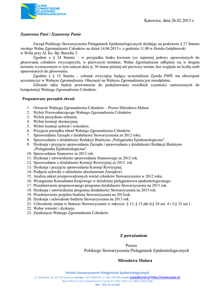 Katowice, dnia 26.02.2013 r. Szanowna Pani / Szanowny Panie Zarząd Polskiego Stowarzyszenia Pielęgniarek Epidemiologicznych działając na podstawie § 27 Statutu zwołuje Walne Zgromadzenie Członków na dzień 14.04.2013 r. o godzinie 11.00 w Hotelu Gołębiewski w Wiśle przy Al. Ks. Bp. Bursche 3. Zgodnie z § 24 Statutu – w przypadku braku kworum (co najmniej połowy uprawnionych do głosowania członków zwyczajnych), w pierwszym terminie, Walne Zgromadzenie odbędzie się w drugim terminie wyznaczonym w tym samym dniu tj; 30 minut później niż pierwszy termin, bez względu na liczbę osób uprawnionych do głosowania. Zgodnie z § 15 Statutu – członek zwyczajny będący uczestnikiem Zjazdu PSPE ma obowiązek uczestniczyć w Walnym Zgromadzeniu. Obecność na Walnym Zgromadzeniu jest nieodpłatna. Zebranie takie będzie prawomocne do podejmowania wszelkich czynności zastrzeżonych do kompetencji Walnego Zgromadzenia Członków. Proponowany porządek obrad: 1. 2. 3. 4. 5. 6. 7. 8. 9. 10. 11. 12. 13. 14. 15. 16. 17. 18. 19. 20. 21. 22. 23. Otwarcie Walnego Zgromadzenia Członków – Prezes Mirosława Malara Wybór Przewodniczącego Walnego Zgromadzenia Członków. Wybór prezydium zebrania. Wybór komisji skrutacyjnej. Wybór komisji uchwał i wniosków. Przyjęcie porządku obrad Walnego Zgromadzenia Członków. Sprawozdanie Zarządu z działalności Stowarzyszenia za 2012 roku. Sprawozdanie z działalności Redakcji Biuletynu „Pielęgniarka Epidemiologiczna”. Dyskusja i przyjęcie sprawozdania Zarządu i sprawozdania z działalności Redakcji Biuletynu „Pielęgniarka Epidemiologiczna”. Sprawozdanie finansowe za 2012 rok. Dyskusja i zatwierdzenie sprawozdania finansowego za 2012 rok. Sprawozdanie z działalności Komisji Rewizyjnej za 2012 rok Dyskusja i przyjęcie sprawozdania Komisji Rewizyjnej. Podjęcie uchwały o udzieleniu absolutorium Zarządowi. Analiza ankiet przeprowadzonych wśród członków Stowarzyszenia w 2012 roku. Wystąpienie Konsultanta Krajowego w dziedzinie pielęgniarstwa epidemiologicznego. Przedstawienie proponowanego programu działalności Stowarzyszenia na 2013 rok. Dyskusja i zatwierdzenie programu działalności Stowarzyszenia na 2013 rok. Przedstawienie projektu budżetu Stowarzyszenia na 2013rok. Dyskusja i uchwalenie budżetu Stowarzyszenia na 2013 rok. Uchwalenie zmian w Statucie Stowarzyszenia w zakresie: § 13, § 15 pkt d,§ 24 ust. 4 i 5,§ 32 ust.1. Wolne wnioski i dyskusja. Zamknięcie Walnego Zgromadzenia Członków. Z poważaniem Prezes Polskiego Stowarzyszenia Pielęgniarek Epidemiologicznych Mirosława Malara Polskie Stowarzyszenie Pielęgniarek Epidemiologicznych ul. Medyków 26, 40-752 Katowice tel./fax: 032-2088748, 0- 605 448 948, email: [email protected] http://www.pspe.pl Bank PKO S.A. I/O w Katowicach nr konta 47 1240 1330 1111 0010 1495 6109 NIP: 675-12-13-538