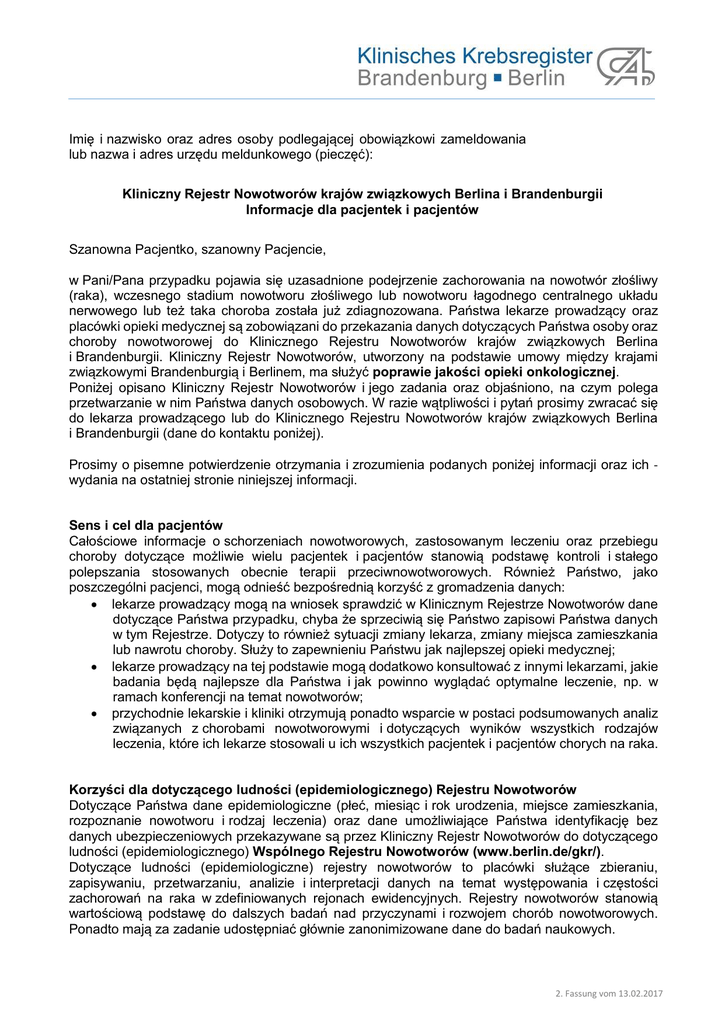 Imię i nazwisko oraz adres osoby podlegającej obowiązkowi zameldowania lub nazwa i adres urzędu meldunkowego (pieczęć): Kliniczny Rejestr Nowotworów krajów związkowych Berlina i Brandenburgii Informacje dla pacjentek i pacjentów Szanowna Pacjentko, szanowny Pacjencie, w Pani/Pana przypadku pojawia się uzasadnione podejrzenie zachorowania na nowotwór złośliwy (raka), wczesnego stadium nowotworu złośliwego lub nowotworu łagodnego centralnego układu nerwowego lub też taka choroba została już zdiagnozowana. Państwa lekarze prowadzący oraz placówki opieki medycznej są zobowiązani do przekazania danych dotyczących Państwa osoby oraz choroby nowotworowej do Klinicznego Rejestru Nowotworów krajów związkowych Berlina i Brandenburgii. Kliniczny Rejestr Nowotworów, utworzony na podstawie umowy między krajami związkowymi Brandenburgią i Berlinem, ma służyć poprawie jakości opieki onkologicznej. Poniżej opisano Kliniczny Rejestr Nowotworów i jego zadania oraz objaśniono, na czym polega przetwarzanie w nim Państwa danych osobowych. W razie wątpliwości i pytań prosimy zwracać się do lekarza prowadzącego lub do Klinicznego Rejestru Nowotworów krajów związkowych Berlina i Brandenburgii (dane do kontaktu poniżej). Prosimy o pisemne potwierdzenie otrzymania i zrozumienia podanych poniżej informacji oraz ich wydania na ostatniej stronie niniejszej informacji. Sens i cel dla pacjentów Całościowe informacje o schorzeniach nowotworowych, zastosowanym leczeniu oraz przebiegu choroby dotyczące możliwie wielu pacjentek i pacjentów stanowią podstawę kontroli i stałego polepszania stosowanych obecnie terapii przeciwnowotworowych. Również Państwo, jako poszczególni pacjenci, mogą odnieść bezpośrednią korzyść z gromadzenia danych: lekarze prowadzący mogą na wniosek sprawdzić w Klinicznym Rejestrze Nowotworów dane dotyczące Państwa przypadku, chyba że sprzeciwią się Państwo zapisowi Państwa danych w tym Rejestrze. Dotyczy to również sytuacji zmiany lekarza, zmiany miejsca zamieszkania lub nawrotu choroby. Służy to zapewnieniu Państwu jak najlepszej opieki medycznej; lekarze prowadzący na tej podstawie mogą dodatkowo konsultować z innymi lekarzami, jakie badania będą najlepsze dla Państwa i jak powinno wyglądać optymalne leczenie, np. w ramach konferencji na temat nowotworów; przychodnie lekarskie i kliniki otrzymują ponadto wsparcie w postaci podsumowanych analiz związanych z chorobami nowotworowymi i dotyczących wyników wszystkich rodzajów leczenia, które ich lekarze stosowali u ich wszystkich pacjentek i pacjentów chorych na raka. Korzyści dla dotyczącego ludności (epidemiologicznego) Rejestru Nowotworów Dotyczące Państwa dane epidemiologiczne (płeć, miesiąc i rok urodzenia, miejsce zamieszkania, rozpoznanie nowotworu i rodzaj leczenia) oraz dane umożliwiające Państwa identyfikację bez danych ubezpieczeniowych przekazywane są przez Kliniczny Rejestr Nowotworów do dotyczącego ludności (epidemiologicznego) Wspólnego Rejestru Nowotworów (www.berlin.de/gkr/). Dotyczące ludności (epidemiologiczne) rejestry nowotworów to placówki służące zbieraniu, zapisywaniu, przetwarzaniu, analizie i interpretacji danych na temat występowania i częstości zachorowań na raka w zdefiniowanych rejonach ewidencyjnych. Rejestry nowotworów stanowią wartościową podstawę do dalszych badań nad przyczynami i rozwojem chorób nowotworowych. Ponadto mają za zadanie udostępniać głównie zanonimizowane dane do badań naukowych. 2. Fassung vom 13.02.2017 Korzyści wynikające z badań naukowych Kliniczny Rejestr Nowotworów przekazuje bez Państwa zgody na wniosek wyłącznie dane zanonimizowane lub zaszyfrowane (pseudonimizowane) do przetwarzania na potrzeby konkretnych projektów badań w zakresie opieki medycznej. Jeżeli dany projekt badawczy można przeprowadzić wyłącznie z wykorzystaniem danych umożliwiających Państwa identyfikację, ponieważ np. trzeba przeprowadzić ankietę wśród pacjentów, muszą Państwo wyrazić przedtem pisemnie swoją zgodę. Dane przekazywane do Klinicznego Rejestru Nowotworów: Dane umożliwiające identyfikację Państwa osoby, w szczególności: nazwisko rodowe, imiona, wcześniejsze nazwiska; adres głównego miejsca zamieszkania; data urodzenia; płeć; dane dotyczące ubezpieczenia zdrowotnego lub ew. placówki pomocy; ważne dane medyczne dotyczące Państwa choroby nowotworowej, w szczególności: rodzaj i umiejscowienie nowotworu; data rozpoznania; sposób potwierdzenia rozpoznania; rodzaj, rozpoczęcie, czas trwania i wynik leczenia, łącznie ze skutkami ubocznymi; przebieg choroby. Ochrona danych osobowych Rejestr Nowotworów podlega surowym przepisom dotyczącym ochrony danych osobowych. Zakres, sposób zapisywania, korzystania, przekazywania i usuwania danych podlega rygorystycznym uregulowaniom prawnym i kontroli ze strony pełnomocnika ds. ochrony danych osobowych krajów związkowych Brandenburgia i Berlin. Przechowywanie i przetwarzanie wszystkich koniecznych danych dotyczących Państwa osoby odbywa się wyłącznie w ograniczonym pod względem technicznym i personalnym obszarze szczególnie zabezpieczonego Klinicznego Rejestru Nowotworów. Dostęp do Państwa danych osobowych mają tylko nieliczne, znane z imienia i nazwiska osoby, podlegające ścisłemu obowiązkowi zachowania tajemnicy. Na wszystkich dalszych etapach statystycznego przetwarzania danych nie wykorzystuje się danych umożliwiających Państwa identyfikację. Przekazywanie danych do Rejestru Nowotworów innych krajów związkowych, epidemiologicznego Wspólnego Rejestru Nowotworów1 lub placówek naukowych możliwe jest wyłącznie po spełnieniu określonych, kontrolowanych warunków. Prawo sprzeciwu Odnośnie zgłoszenia w Klinicznym Rejestrze Nowotworów Mogą Państwo sprzeciwić się zapisowi w Klinicznym Rejestrze Nowotworów Państwa danych medycznych pochodzących z jedneg