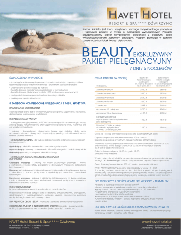 Każda kobieta jest inna, wyjątkowa, wymaga indywidualnego podejścia i fachowej porady. Z myślą o najbardziej wymagających Paniach przygotowaliśmy pakiet kompleksowej pielęgnacji z bogatym, ściśle wyselekcjonowanym zestawem zabiegów. Program pomaga w szybkim czasie odzyskać blask twarzy i piękno ciała. BEAUTYEKSKLUZYWNY PAKIET PIELĘGNACYJNY 7 DNI / 6 NOCLEGÓW ŚWIADCZENIA W PAKIECIE CENA PAKIETU ZA OSOBĘ SEZON NISKI Pakiet 6 noclegów z zabiegami 01.10-21.12 2012/2013 02.01-29.03.2013 SEZON ŚREDNI Pakiet 6 noclegów z zabiegami 01.09-30.09.2012/2013 02.04-21.06.2013* 2 osobowy atrium 2450 zł 2850 zł 2 osobowy standard 2550 zł 2970 zł 2 osobowy de luxe 2640 zł 3100 zł 2 osobowy family 3260 zł 3600 zł 1 osobowy 2999 zł 3660 zł Apartament 2 pokojowy 3700 zł 4140 zł ocena potrzeb skóry, dobór linii kosmetycznej i programu: ujędrnianie, nawilżanie, detoksykacja, regeneracja, rewitalizacja Apartament Lux 3 pokojowy 4100 zł 4600 zł 2 X PIELĘGNACJA TWARZY Osoba towarzysząca w pokoju standard z wyżywieniem (bez zabiegów) 1320 zł 1875 zł Dziecka 12-18 lat w pokoju standard z wyżywieniem + PAKIET ANTYTRĄDZIKOWY 1240 zł 1860 zł 6 noclegów w luksusowych pokojach i apartamentach (za dopłatą możliwa rezerwacja pokoju z widokiem na morze i prywatnym Jacuzzi na tarasie) urozmaicone posiłki w opcji do wyboru 2 posiłki dziennie (śniadanie i obiadokolacja w formie bufetu) 4 posiłki dziennie (zbilansowana dieta 1500 kcal w menu serwowanym) dostęp do Internetu w pokoju i na terenie całego obiektu parking oraz opłata klimatyczna 8 ZABIEGÓW KOMPLEKSOWEJ PIELĘGNACJI Z MENU HAVET SPA KONSULTACJA KOSMETYCZNA 1 zabieg innowacyjną metodą HI TECH Cosmecanique Lift - endermologia twarzy, zabieg dający natychmiastowy efekt ujędrnienia i poprawę owalu twarzy lub dla cer wrażliwych kawitacja 1 zabieg - kompleksowa pielęgnacja twarzy, szyi, dekoltu, okolic oczu w czterech etapach pielęgnacji: oczyszczający peeling, autorski masaż twarzy, maska, otulenie kremem 1 X KOSMETYKA CIAŁA - do wyboru zabieg na ciało o różnych właściwościach terapeutycznych: ujędrniający z ekstraktu żurawiny lub z owoców egzotycznych wyszczuplający - kawowy z minerałami z Morza Martwego lub czekoladowy relaks detoksykujący z solą morską oraz ekstraktami z alg 1 X RYTUAŁ NA CIAŁO Z PEELINGIEM I MASAŻEM (DO WYBORU) Orientalne marzenia - zabieg na bazie pudrowego peelingu i kremu z ekstraktem z kwiatu lotosu połączony z drenującym masażem pałeczkami bambusowymi Rodzaj pokoju Cena za 1 osobę przy rezerwacji pokoju dla 2 pełnopłatnych osób. Dopłata do pokoju z widokiem na morze 100 zł / doba Dopłata do pokoju z prywatnym Jacuzzi na tarasie 300 zł / doba *Pakiet nie obowiązuje podczas Wielkanocy. Do terminów Majówki 26.04-05.05.2013 oraz weekendu święta Bożego Ciała 29.05-02.06.2013 obowiązuje dopłata 50 zł/ doba/ osoba towarzyszaca Doba hotelowa od godz 14:00 do godz. 12:00. Zwierzęta mile widziane. W celu optymalizacji efektów proponujemy uzupełnienie programu o dodatkowe zabiegi: 3 x Endermologia - działa antycellulitowo, ujędrnia i wyszczupla ciało Cena 3 zabiegów w pakiecie: 300 zł/ 1 osoba (płatne dodatkowo) Kokosowy raj - zabieg na bazie peelingu na bazie piasku z Bora Bora oraz kremu z ekstraktem z kokosa, połączony z ujędrniającym masażem miseczkami kokosowymi PAKIET ANTYTRĄDZIKOWY polecany dla młodzieży w wieku 12-18 lat 2 x zabieg na twarz contra Acne lub Acti Mat w pięciu etapach pielęgnacji młodej cery z problemami trądzikowymi: peeling twarzy, maska z oczyszczających glinek, maska łagodząca i zamykająca pory, tonizacja, otulenie twarzy kremem. Egzotyczna wyprawa - zabieg o działaniu detoksykującym na bazie peelingu z solą z Himalajów oraz żelu z ekstraktami drzewnymi, połączony z masażem kamieniami z drzewa vacapu DO DYSPOZYCJI GOŚCI KOMPLEKS WODNO - TERMALNY: 2 X ENDERMOLOGIA (w przypadku przeciwwskazań wymiennie na masaż pleców) Podciśnieniowy masaż całego ciała o działaniu antycellulitowym, drenującym, ujędrniającym i wyszczuplającym, pozwala uzyskać rewelacyjną poprawę napięcia i wygładzenia skóry całego ciała SPA PIĘKNYCH DŁONI I STÓP - manicure i pedicure z malowaniem paznokci CODZIENNE ZAJĘCIA Z INSTRUKTOREM SPORTU (pon-sob) - poranny nordic walking, jogging na plaży, aqua aerobic (jeden typ zajęć do wyboru) HAVET Hotel Resort & Spa ul. Wyzwolenia 29, 78-131 Dźwirzyno, Polska Rezerwacja: +48 94 711 36 00 Dźwirzyno baseny o łącznej powierzchni ponad 300 m2 basen rekreacyjny z wyjątkowym systemem masaży podwodnych gorąca strefa jacuzzi z wanną hydromasującą na 15 stanowisk egzotyczna oranżeria z wygodnymi leżankami podgrzewane leżanki w strefie wellness sauny suche, łaźnia parowa, łaźnia kwiatowa Laconium „Komnata deszczu wrażeń” - deszcz tropikalny, arktyczny, bryza morska grota solna DO DYSPOZYCJI GOŚCI STUDIO KSZTAŁTOWANIA SYLWETKI Power Plate, orbitreki, bieżnia, rowery treningowe, atlas, profesjonalny przyrząd treningowy mięśni brzucha, piłki fitball www.havethotel.pl [email protected] Zapraszamy - zarezerwuj już dziś