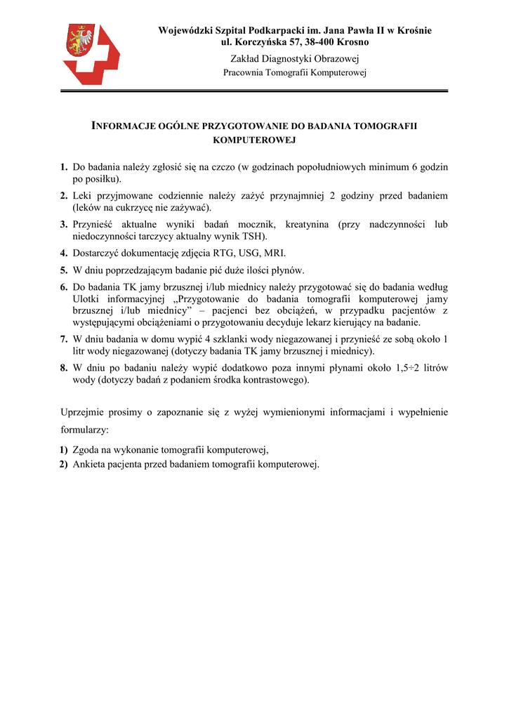 Wojewódzki Szpital Podkarpacki im. Jana Pawła II w Krośnie ul. Korczyńska 57, 38-400 Krosno Zakład Diagnostyki Obrazowej Pracownia Tomografii Komputerowej , INFORMACJE OGÓLNE PRZYGOTOWANIE DO BADANIA TOMOGRAFII KOMPUTEROWEJ 1. Do badania należy zgłosić się na czczo (w godzinach popołudniowych minimum 6 godzin po posiłku). 2. Leki przyjmowane codziennie należy zażyć przynajmniej 2 godziny przed badaniem (leków na cukrzycę nie zażywać). 3. Przynieść aktualne wyniki badań mocznik, kreatynina (przy nadczynności lub niedoczynności tarczycy aktualny wynik TSH). 4. Dostarczyć dokumentację zdjęcia RTG, USG, MRI. 5. W dniu poprzedzającym badanie pić duże ilości płynów. 6. Do badania TK jamy brzusznej i/lub miednicy należy przygotować się do badania według Ulotki informacyjnej „Przygotowanie do badania tomografii komputerowej jamy brzusznej i/lub miednicy” – pacjenci bez obciążeń, w przypadku pacjentów z występującymi obciążeniami o przygotowaniu decyduje lekarz kierujący na badanie. 7. W dniu badania w domu wypić 4 szklanki wody niegazowanej i przynieść ze sobą około 1 litr wody niegazowanej (dotyczy badania TK jamy brzusznej i miednicy). 8. W dniu po badaniu należy wypić dodatkowo poza innymi płynami około 1,5÷2 litrów wody (dotyczy badań z podaniem środka kontrastowego). Uprzejmie prosimy o zapoznanie się z wyżej wymienionymi informacjami i wypełnienie formularzy: 1) Zgoda na wykonanie tomografii komputerowej, 2) Ankieta pacjenta przed badaniem tomografii komputerowej.