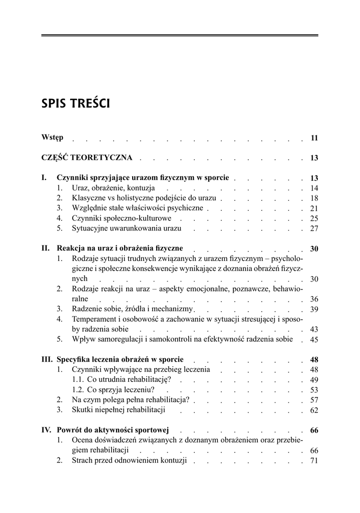 SPIS TREŚCI Wstęp . . . . . . . . . . . . . . 11 CZĘŚĆ . TEORETYCZNA . . . . . . . . . . . . . . . . . . 13 . . . . . . . . . . . . . . . . . . . . . . . . . . . . . . . . . . . . 13 14 18 21 25 27 II. Reakcja . . .na uraz . . i obrażenia . . . fizyczne . . . . . . . . . . . 1. Rodzaje sytuacji trudnych związanych z urazem fizycznym – psychologiczne i społeczne konsekwencje wynikające z doznania obrażeń fizycz. nych . . . . . . . . . . . . . . . . . . 2. Rodzaje reakcji na uraz – aspekty emocjonalne, poznawcze, behawio. ralne . . . . . . . . . . . . . . . . . . 3.. Radzenie . . . sobie, . źródła . . i mechanizmy . . . . . . . . . . . . 4. Temperament i osobowość a zachowanie w sytuacji stresującej i sposo. by . radzenia . . sobie . . . . . . . . . . . . . . . 5.. Wpływ samoregulacji i samokontroli na efektywność radzenia sobie . . . . . . . . . . . . . . . . . . 30 III. Specyfi . . ka . leczenia . . obrażeń . . w . sporcie . . . . 1.. Czynniki . . . wpływające . . . na .przebieg . . leczenia . . . 1.1. . .Co utrudnia . . .rehabilitację? . . . . . . . 1.2. . .Co sprzyja . . leczeniu? . . . . . . . 2.. Na . czym . . polega . .pełna . rehabilitacja? . . . . . 3.. Skutki niepełnej rehabilitacji . . . . . . . . . . . 48 48 49 53 57 62 I. . . . . . Czynniki . . . sprzyjające . . . urazom . . fizycznym . . . w sporcie . . 1.. Uraz, . . obrażenie, . . .kontuzja . . . . . . . 2.. Klasyczne . . . vs. holistyczne . . . podejście . . do. urazu . . 3.. Względnie . . . stałe . właściwości . . . .psychiczne . . . . 4.. Czynniki . . . społeczno-kulturowe . . . . . . . . . 5.. Sytuacyjne . . . uwarunkowania . . . . urazu . . . . . . . . . . . . . . . . . . . . . . . . . . . . . . . . . . . . . . . . . . . . . . . 30 36 39 43 45 IV. Powrót . . do . aktywności . . . sportowej . . . . . . . . . . . . . 66 1. Ocena doświadczeń związanych z doznanym obrażeniem oraz przebie. giem . . rehabilitacji . . . . . . . . . . . . . . . . 66 2.. Strach . . przed . .odnowieniem . . . kontuzji . . . . . . . . . . . 71 8 Sportowiec w sytuacji urazu fizycznego 3. . Zmiana jakości życia – negatywne konsekwencje i pozytywne efekty . . . . . . . . . . .związane . . z urazem . . fi.zycznym . . . EMPIRYCZNA . . . . . CZĘŚĆ . 75 . . badań . . . . . . . . . . . . . . . . . Opis 1. . .Ogólne . założenia . . . i cele . badań . . . . . . . . . . . . . .Problematyka . . . i hipotezy . . . . . . . . . . . . . . 2. 3. . .Charakterystyka . . . . badanej . . grupy . . . . . . . . . . . .4. .Zastosowane . . . metody . . . . . . . . . . . . . . . .4.1. . Wywiad . . „Uraz . fi. zyczny . .i jego . konsekwencje” . . . . Blecharza . . . . . . .4.2. . Skala . Percepcji . . .Urazu . w. Sporcie . . (SPUwS) . . Blecharza . . . . . . . .4.3. . Skala . Dynamiki . . . Emocji . .(SDE) . Blecharza . . . . . . . . . . .4.4. . Dyferencjał . . . Semantyczny . . . (DS) . . . . . . . . . . 4.5. Skala Wsparcia Społecznego w Sporcie (SWSS) Blecharza – zmo. . . dyfi.kowana . . wersja . SWS-8 . . Cieślaka . . . . . . . . . . 4.6. Formalna Charakterystyka Zachowania – Kwestionariusz Tempe. . . ramentu . . (FCZ-KT) . . Zawadzkiego . . . . i Strelaua . . . . . . . . . .4.7. . Inwentarz . . Osobowości . . . (NEO-FFI) . . . Costy . . i McCrae . . . . . . . .4.8. . Kwestionariusz . . . .Orientacji . . Życiowej . . .(SOC . 29) . Antonovsky’ego . . . . . . .4.9. . Skala . Kontroli . . Działania . . . (ACS-90) . . Kuhla . . . . . . . . . .4.10.. Inwentarz . . Stylów . . Radzenia . . Sobie . . (CISS) . . Endlera . . i Parkera . . . . 4.11. Skala Uogólnionej Własnej Skuteczności (GSES) Schwarzera, . . . Jerusalema . . .i Juczyńskiego . . . . . . . . . . . . . .5. .Procedura . . badań . . . . . . . . . . . . . . . 75 75 78 82 84 84 87 87 88 . . . .wyników . . . . . . . . . . . . . . . II. Prezentacja . .Analizy . .opisowe . . . . . . . . . . . . . . . 1. 1.1. Uraz fizyczny, obrażenia i doświadczenia związane z rehabilitacją . . . oraz. powrotem . . do . aktywności . . . sportowej . . . . . . . . . 1.2. Cechy temperamentu i osobowości oraz właściwości psychiczne . . . badanych . . zawodników . . . . . . . . . . . . . . 2. Percepcja urazu fizycznego w sporcie oraz dynamika emocji związa. .nych. z urazem . . i .rehabilitacją . . . . . . . . . . . . . . .2.1. . Percepcja . . urazu . . fizycznego . . w . sporcie . . . . . . . . . . . . 2.1.1. . Analiza . . czynnikowa . . . SPUwS . . . . . . . . . . . . . 2.1.2. . Analizy . . psychometryczne . . . . .SPUwS . . . . . . . . . . . 2.1.3. . Percepcja . . . urazu . w. sporcie . .– prezentacja . . . wyników . . . . . . .2.2. . Dynamika . . emocji . . związanych . . . z .urazem . i. rehabilitacją . . . . . . . . . 2.2.1. . Analiza . . czynnikowa . . . SDE . . . . . . . . . . . . . 2.2.2. . Analizy . . psychometryczne . . . . .SDE. . . . . . . . 95 95 I. . . . . . . . . . . . . 72 89 89 90 91 91 92 93 93 95 101 106 107 107 110 114 115 115 117 9 Spis treści . 3.. . . . 4.. . . . . 5.. 6.. . .2.2.3. . Dynamika . . . emocji . .– prezentacja . . . wyników . . . . . . . . . . . poziomu . . sportowego . . . po. kontuzji . . . . . . . . Wyznaczniki 3.1. Analizy korelacji i regresji dla wyznaczników psychologicznych . .oraz. dyferencjału . . . . . . . . . . . . . . . 3.2. Analizy kowariancji dla wyznaczników psychologicznych oraz dy. .ferencjału . . . . . . . . . . . . . . . . 3.3. . .Analizy . .dla .danych . z. wywiadu . . . . . . . . . . . Korelaty . . . percepcji . . urazu . .fizycznego . . w. sporcie . . . . . . . . . .Analizy . .dla .podskal . .SPUwS . . . . . . . . . . . 4.1. 4.1.1. Analizy korelacji dla wyznaczników psychologicznych oraz . . . dyferencjału . . . i .SDE. . . . . . . . . . . . .4.1.2. . Analizy . . dla . danych . . z wywiadu . . . . . . . . . . . .Analizy . .dla .wyników . . jakościowych . . . SPUwS . . . . . . . . 4.2. Psychologiczna . . . . charakterystyka . . . . percepcji . . . urazu . . . . . . . . . przypadk