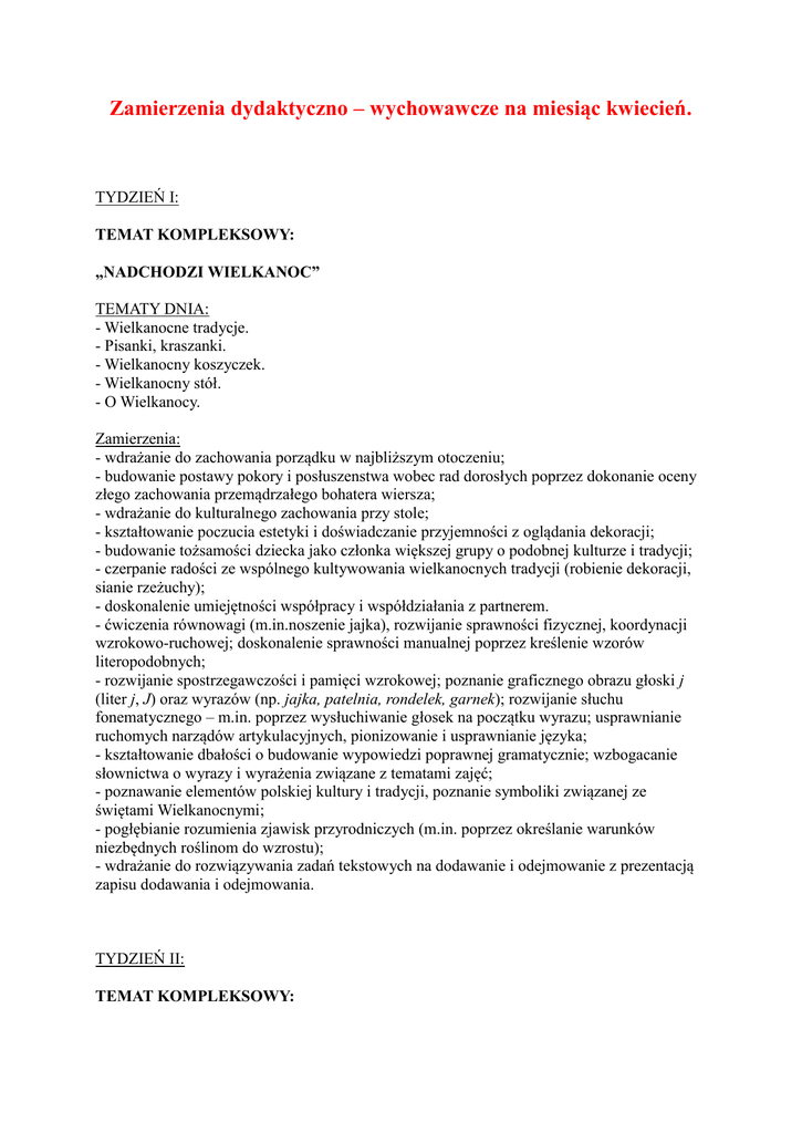 Zamierzenia dydaktyczno – wychowawcze na miesiąc kwiecień. TYDZIEŃ I: TEMAT KOMPLEKSOWY: „NADCHODZI WIELKANOC” TEMATY DNIA: - Wielkanocne tradycje. - Pisanki, kraszanki. - Wielkanocny koszyczek. - Wielkanocny stół. - O Wielkanocy. Zamierzenia: - wdrażanie do zachowania porządku w najbliższym otoczeniu; - budowanie postawy pokory i posłuszenstwa wobec rad dorosłych poprzez dokonanie oceny złego zachowania przemądrzałego bohatera wiersza; - wdrażanie do kulturalnego zachowania przy stole; - kształtowanie poczucia estetyki i doświadczanie przyjemności z oglądania dekoracji; - budowanie tożsamości dziecka jako członka większej grupy o podobnej kulturze i tradycji; - czerpanie radości ze wspólnego kultywowania wielkanocnych tradycji (robienie dekoracji, sianie rzeżuchy); - doskonalenie umiejętności współpracy i współdziałania z partnerem. - ćwiczenia równowagi (m.in.noszenie jajka), rozwijanie sprawności fizycznej, koordynacji wzrokowo-ruchowej; doskonalenie sprawności manualnej poprzez kreślenie wzorów literopodobnych; - rozwijanie spostrzegawczości i pamięci wzrokowej; poznanie graficznego obrazu głoski j (liter j, J) oraz wyrazów (np. jajka, patelnia, rondelek, garnek); rozwijanie słuchu fonematycznego – m.in. poprzez wysłuchiwanie głosek na początku wyrazu; usprawnianie ruchomych narządów artykulacyjnych, pionizowanie i usprawnianie języka; - kształtowanie dbałości o budowanie wypowiedzi poprawnej gramatycznie; wzbogacanie słownictwa o wyrazy i wyrażenia związane z tematami zajęć; - poznawanie elementów polskiej kultury i tradycji, poznanie symboliki związanej ze świętami Wielkanocnymi; - pogłębianie rozumienia zjawisk przyrodniczych (m.in. poprzez określanie warunków niezbędnych roślinom do wzrostu); - wdrażanie do rozwiązywania zadań tekstowych na dodawanie i odejmowanie z prezentacją zapisu dodawania i odejmowania. TYDZIEŃ II: TEMAT KOMPLEKSOWY: „DBAMY O ZDROWIE” TEMATY DNIA: - W zdrowym ciele, zdrowy duch. - Jemy to, co zdrowe. - Dbamy o czystość. - W gabinecie dentystycznym. - Chcemy być zdrowi. Zamierzenia: - rozwijanie wiary we własne umiejętności i pokonywanie nieśmiałości przed występem na forum grupy; - uczenie się relaksowania podczas zabawy relaksacyjnej; - budowanie postawy bycia pomocnym dla kolegów w codziennych sytuacjach; - kształtowanie postawy prozdrowotnej m.in. poprzez poznawanie zasad zdrowego stylu życia i wdrażanie do zdrowych nawyków; - pokonywanie lęku przed koniecznymi zabiegami dentystycznymi m.in. poprzez zrozumienie, dlaczego zabieg jest potrzebny i dokładne poznanie kolejnych czynności dentysty. - rozwijanie ogólnej sprawności i wytrzymałości fizycznej, ćwiczenie rzucania i łapania, kształtowanie świadomości ciała i umiejętności izolacji jego poszczególnych części, rozwijanie poczucia rytmu; - rozwijanie spostrzegawczości wzrokowej poprzez naukę łączenia w pary wzorów różniących się wielkością, odwzorowywanie układu barw na wzorze o innym rozmiarze; doskonalenie analizy i syntezy wzrokowej m.in. poprzez poznanie graficznego obrazu wyrazów (np. gimnastyka, toaleta, pokarmy); - rozwijanie pamięci słuchowej m.in. poprzez powtarzanie ciągów wyrazowych oraz analizy i syntezy słuchowej; - rozwijanie pojemności płuc, wdrażanie do zachowywania prawidłowego toru oddechowego, doskonalenie wymowy głoski sz; wzbogacanie słownictwa o związki frazeologiczne związane ze zdrowiem (m.in. zapaść na zdrowiu, tryskać zdrowiem), nazwy urządzeń w gabinecie lekarza (m.in. stetoskop, szpatułka, kozetka, waga), nazwy zębów (siekacze, kły, trzonowe); doskonalenie umiejętności używania nazw określających pory dnia i posiłki; - budowanie wiedzy o zdrowym stylu życia i mechanizmach służących zachowaniu zdrowia (dieta, produkty zawierające witaminy A, B, C i D, ćwiczenia, higiena osobista, profilaktyka dentystyczna); - rozwijanie logicznego myślenia, m.in. poprzez łączenie obrazków, przedmiotów w kategorie. TYDZIEŃ III: TEMAT KOMPLEKSOWY: „DBAMY O ZIEMIĘ, NASZĄ PLANETĘ” TEMATY DNIA: - Dbamy o środowisko. - Segregujemy odpady. - Korzystamy z ekologicznych opakowań. - Ziemia, nasza planeta. - Wiemy, jak dbać o środowisko. Zamierzenia: - kształtowanie postawy pracowitości m.in. poprzez sprzątanie sali, wykonywanie prac w ogródku przedszkolnym; - rozwijanie wrażliwości na świat przyrody, poczucia odpowiedzialności za naszą planetę; - wdrażanie do życia w grupie społecznej m.in. poprzez uczenie czerpania radości ze wspólnej zabawy, zgodnej współpracy przy wykonywaniu wspólnych dzieł i podczas zabaw grupowych, poszanowania pracy własnej i innych; - rozwijanie poczucia własnej wartości m.in. poprzez doświadczanie sprawstwa i twórczego działania podczas wytwarzania prac plastycznych, dzielenia się swoimi spostrzeżeniami; - kształtowanie postawy koleżeństwa, dzielenia się z innymi, wybaczania i zgodności, gotowości niesienia pomocy; - budowanie poczucia tożsamości indywidualnej i grupowej, poczucia bliskości z innymi ludźmi i przynależności do wspólnoty m.in. poprzez dzielenie się z innymi swoimi spostrzeżeniami i doświadczeniami. - rozwijanie równowagi, ogólnej sprawności fizycznej; doskonalenie sprawności manualnej m.in. poprzez swobodne prowadzenie linii do celu; rozróżnianie wartości rytmicznych, ćwiczenia w odczytywaniu zapisu tych wartości; - rozwijanie spostrzegawczości wzrokowej poprzez wskazywanie różnic między ilustracjami; poznanie graficznego obrazu wyrazów związanych z ekologią; rozwijanie koncentracji uwagi; wzbogacanie słownictwa (rozumienie określeń: przyroda, segregacja odpadów, torba ekologiczna, utrwalanie nazw dni tygodnia, używanie nazw kontynentów); - rozwijanie rozumienia zjawisk przyrodniczych i procesów technologicznych (recykling); - rozwijanie wyobraźni poprzez ukazanie możliwości wykorzystania odpadów (kubków po jogurcie