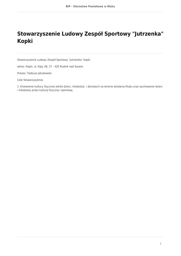 BIP - Starostwo Powiatowe w Nisku Stowarzyszenie Ludowy Zespół Sportowy "Jutrzenka" Kopki Stowarzyszenie Ludowy Zespół Sportowy "Jutrzenka" Kopki adres: Kopki, ul. Kąty 28, 37 - 420 Rudnik nad Sanem Prezes: Tadeusz Jakubowski Cele Stowarzyszenia: 1. Krzewienie kultury fizycznej wśród dzieci, młodzieży i dorosłych na terenie działania Klubu oraz wychowanie dzieci i młodzieży przez kulturę fizyczną i sportową. 1