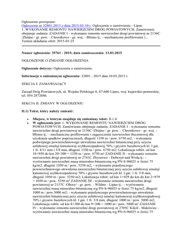 Ogłoszenie powiązane: Ogłoszenie nr 32801-2015 z dnia 2015-03-10 r. Ogłoszenie o zamówieniu - Lipno 1. WYKONANIE REMONTU NAWIERZCHNI DRÓG POWIATOWYCH. Zamówienie obejmuje zadania: ZADANIE I - wykonanie remontu nawierzchni drogi powiatowej nr 2136C /Zbójno / gr. pow. - Chrostkowo - gr. woj. - Blinno tj.: - mechaniczne profilowanie i... Termin składania ofert: 2015-03-25 Numer ogłoszenia: 35761 - 2015; data zamieszczenia: 13.03.2015 OGŁOSZENIE O ZMIANIE OGŁOSZENIA Ogłoszenie dotyczy: Ogłoszenia o zamówieniu. Informacje o zmienianym ogłoszeniu: 32801 - 2015 data 10.03.2015 r. SEKCJA I: ZAMAWIAJĄCY Zarząd Dróg Powiatowych, ul. Wojska Polskiego 8, 87-600 Lipno, woj. kujawsko-pomorskie, tel. 054 2872046. SEKCJA II: ZMIANY W OGŁOSZENIU II.1) Tekst, który należy zmienić: Miejsce, w którym znajduje się zmieniany tekst: II.1.4. W ogłoszeniu jest: 1. WYKONANIE REMONTU NAWIERZCHNI DRÓG POWIATOWYCH. Zamówienie obejmuje zadania: ZADANIE I - wykonanie remontu nawierzchni drogi powiatowej nr 2136C /Zbójno / gr. pow. - Chrostkowo - gr. woj. Blinno tj.: - mechaniczne profilowanie i zagęszczenie nawierzchni tłuczniowej dla uzyskania spadków poprzecznych, długość 1350 m / pow. 6750 m2; - wykonanie podwójnego powierzchniowego utrwalenia nawierzchni bitumicznej przy użyciu asfaltowej emulsji kationowej szybkorozpadowej 70% i grysów bazaltowych kl. I gat. 1 fr. 8/11 mm i 5/8 mm, długość 1350 m / pow. 6750 m2; Lokalizacja robót: od km 18+950 do km 20+300 = 1350 m / pow. 6750 m² ZADANIE II - wykonanie remontu nawierzchni drogi powiatowej nr 2741C Zbyszewo - Dobrzyń nad Wisłą tj.: wyrównanie nawierzchni masą mineralno-bitumiczną wg PN-S-96025 w ilości 75 kg/m2, długość 1050 m / pow. 5250 m2; - wykonanie pojedynczego powierzchniowego utrwalenia nawierzchni bitumicznej przy użyciu asfaltowej emulsji kationowej szybkorozpadowej 70% i grysów bazaltowych kl. I gat. 1 fr. 5/8 mm, długość 1050 m / pow. 5250 m2; Lokalizacja robót: od km 1+929 do km do km 2+979 = 1050 m / pow. 5250 m² ZADANIE III - wykonanie remontu nawierzchni drogi powiatowej nr 2137C /Obory/ - gr. pow. - Wildno - Lipno tj.: - wyrównanie nawierzchni masą mineralno-bitumiczną wg PN-S-96025 w ilości 75 kg/m2, długość 1000 m / pow.5000 m2; - wykonanie pojedynczego powierzchniowego utrwalenia nawierzchni bitumicznej przy użyciu asfaltowej emulsji kationowej szybkorozpadowej 70% i grysów bazaltowych kl. I gat. 1 fr. 5/8 mm, długość 1000 m / pow. 5000 m2; Lokalizacja robót: od km 8+300 do km 9+300 = 1000 m / pow. 5000 m² ZADANIE IV - wykonanie remontu nawierzchni drogi powiatowej nr 2705C Kikół - Makówiec wyrównanie nawierzchni masą mineralno-bitumiczną wg PN-S-96025 w ilości 75 kg/m2, długość 500m / pow. 2500 m2; - wykonanie pojedynczego powierzchniowego utrwalenia nawierzchni bitumicznej przy użyciu asfaltowej emulsji kationowej szybkorozpadowej 70% i grysów bazaltowych kl. I gat. 1 fr. 5/8 mm, długość 500 m / pow. 2500 m2; Lokalizacja robót: od km 5+093 do km 5+593 = 500 m / pow. 2500 m² ZADANIE V - wykonanie remontu nawierzchni drogi powiatowej nr 2711C Lipno Brzeźno - Gnojno tj.: - wyrównanie nawierzchni masą mineralno-bitumiczną wg PNS-96025 w ilości 75 kg/m2, długość 1000 m / pow. 5000 m2; - wykonanie pojedynczego powierzchniowego utrwalenia nawierzchni bitumicznej przy użyciu asfaltowej emulsji kationowej szybkorozpadowej 70% i grysów bazaltowych kl. I gat. 1 fr. 5/8 mm, dług. 1000 m / pow. 5000 m2; Lokalizacja robót: od km 4+460 do km 5+460 = 1000 m / pow. 5000 m² ZADANIE VI - wykonanie remontu nawierzchni drogi powiatowej nr 2734C Marianki - Małomin - Kamień Kmiecy - Tłuchowo tj.: wyrównanie nawierzchni masą mineralno-bitumiczną wg PN-S-96025 w ilości 75 kg/m2, długość 1000 m / pow. 5000 m2; - wykonanie pojedynczego powierzchniowego utrwalenia nawierzchni bitumicznej przy użyciu asfaltowej emulsji kationowej szybkorozpadowej 70% i grysów bazaltowych kl. I gat. 1 fr. 5/8 mm, dług. 1000 m / pow. 5000 m2; Lokalizacja robót: od km 6+032 do km 7+032 = 1000 m / pow. 5000 m². W ogłoszeniu powinno być: 1. WYKONANIE REMONTU NAWIERZCHNI DRÓG POWIATOWYCH. Zamówienie obejmuje zadania: ZADANIE I - wykonanie remontu nawierzchni drogi powiatowej nr 2136C /Zbójno / gr. pow. - Chrostkowo - gr. woj. Blinno tj.: - mechaniczne profilowanie i zagęszczenie nawierzchni tłuczniowej dla uzyskania spadków poprzecznych, długość 1350 m / pow. 6750 m2; - wykonanie podwójnego powierzchniowego utrwalenia nawierzchni bitumicznej przy użyciu asfaltowej emulsji kationowej szybkorozpadowej 70% i kruszywa naturalnego lub sztucznego stosowanego do powierzchniowych utrwaleń fr. 8/11 mm i 5/8 mm, długość 1350 m / pow. 6750 m2; Lokalizacja robót: od km 18+950 do km 20+300 = 1350 m / pow. 6750 m² ZADANIE II - wykonanie remontu nawierzchni drogi powiatowej nr 2741C Zbyszewo - Dobrzyń nad Wisłą tj.: - wyrównanie nawierzchni masą mineralno-bitumiczną wg PN-S-96025 w ilości 75 kg/m2, długość 1050 m / pow. 5250 m2; - wykonanie pojedynczego powierzchniowego utrwalenia nawierzchni bitumicznej przy użyciu asfaltowej emulsji kationowej szybkorozpadowej 70% i kruszywa naturalnego lub sztucznego stosowanego do powierzchniowych utrwaleń fr. 5/8 mm, długość 1050 m / pow. 5250 m2; Lokalizacja robót: od km 1+929 do km do km 2+979 = 1050 m / pow. 5250 m² ZADANIE III - wykonanie remontu nawierzchni drogi powiatowej nr 2137C /Obory/ - gr. pow. - Wildno - Lipno tj.: - wyrównanie nawierzchni masą mineralno-bitumiczną wg PN-S-96025 w ilości 75 kg/m2, długość 1000 m / pow.5000 m2; - wykonanie pojedynczego powierzchniowego utrwalenia nawierzchni bitumicznej przy użyciu asfaltowej emulsji kationowej szybkorozpadowej 70% i kruszywa naturalnego lub sztucznego stosowanego do powierzchniowych utrwaleń fr. 5/8 mm, długość 1000 m / pow. 5000 m2; Lokalizacja robót: od km 8+300 do km 9+300 = 1000 m / pow. 5000 m² ZADANIE IV - wykonanie remontu nawierzchni